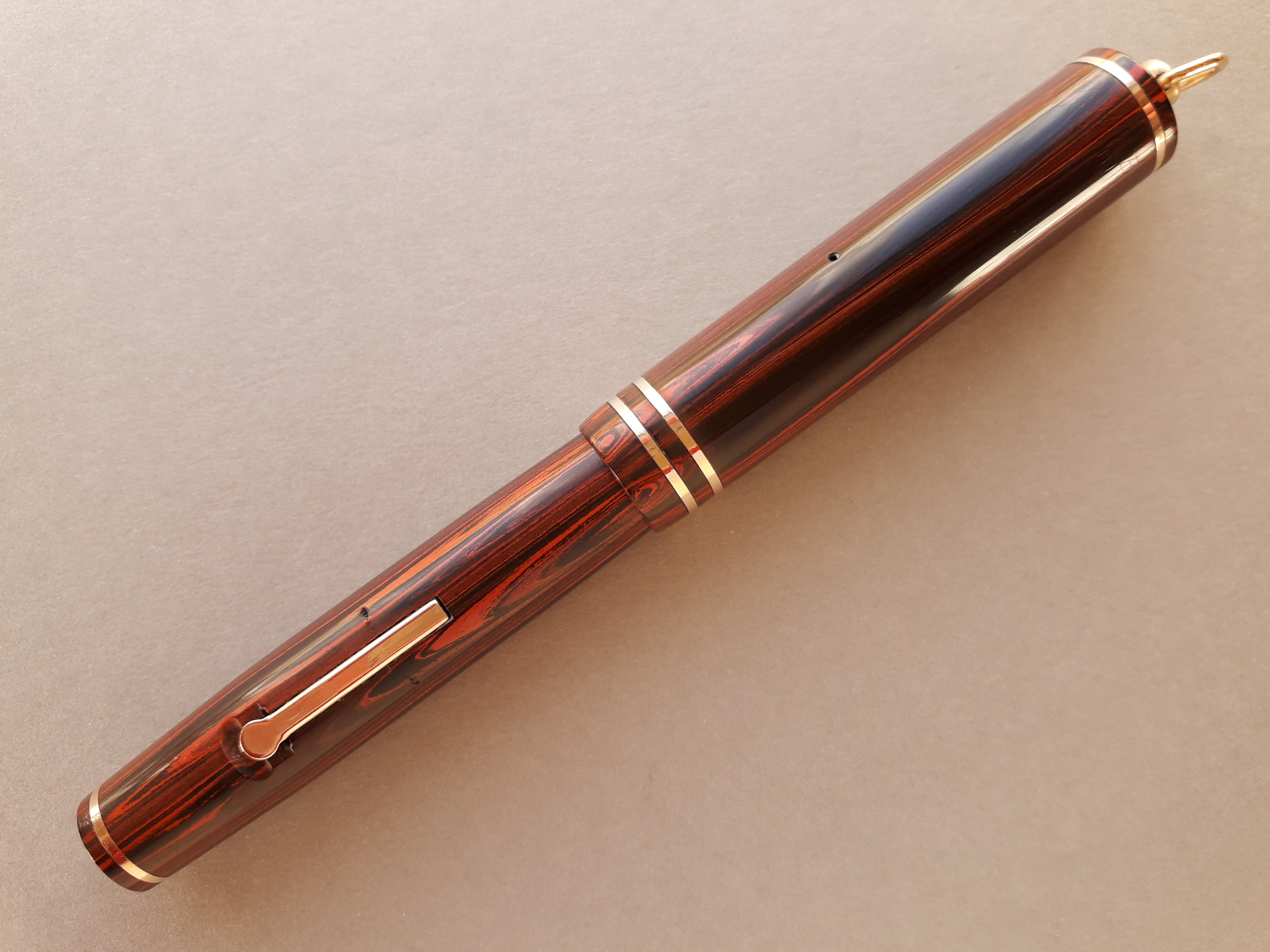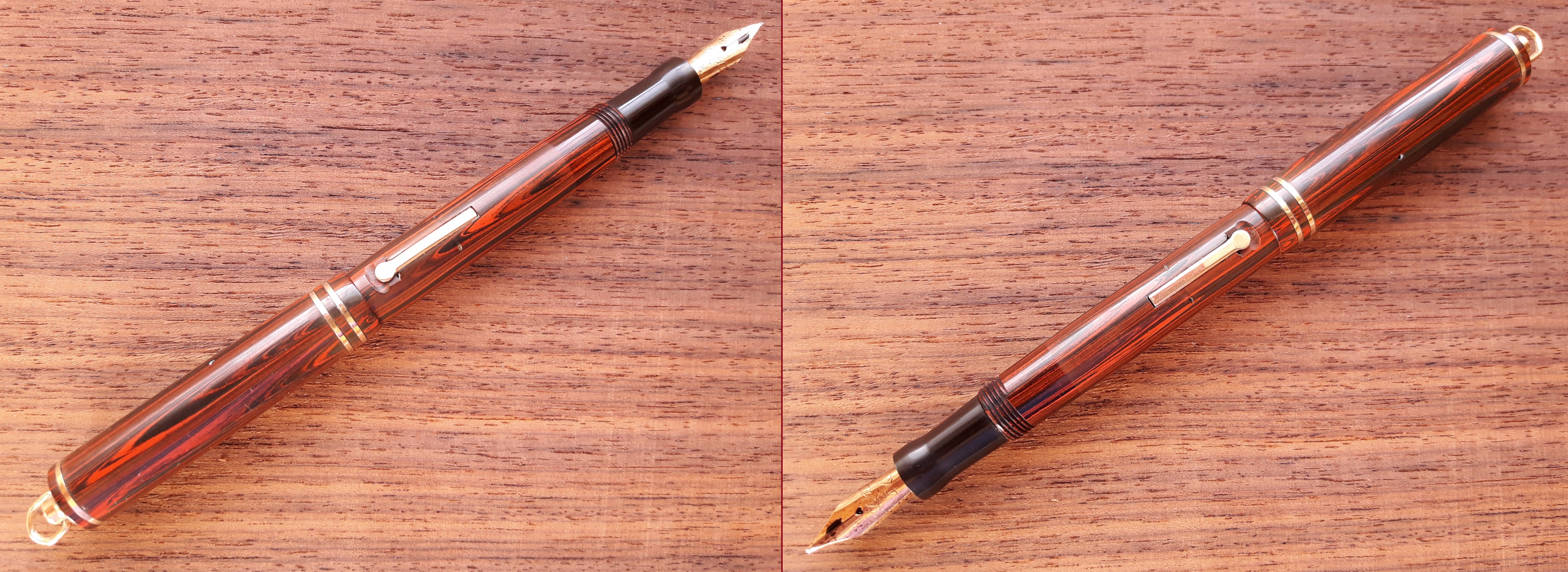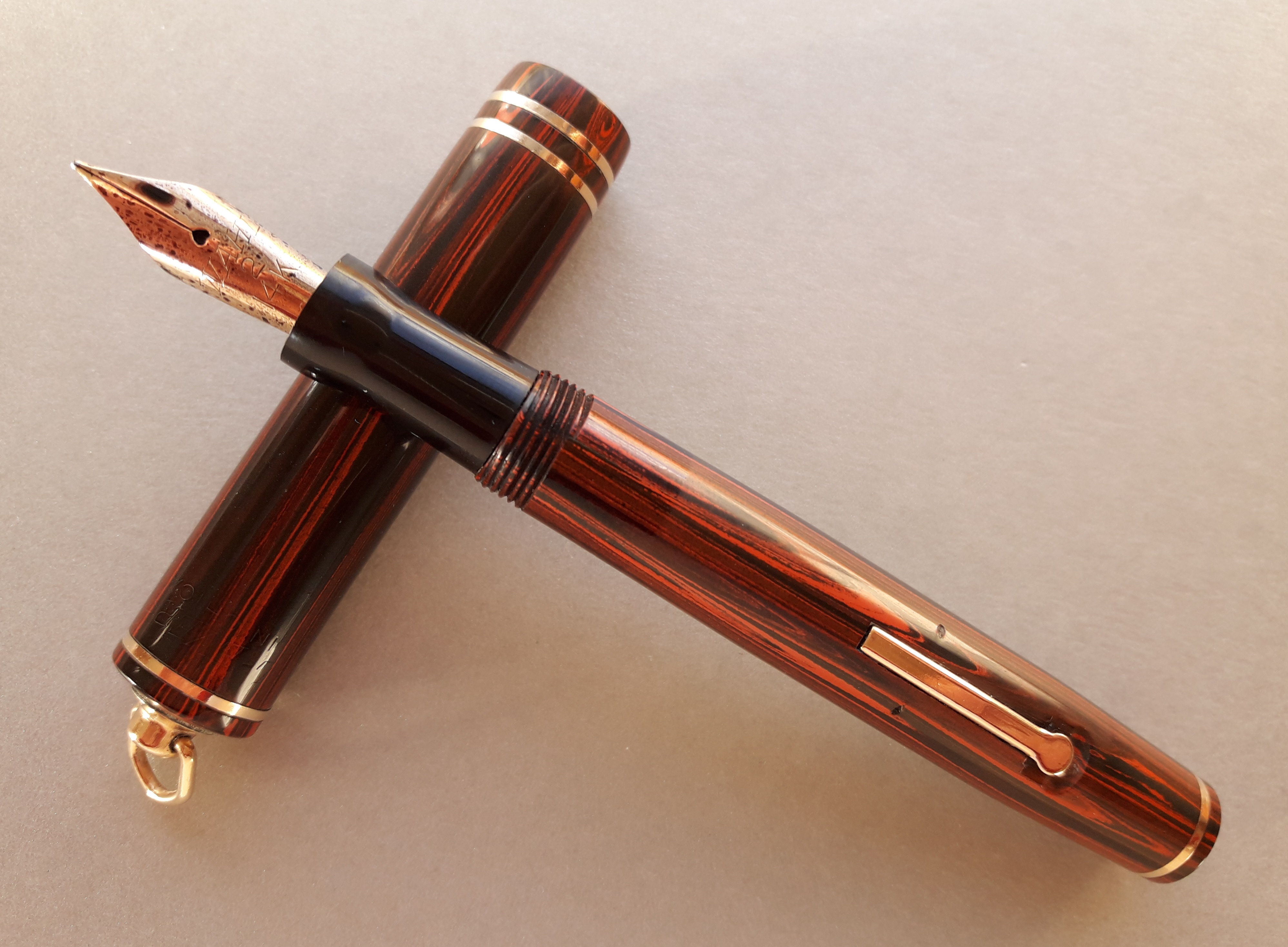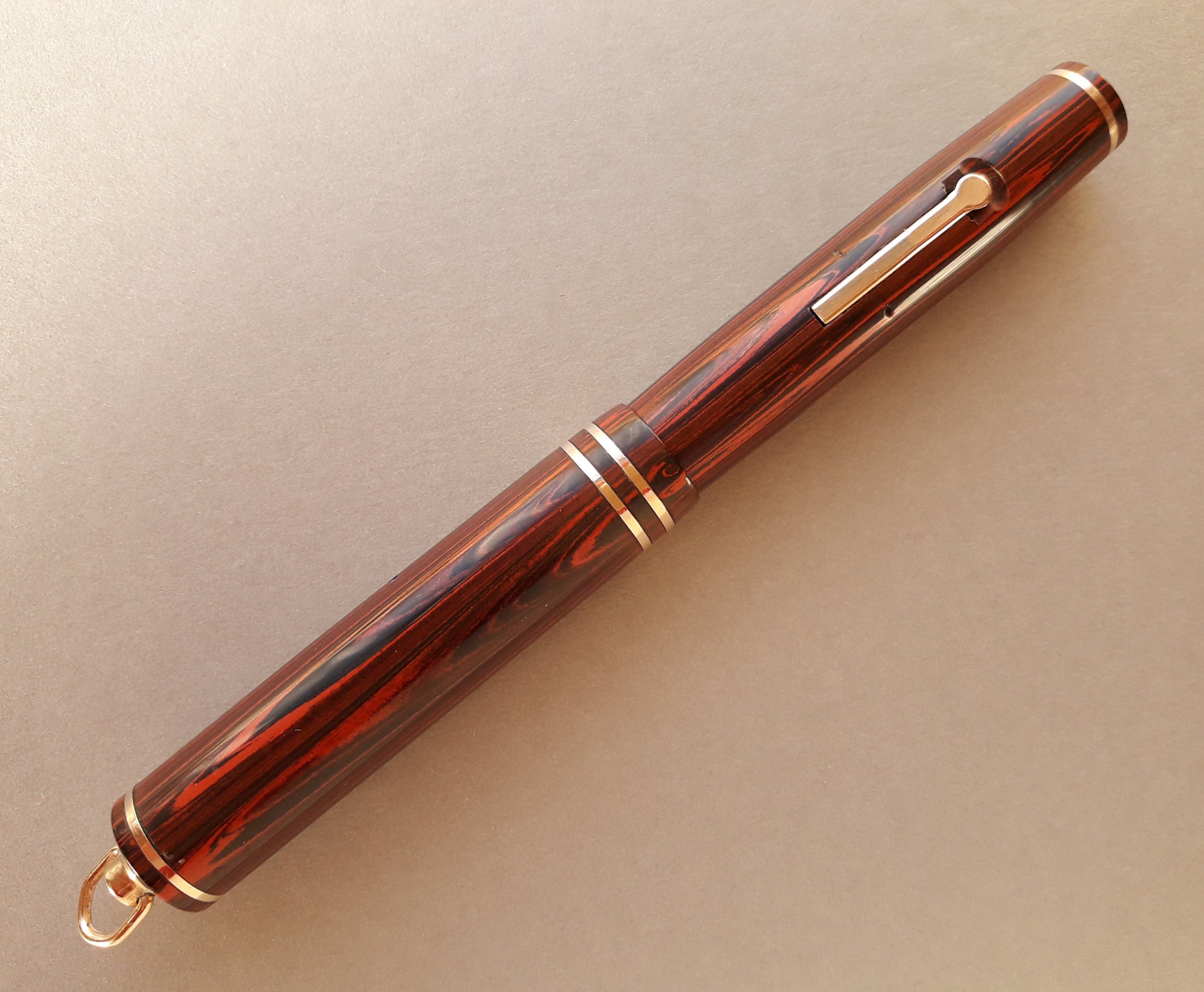 Per comodità di classificazione (e soprattutto in mancanza di un criterio più stringente di quello, improponibile, della mera enumerazione di centinaia di codici-prodotto, comprese le varianti per i telegrammi! :? , a cui costringerebbe la politica commerciale di quel periodo della Wahl Company), si definisce sommariamente il modello della penna in presentazione come “Signature” (firma): come riportato dal Wiki nel capitolo ad essa dedicato https://www.fountainpen.it/Signature, i collezionisti tendono a ricomprendere in questa necessariamente arbitraria categoria le penne in stile flat top della Casa dalla prima metà degli anni Venti (1923, solo in ebanite fino al 1927 e poi anche in celluloide) fino alla seconda metà del 1928 circa, quando vennero immesse sul mercato le penne con il (blocco-)pennino “a scelta del cliente” (“Personal Point”, avvitabile) e con garanzia “Gold Seal”.
