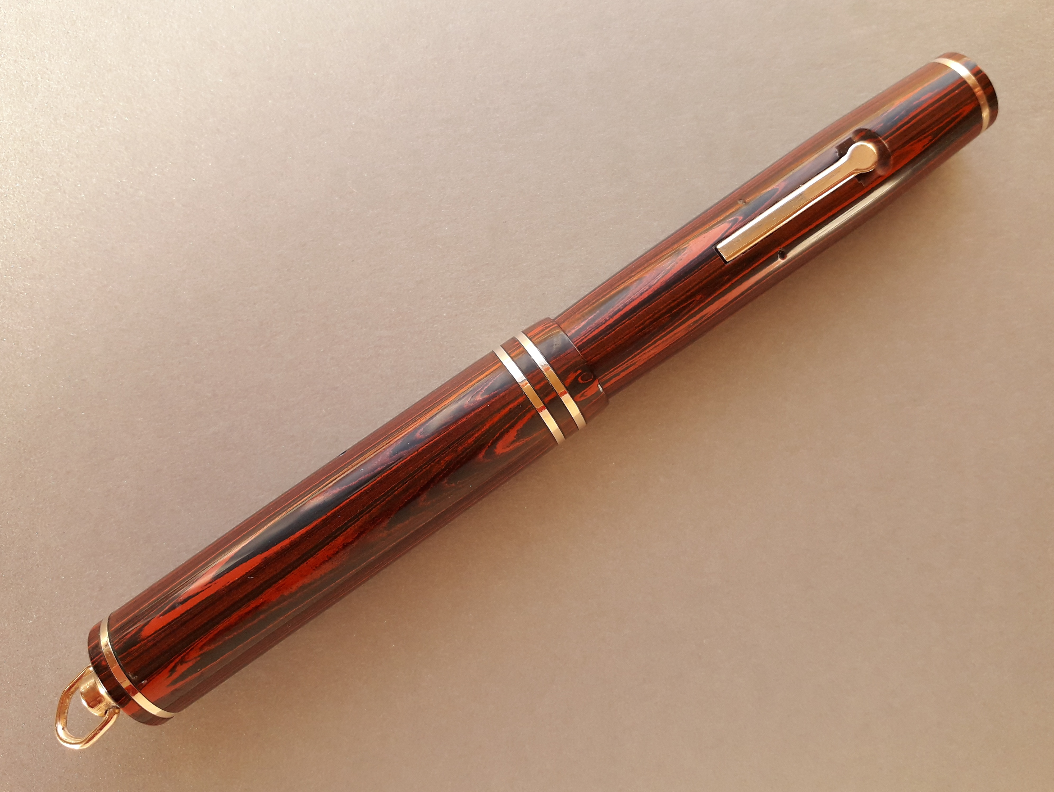Rosewood è il nome commerciale che la Wahl-Eversharp diede alla sua ebanite rossa&nera di tipo woodgrain (che riproduce le “venature del legno”) introdotta nel 1926: ecco un’immagine ripresa sopra un campione di legno di palissandro (“bois de rose”, legno di rosa), di provenienza africana, non ancora trattato.