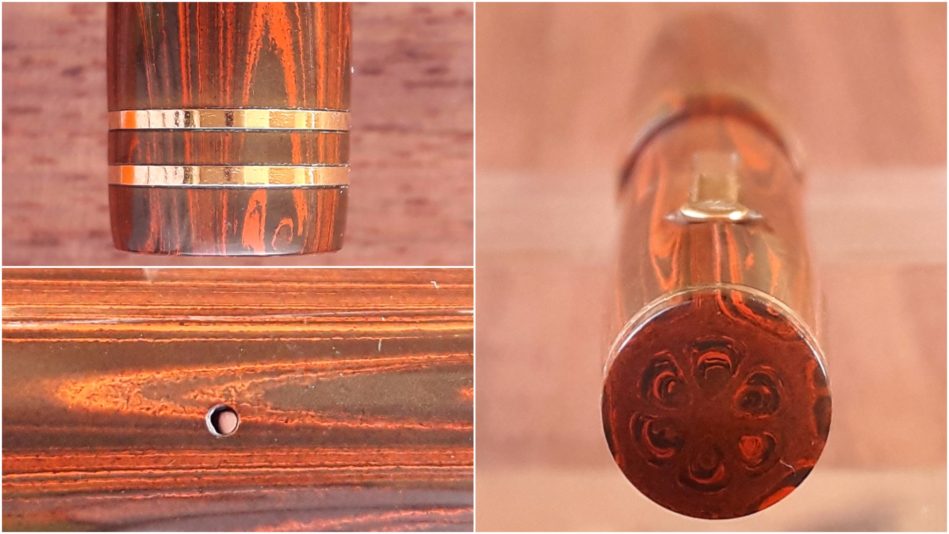 Curiosamente per un materiale denominato “legno di rosa”, sul fondello cieco la gomma miscelata vulcanizzata (hard rubber) è riuscita a disegnare…i petali di un fiore! :angel: