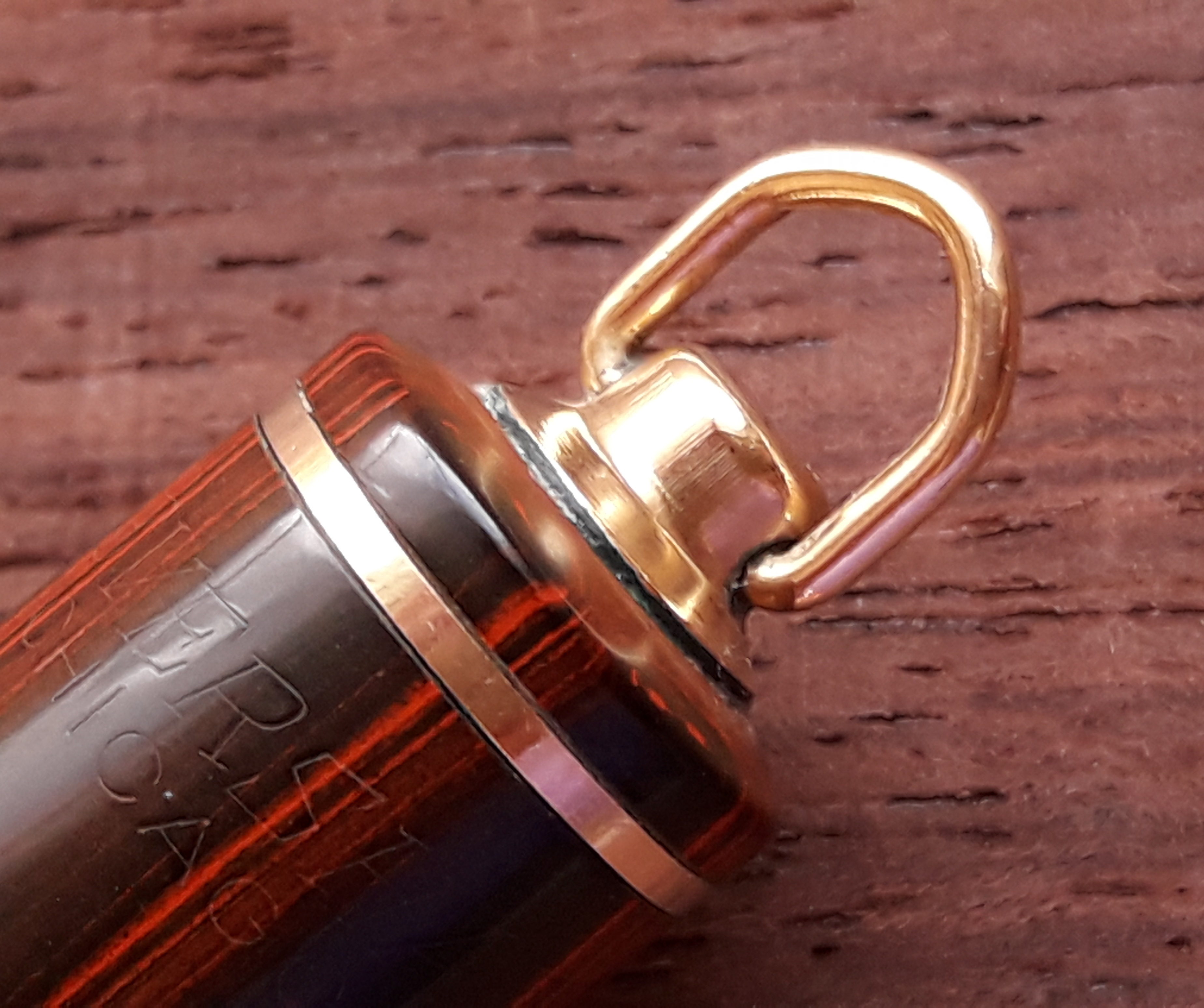 Per poter proporre una datazione attendibile della penna oggetto della recensione vorrei partire dall’iscrizione principale del Produttore, posta sul cappuccio appena al di sotto dell’anellino superiore. Trattandosi di un’iscrizione che, in modo assai poco comune, si dispone tutt’intorno alla circonferenza di un cappuccio cilindrico, venendo ad impegnarne ben oltre la metà, si è reso necessario scattare tre fotografie per poi ritagliarle ed affiancarle.