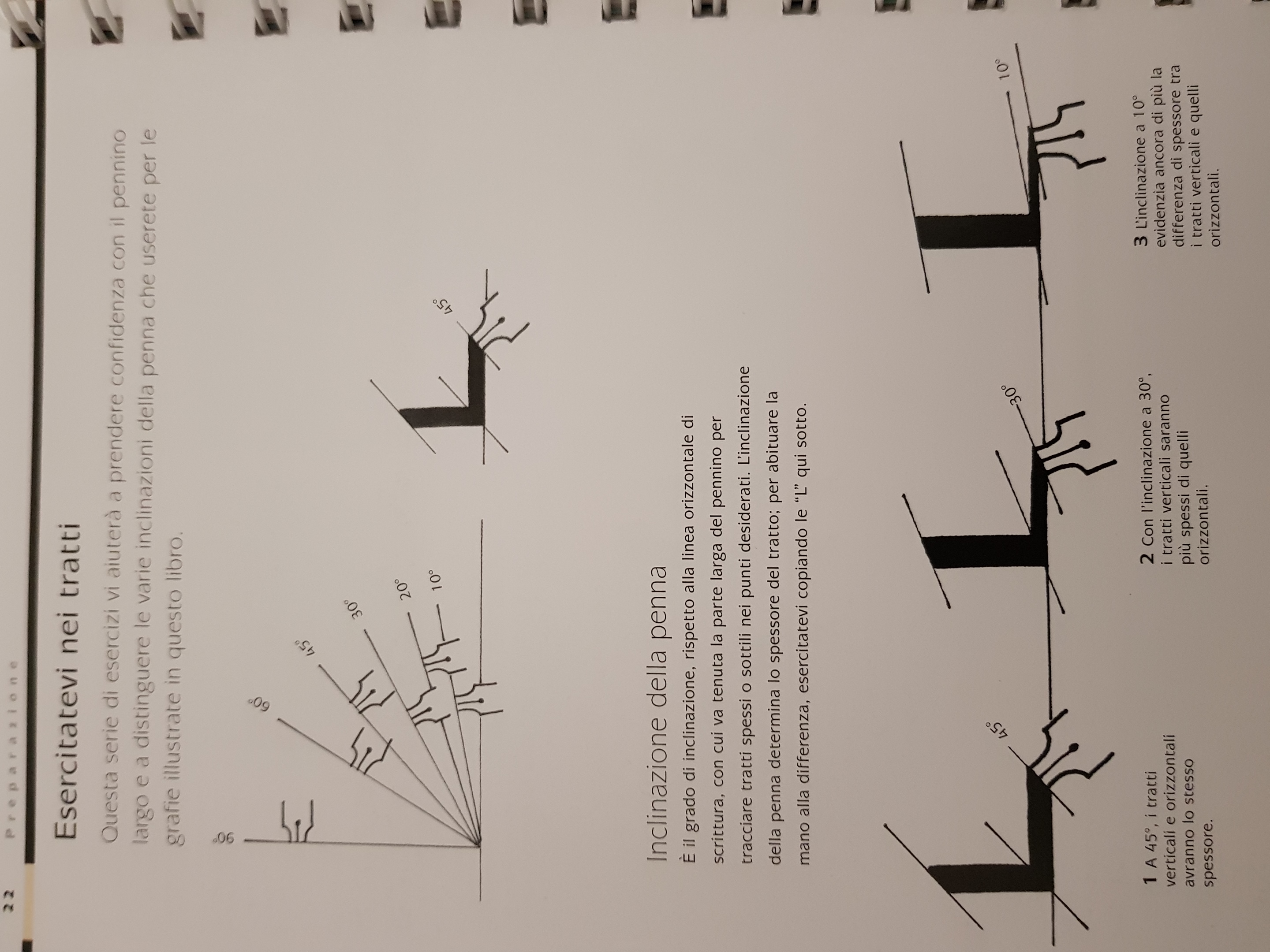 Nel primo capitolo relativo alla “Preparazione”, vengono descritti gli strumenti utili all’arte della calligrafia, come tracciare le linee, come usare la penna e gli altri strumenti e quali siano le posizioni e le luci più favorevoli per svolgere gli esercizi proposti a fine capitolo e nel successivo.