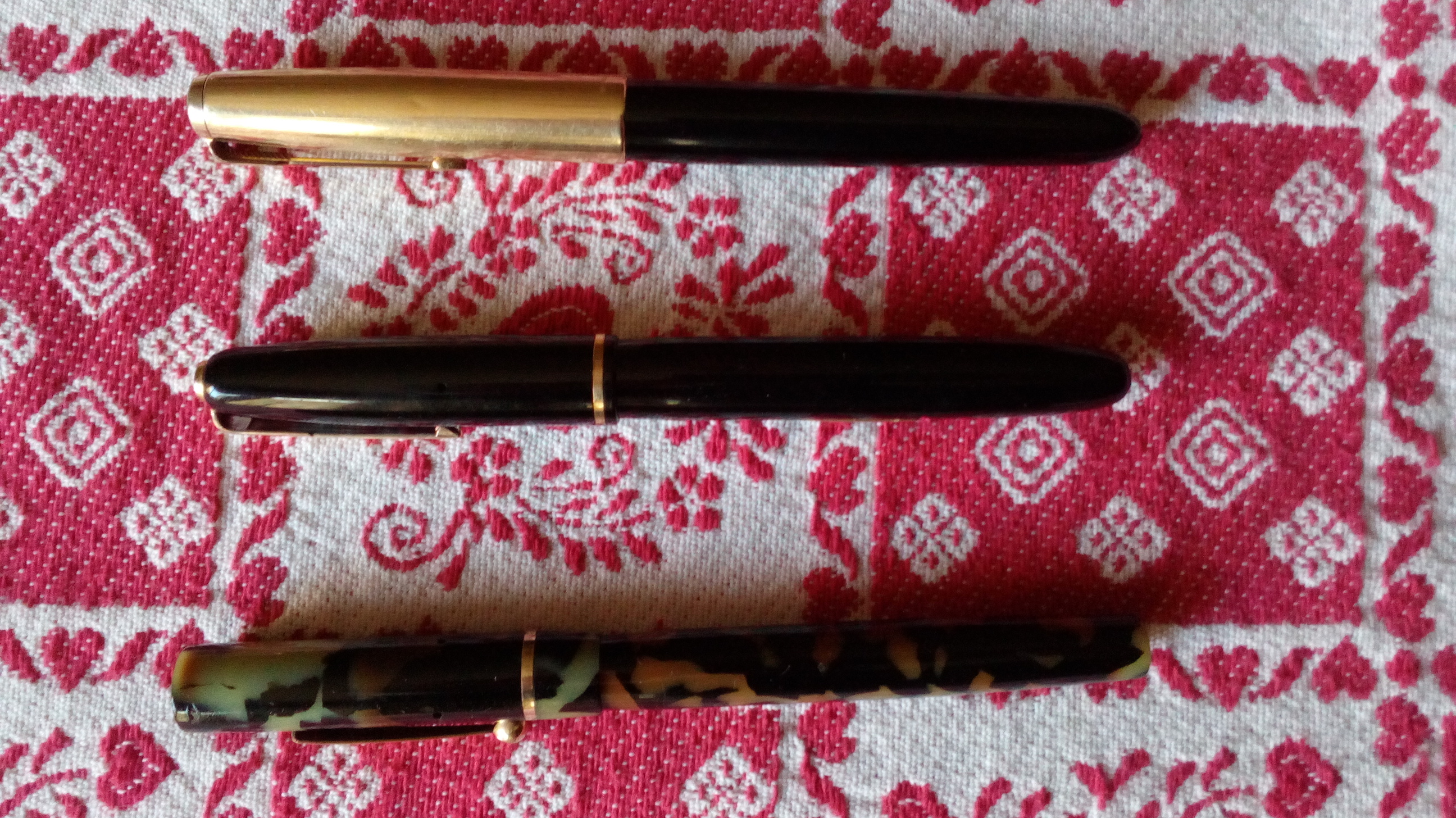 Piccoli autoregali di Natale: classica Parker 51 in buono stato; Waterman 502 con sacco inchiostro sostituito, pennino originale; Mabie Todd Swan, funzionante (anni 20/30), celluloide virata, il pennino originale è super flessibile.
