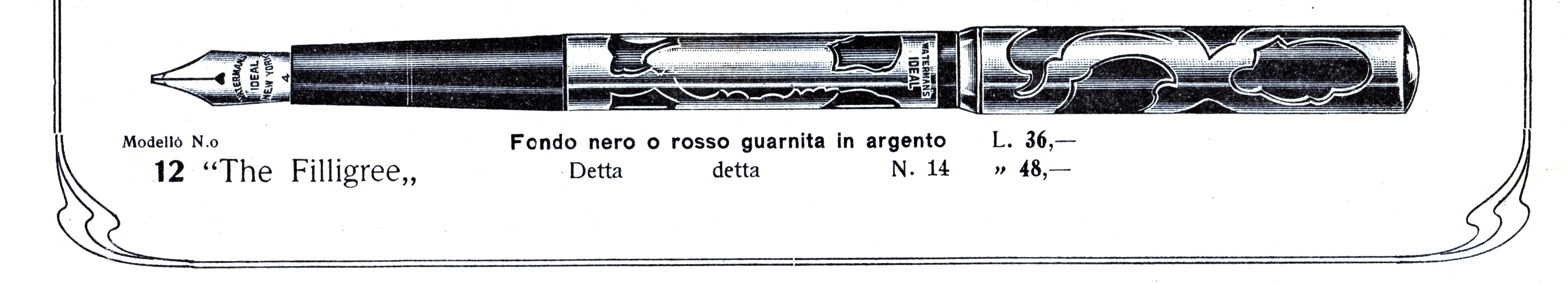 In casa Waterman il nome Filigree venne quindi ad indicare nel corso degli anni sempre la stessa lavorazione, applicata però a non meno di una mezza dozzina di soggetti differenti (molti di più se si considerano le varianti imposte dalle penne di dimensioni inferiori, 52½ e 52½V, e da quelle con sistemi di caricamento differenti, con proporzioni affatto diverse, come le eyedropper ed ancor più le safety) tutti con una comune ascendenza “vegetale”.