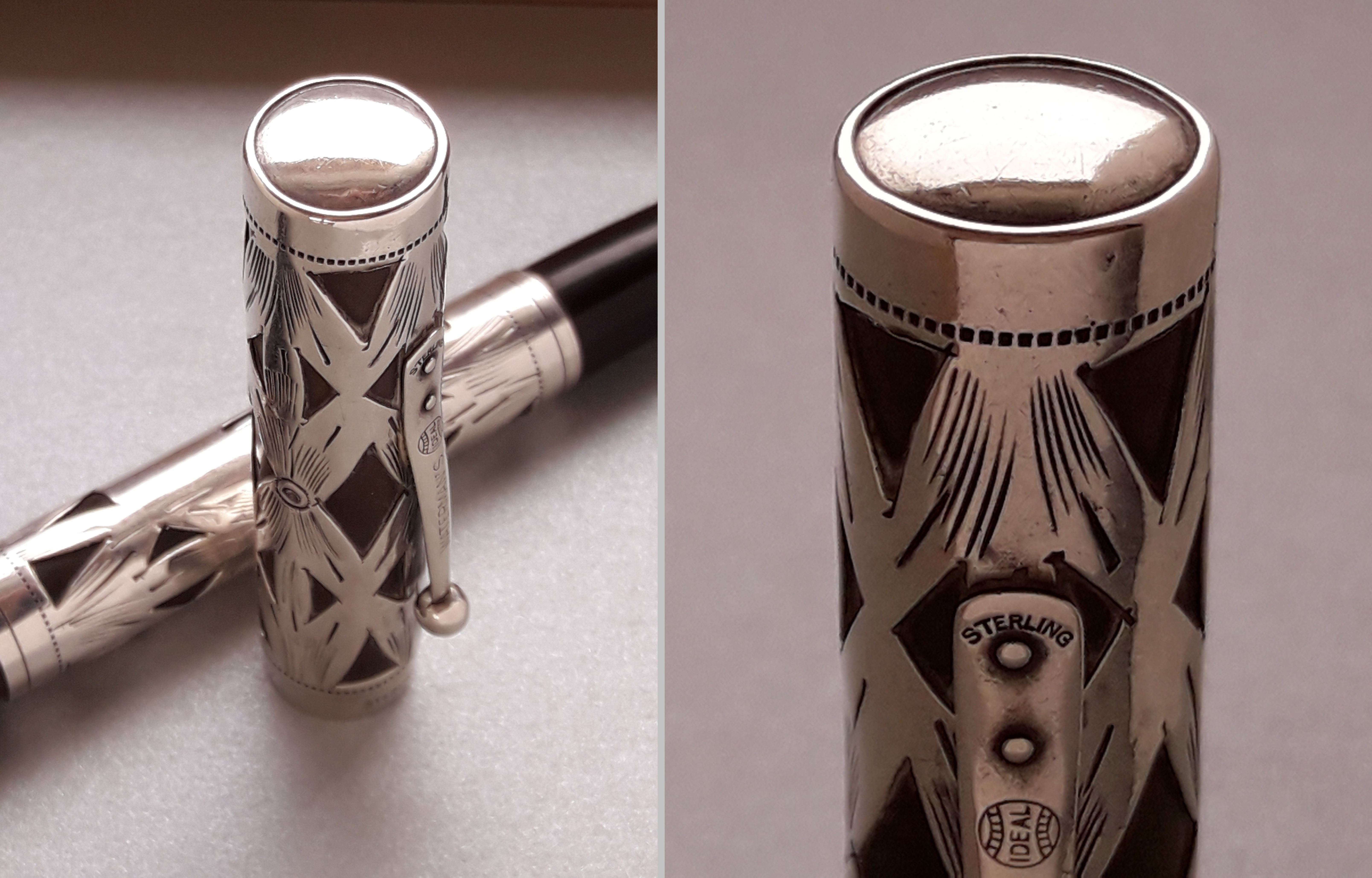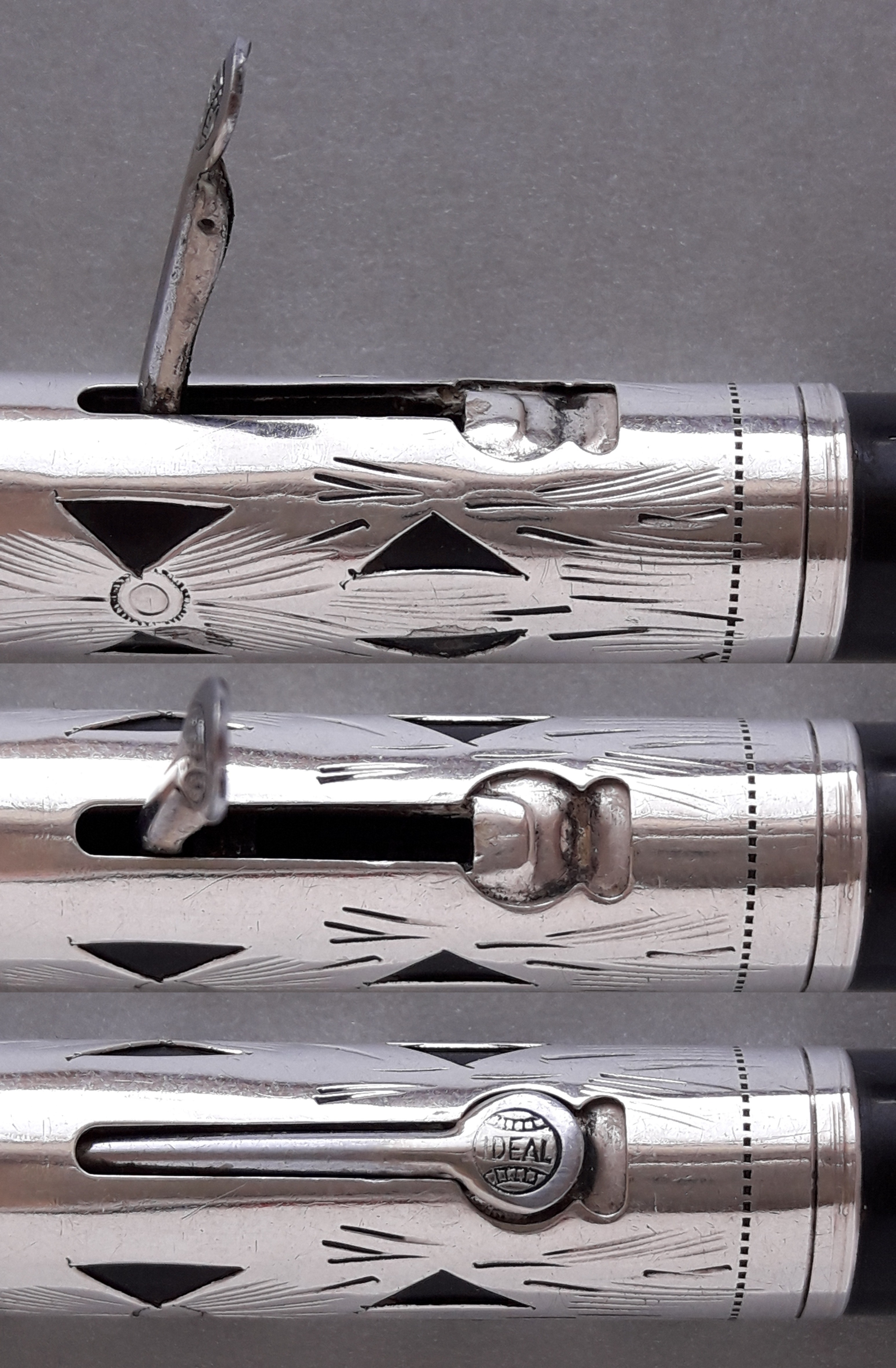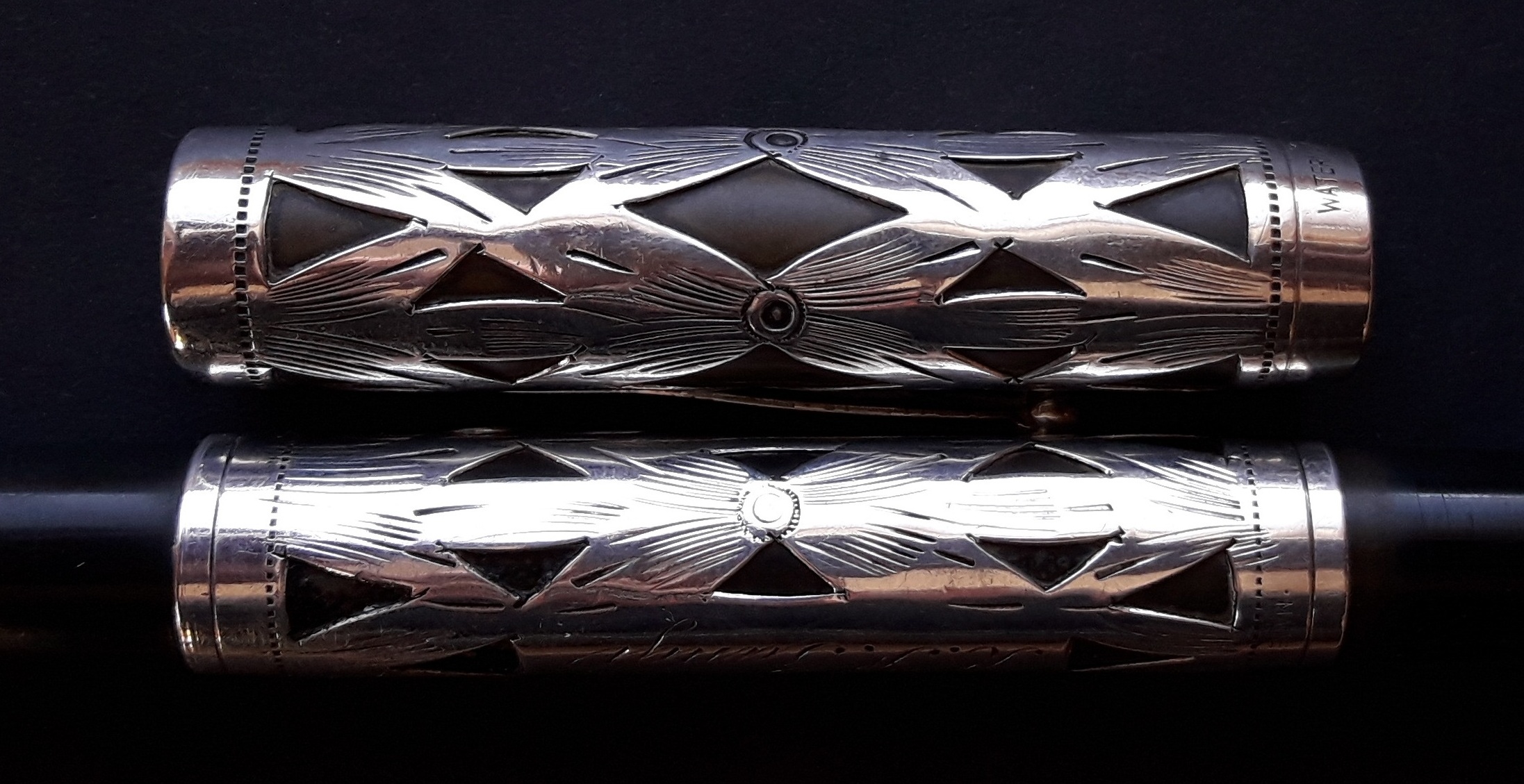 E’ interessante notare come questa tecnica, che è anche una scelta stilistica, sia stata impiegata agli albori del mercato delle stilografiche tra Otto- e Novecento da tutti i maggiori Produttori americani, da Parker a Mabie Todd, ed anche da quelli minori, ciascuno con una sua declinazione caratteristica.