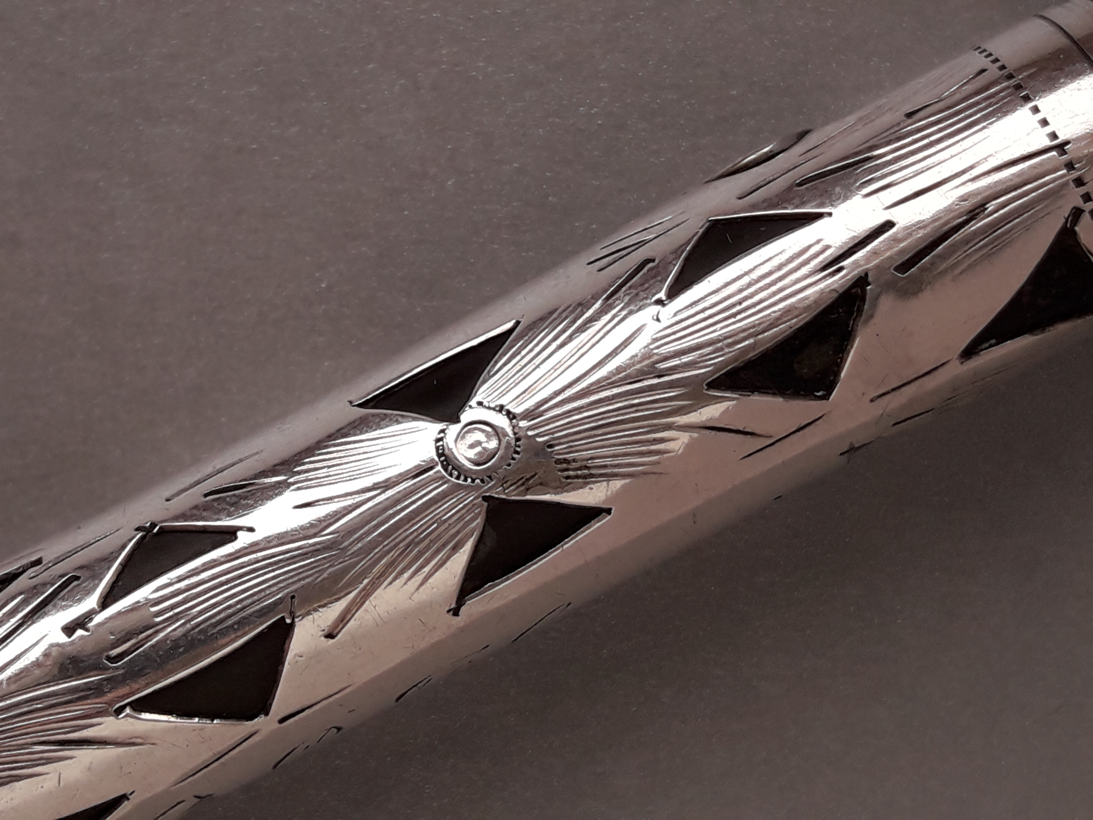 la definizione risulta decisamente impropria, trattandosi piuttosto di una “decorazione traforata”: in essa la lamina d’argento sovrapposta alla penna in ebanite (nera, non lavorata) lascia scoperte alcune porzioni della superficie sottostante, rombi e triangoli con lati anche ricurvi e per lo più irregolari, come tracciati a mano, così da ottenere un ricercato gioco di contrasti cromatici (chiaro/scuro) e di volumi (pieni/vuoti).