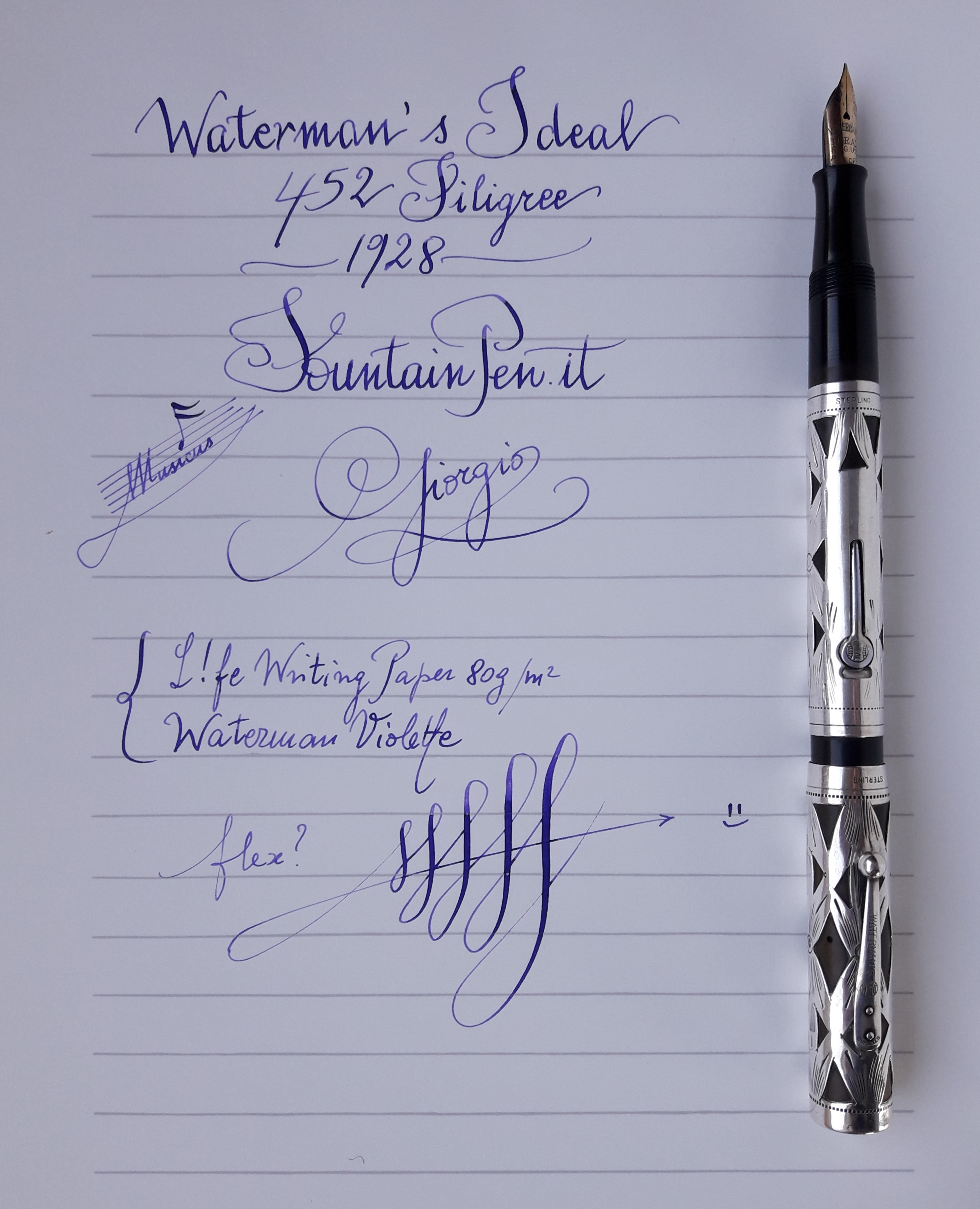 WATERMAN’S IDEAL 452 FILIGREE Sterling Silver [rivestita in argento massiccio con decorazione “Filigree”], corretto pennino Waterman Ideal in oro 14 Carati, caricamento a leva laterale, produzione U.S.A. anno 1928.
