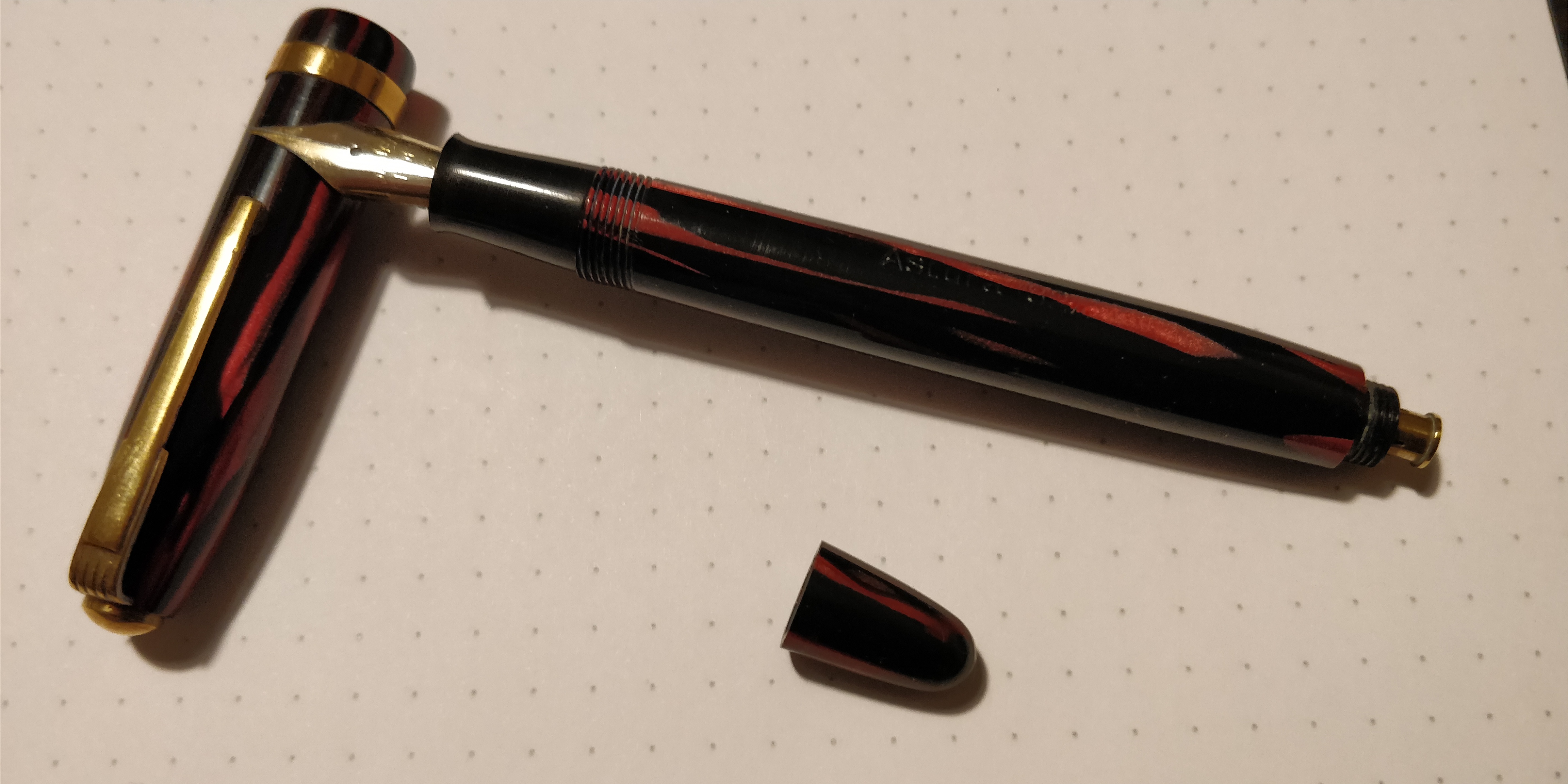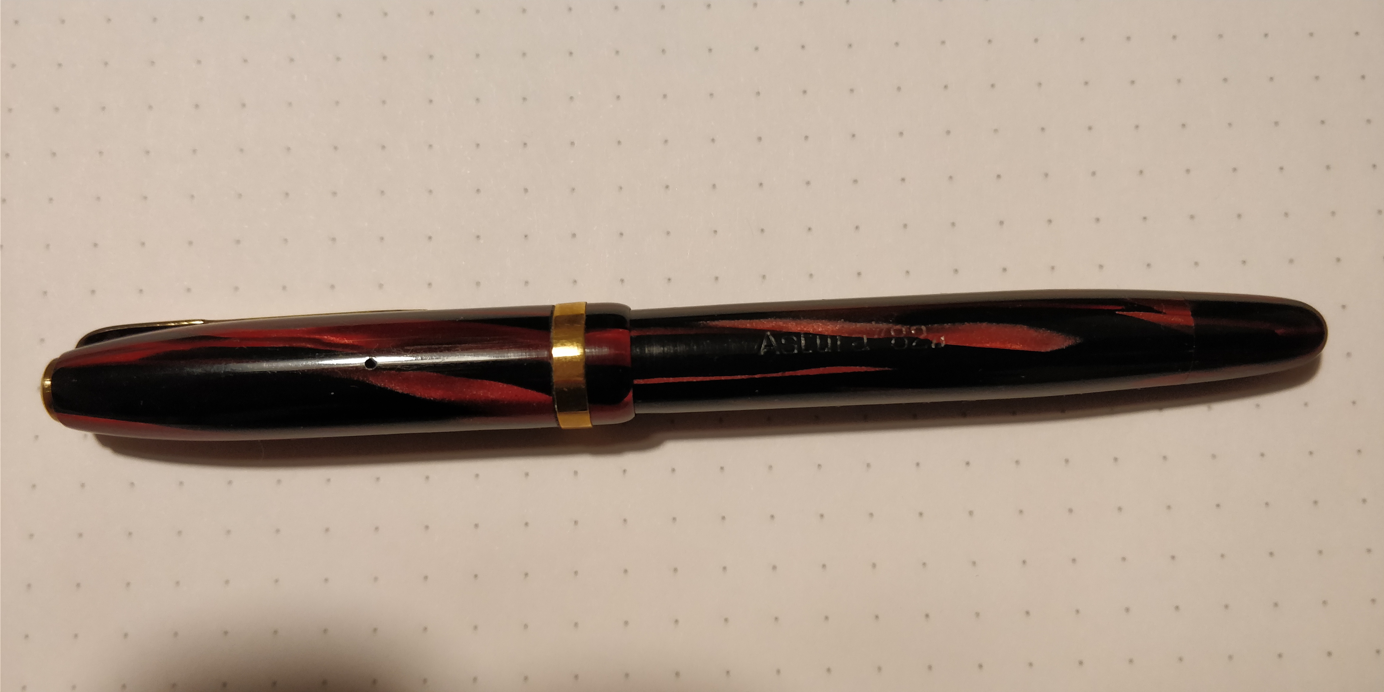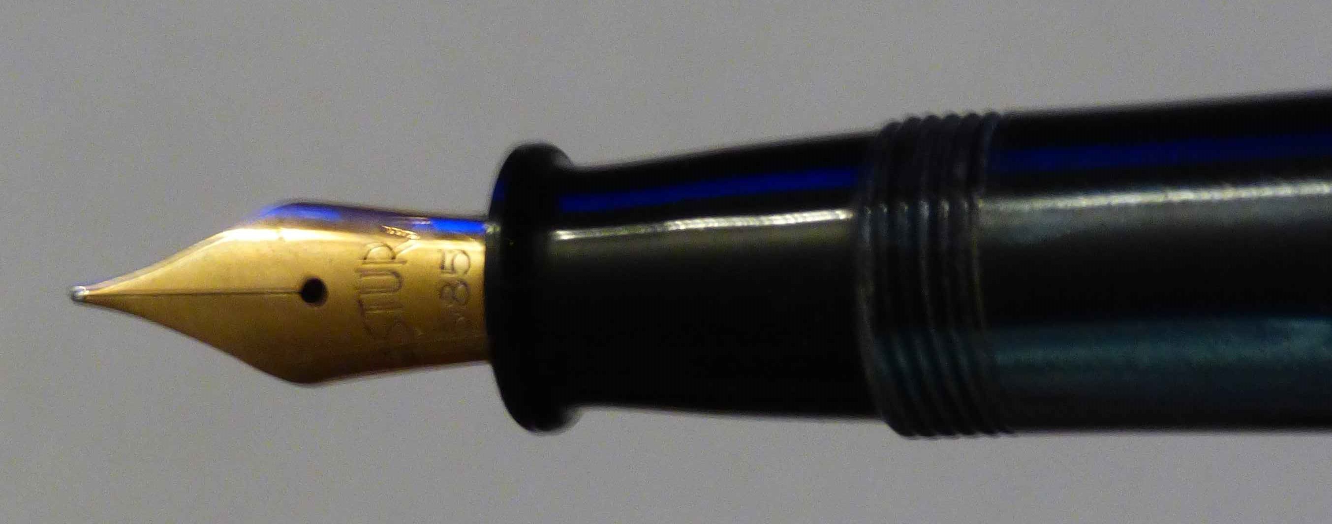 Il corpo è in celluloide, il caricamento dell'inchiostro è a pulsante di fondo ed il pennino in oro 585.