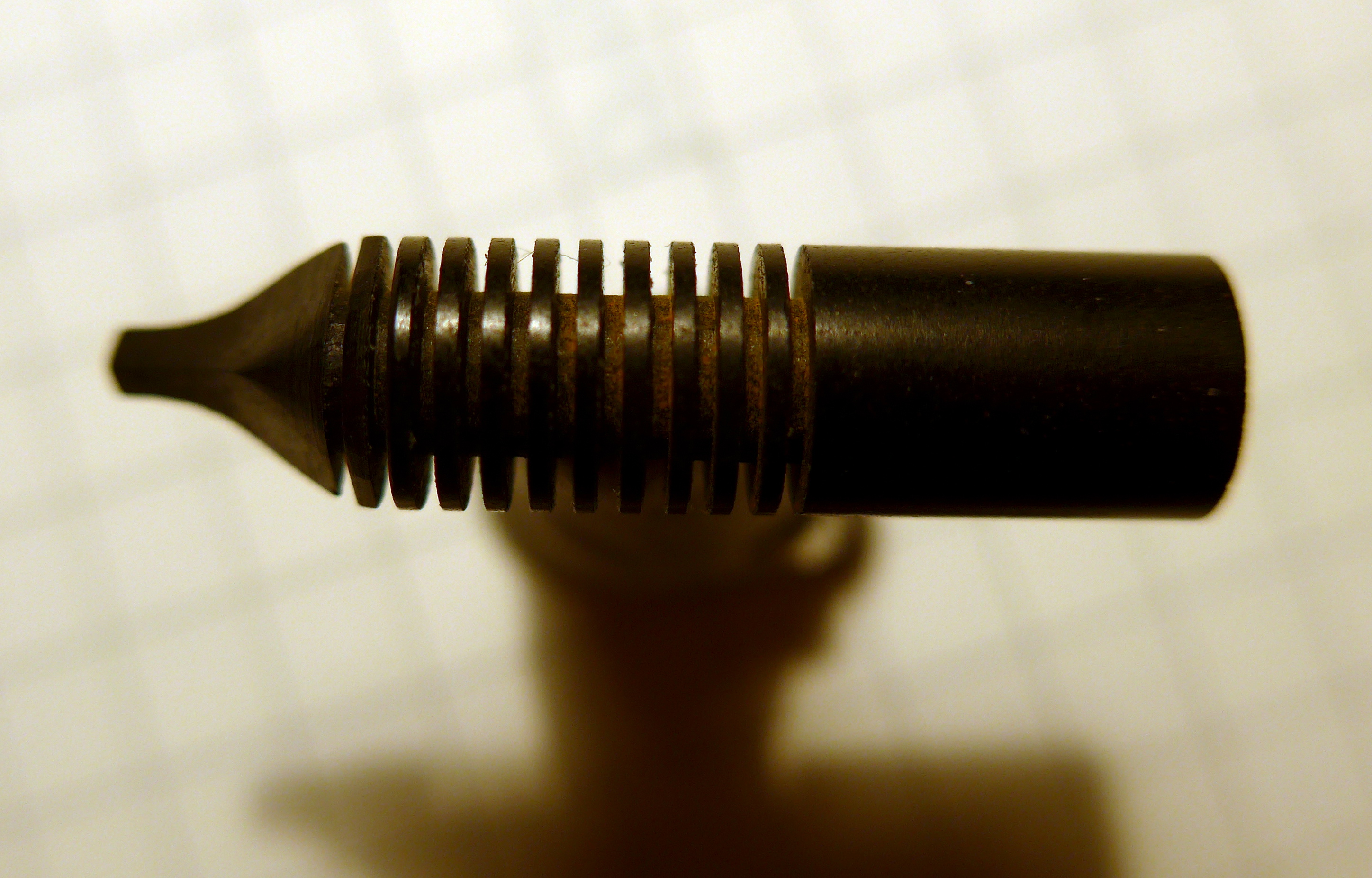 Il cono, come ha giustamente scritto Max, è il terminale dell'asticella e sullo scalino ben visibile dalla parte opposta alla punta va alloggiata la rondella di gomma che deve generare il vuoto quando il pistone viene spinto in basso. La rondella/diaframma è posta appunto tra il cono ed una rondella, anch'essa di ebanite, con una superficie leggermente concava che fa assumere al diaframma una forma "a scodella" e gli impedisce di piegarsi all'indietro.