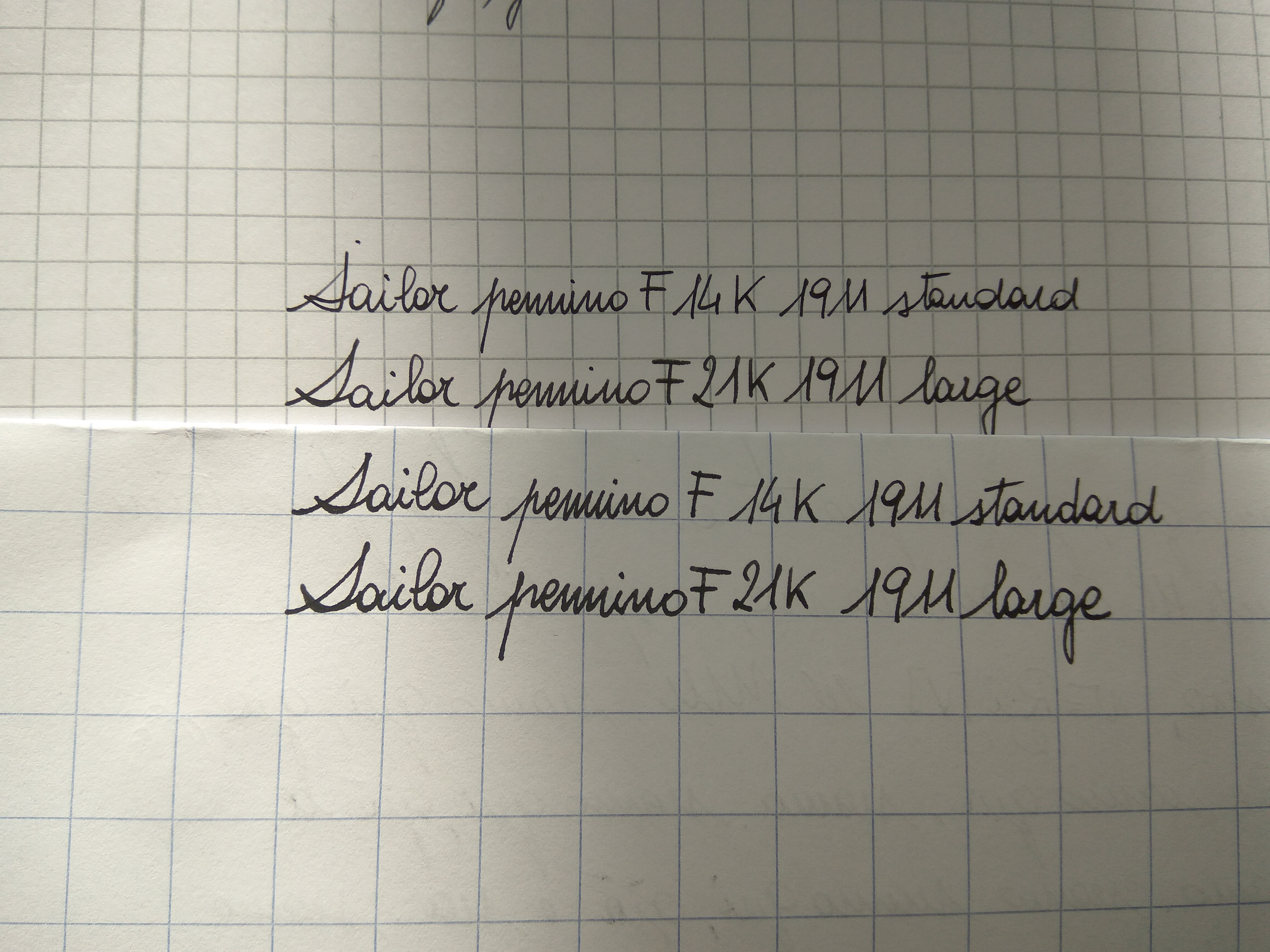 Per la misura l'M Sailor è più fine dell'F Pelikan e scrive bene ovunque senza allargare troppo il tratto. Mentre l'F Sailor è veramente fine, seppure molto scorrevole.