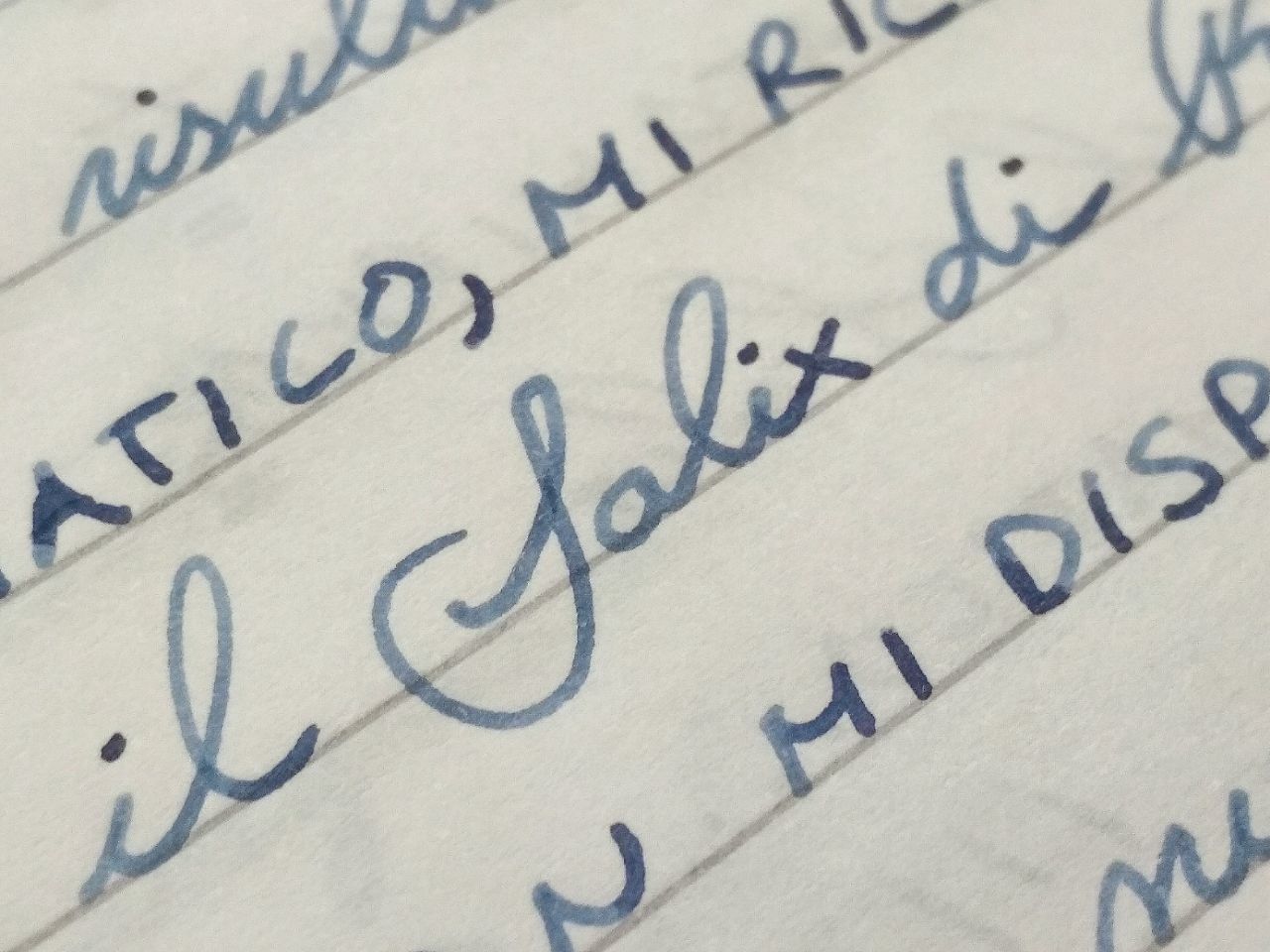 ma la tonalità particolarmente scura con penne dal buon flusso mi era venuta a noia: negli appunti personali mi metteva di cattivo umore! Fortunatamente, usando una penna con caricamento a pipetta, non mi è stato difficile provare a rendere l'inchiostro più gradevole modificandolo leggermente senza sacrificare l'intera boccetta. Il risultato mi soddisfa pienamente anche se...