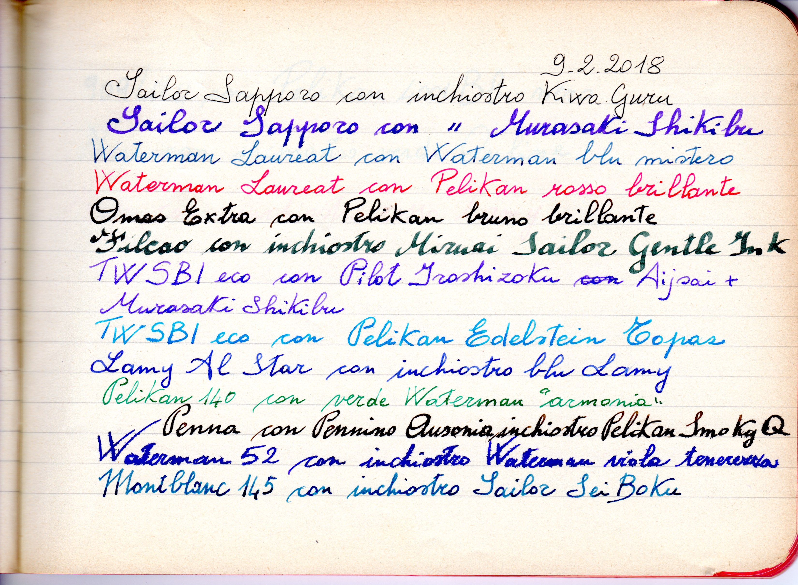 Mi pare che utti i Sailor presenti e i Lamy se la cavino molto bene. Per i Waterman mi pare che sia più merito delle Laureat che degli inchiostri perché il Waterman verde se la cava meno bene. In quanto alla Waterman52...