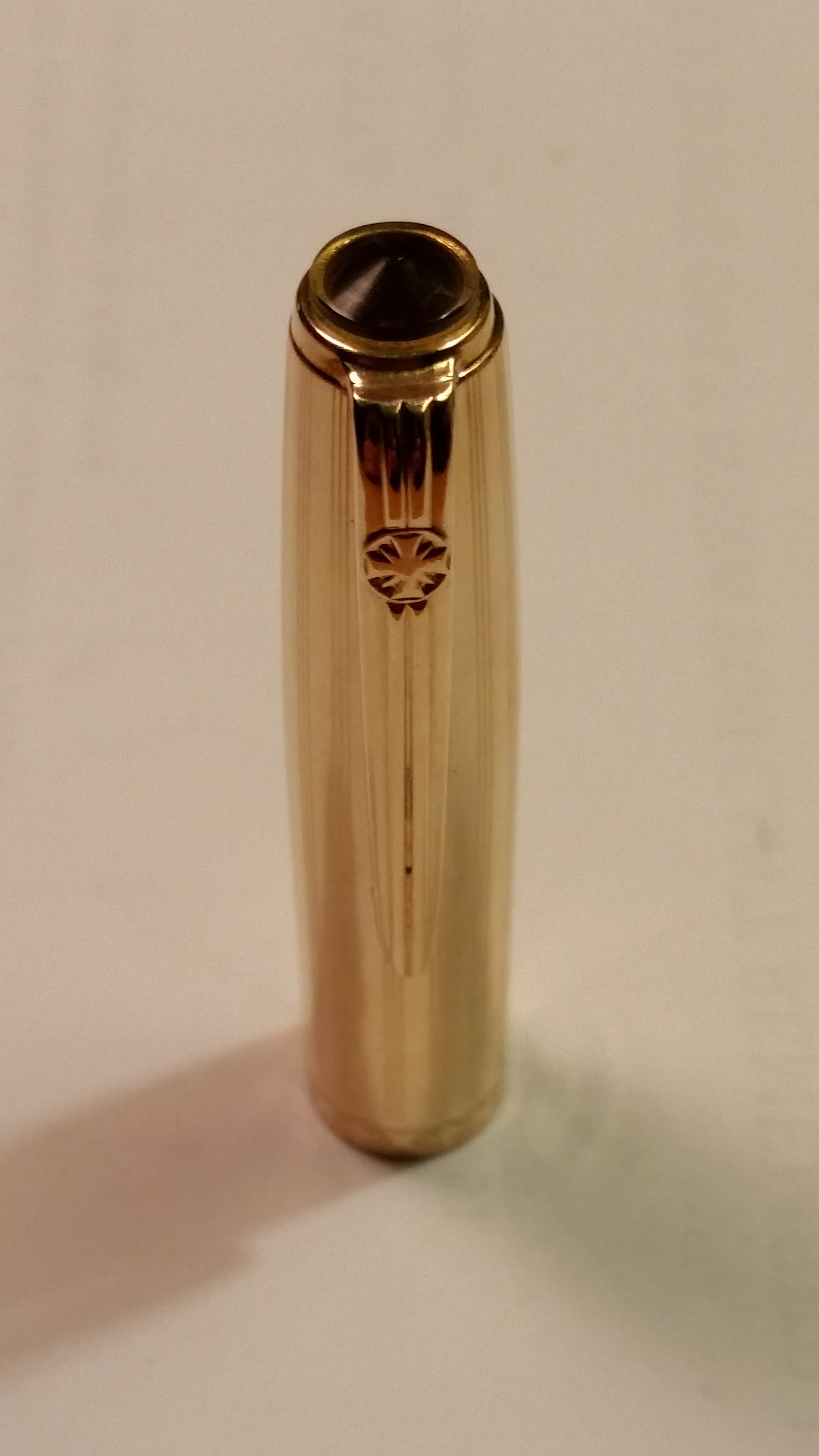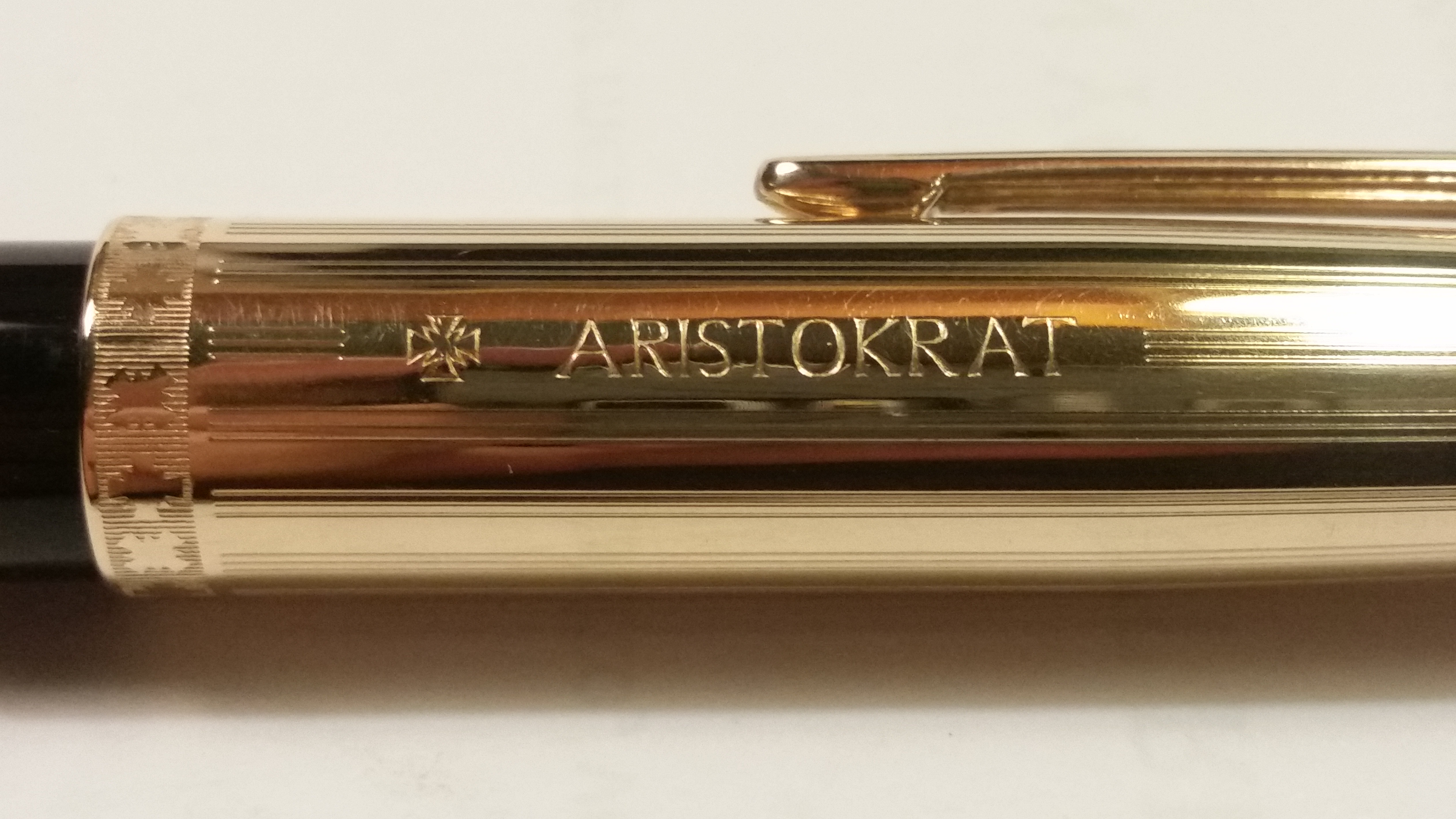 Riprendo questo argomento perchè la curiosità che la meravigliosa penna di Max mi suscita mi ha spinto oggi a fare un acquisto un po' avventato, ma del quale tutto sommato mi ritengo soddisfatto. Si tratta di Aristokrat a stantuffo con corpo in celluloide semitrasparente e cappuccio dorato, penso dello stesso periodo della penna di Massimo. Il pennino in oro bicolore è abbastanza flessibile e l'alimentatore è identico a quello della penna di Max. Il cappuccio presenta sulla sommità un jewel totalmente trasparente (potrebbe non essere il suo?) e sul fianco riporta la scritta 'ARISTOKRAT' con appresso la Croce di Malta, riportata sulla clip e ripetuta sul bordo del cappuccio stesso. La manopola dello stantuffo è identica a quella di Max, come lo sono le incisioni sul corpo. Purtroppo non sono riuscito a rimuovere il caricamento, lasciando la variazione del colore della celluloide trasparente, dovuta magari al vecchio inchiostro (prima era molto più scuro e lo stacco era più marcato, questo è il massimo che sono riuscito a raggiungere). Il cappuccio è a incastro e la sezione presenta sottili linee orizzontali particolarmente gradevoli che servono ad aumentare la presa. Il flusso è un pochino abbondante, ma niente di esagerato. Il numero del modello è stampigliato in prossimità della manopola, ed il numero 30. Come qualità costruttiva mi sembra ottima, e le rifiniture sono molto fini. Ringrazio Maxpen e Lucre per la utilissima contestualizzazione storica e faccio ancora i complimenti a Max per la bellissima penna, di cui ho scovato la sorella! Le misure sono: 132 mm chiusa, 124 mm senza cappuccio, 147 mm con cappuccio calzato e 63 mm solo il cappuccio. Ecco di seguito alcune fotografie (perdonate la qualità un po' bassa, ma la luce a disposizione non è delle migliori) Ringrazio tutti per l'attezione e spero che vi sia piaciuta! Buona serata!