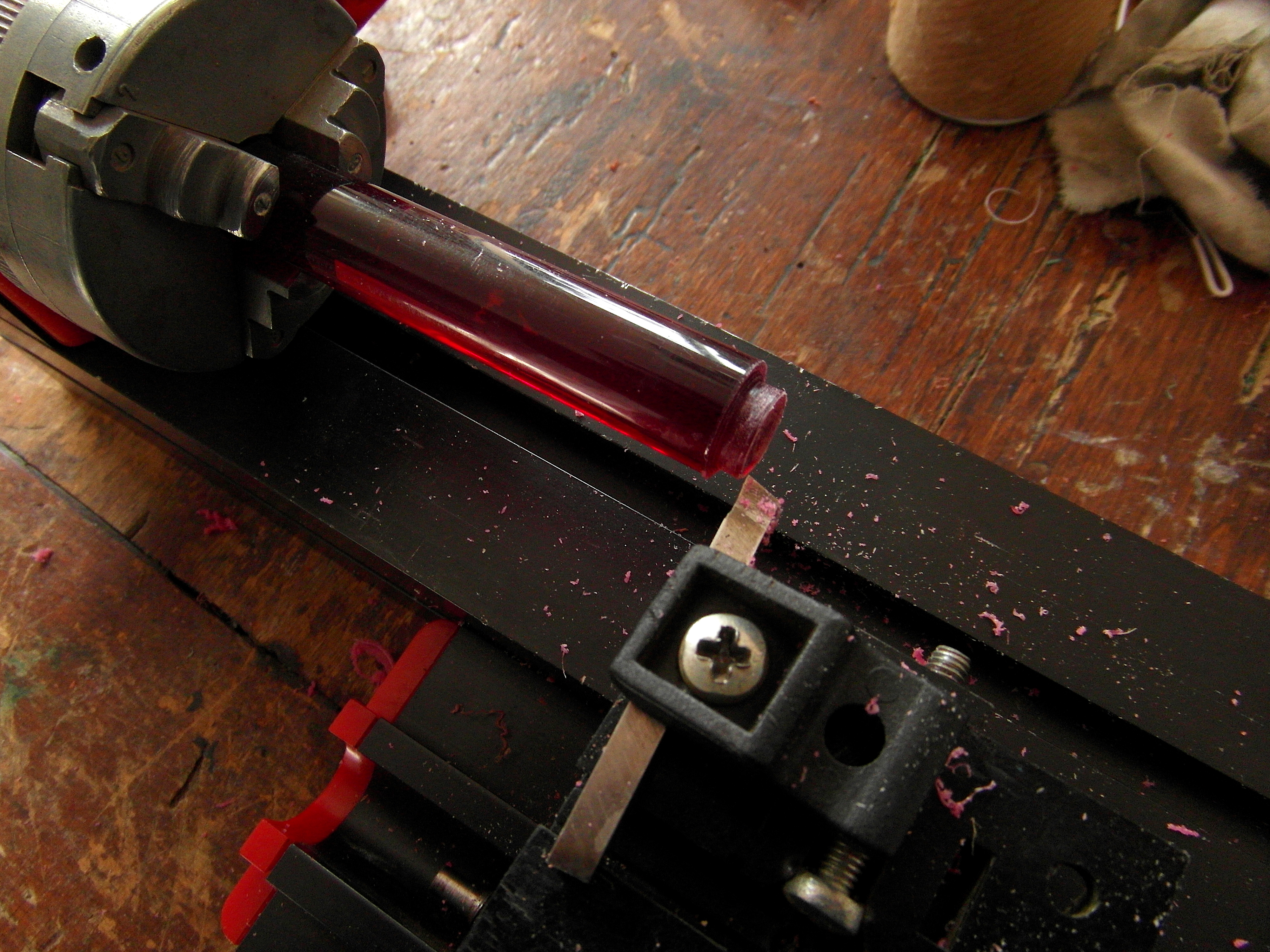 Inizio col rettificare col mio tornietto quasi-giocattolo il profilo interno del corpo, dove sono presenti residui del vecchio materiale. Dopo ciò passo a creare un incastro idoneo sulla barra di acrilico