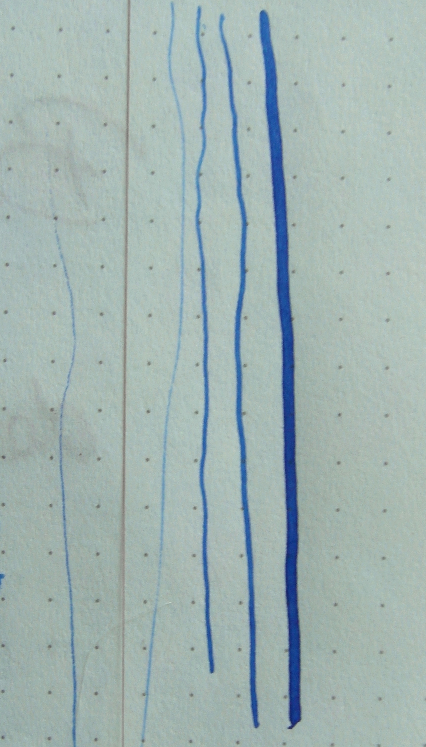 Non è proprio una prova di scrittura, ma vi mostro la modulabilità di questo pennino: il secondo da destra, quello di colore diverso, è un capello...