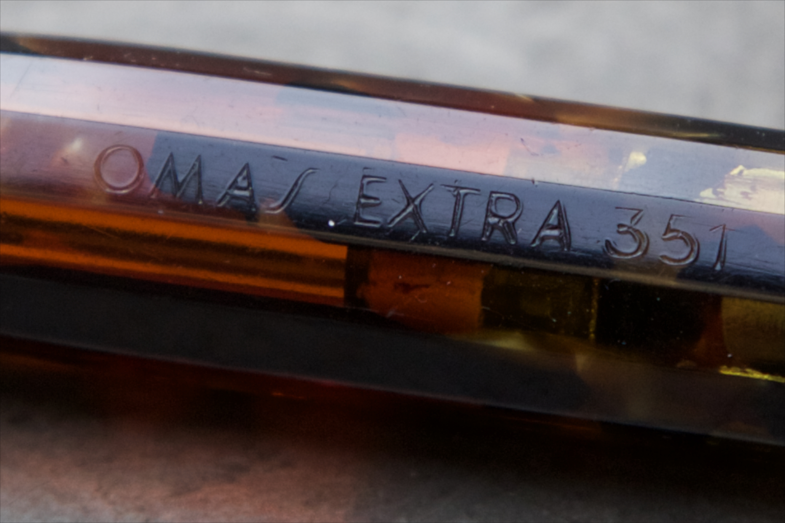 Presa finalmente in mano ho svitato il cappuccio, la penna aveva un bel pennino in oro marchiato Columbus Extra 23 e un alimentatore in ebanite che continuava a gridare Omas! Ho proseguito la mia indagine visiva e sul fusto, tra lo sporco generale in cui versava la penna, ho scorto l' iscrizione "Omas Extra 351".