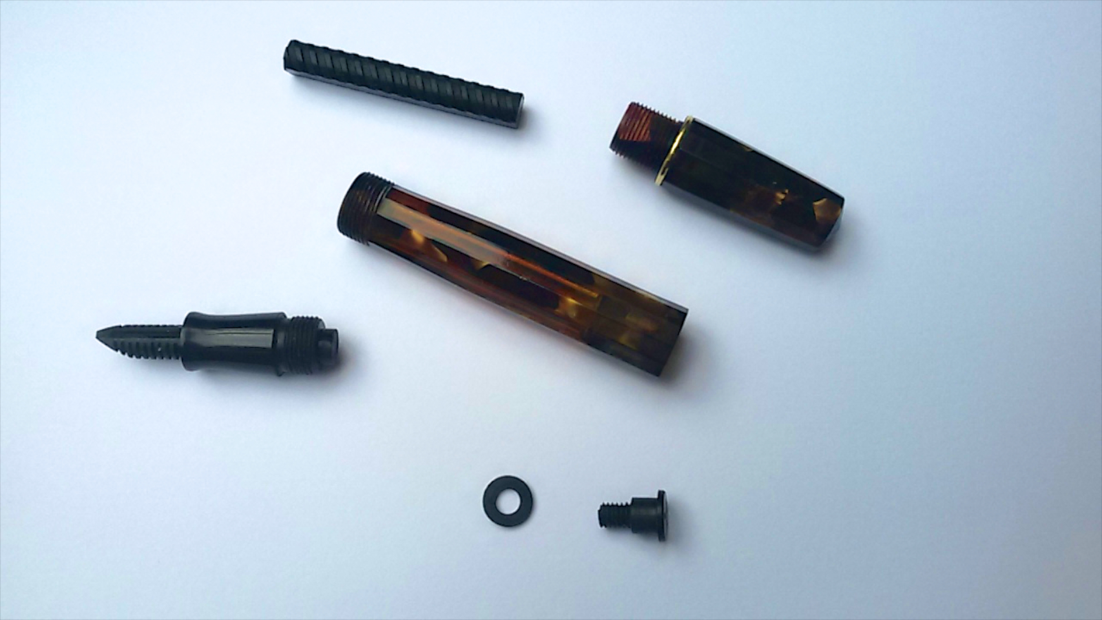 La penna versava in condizioni di sporcizia totale, fortunatamente aspirava ancora e l' ho riempita di acqua e messo a bagno anche il pennino. Dopo qualche ora la sezione si è svitata facilmente, ho estratto il pennino e lo stantuffo. Dal retro ho svitato il fondello e lavato bene tutto.