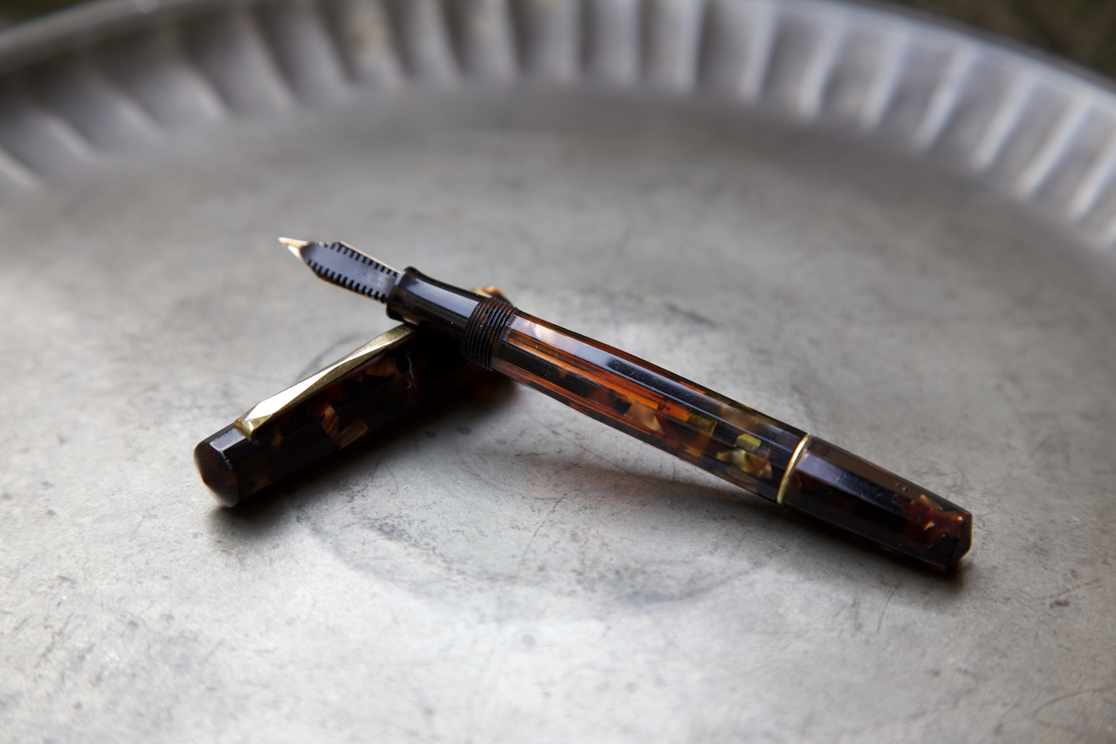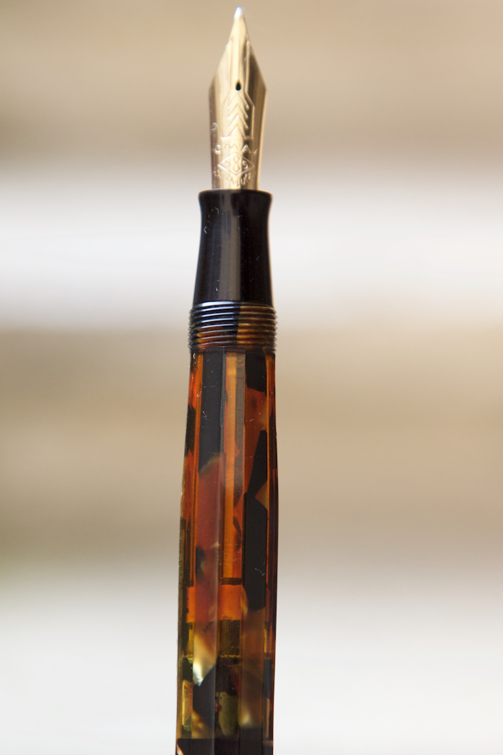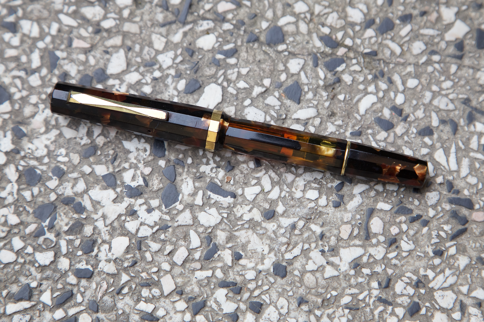 La penna è stata usata ma una volta ripulita le sue trasparenze e i colori della celluloide sono riesplosi, oosservandola alla luce si possono apprezzare l' alternanza delle faccette e i colori della celluloide "tartaruga".