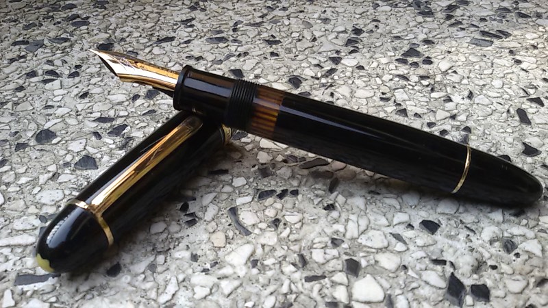 Questa penna mi è capitata tra le mani qualche mese addietro ed è stato un momento molto emozionante in quanto amo particolarmente sia il modello 149 che i pennini Montblanc vintage. È una Montblanc Masterpiece, penna destinata all' esportazione, la daterei attorno al 1951 in quanto ha l' alimentatore in ebanite "piatto", il suo bellissimo pennino tricolore in oro 14 c è un extra fine ed è forse tra i pennini più flessibili che abbia. Il caricamento avviene tramite un pistone telescopico che risucchia una gran quantità d' inchiostro. Non ho avuto neppure bisogno di sostituire la guarnizione in sughero, dopo una notte in carica con acqua ha ripreso a funzionare perfettamente. Questa è una penna che adoro particolarmente, per l' ergonomia, la celluloide che sprigiona calore e il pennino che è fantastico. Anche dopo giorni di inutilizzo è pronta a ripartire senza alcun tentennamento ed è inutile dire che è sempre con me e salta di diritto la rotazione...