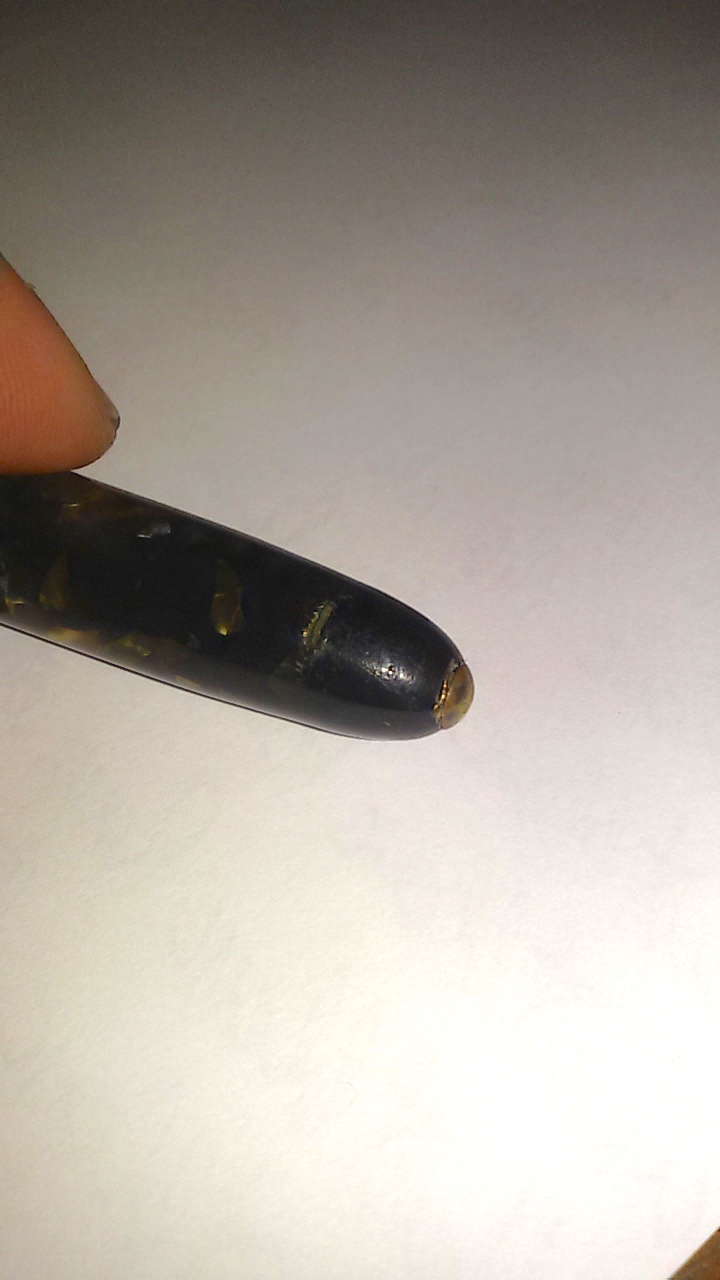 Il fondo all' interno del cappuccio non è bello lineare, appare come se ci fosse stato colato dentro qualcosa, escludo possa essere inchiostro secco perchè dopo giorni a bagno ora non rilascia più colore. D' altronde ci deve essere per forza un dadino o qualcosa che tiene il cappuccino in ottone, ributto tutto ancora in acqua e vedo se si smollerà, grazie.
