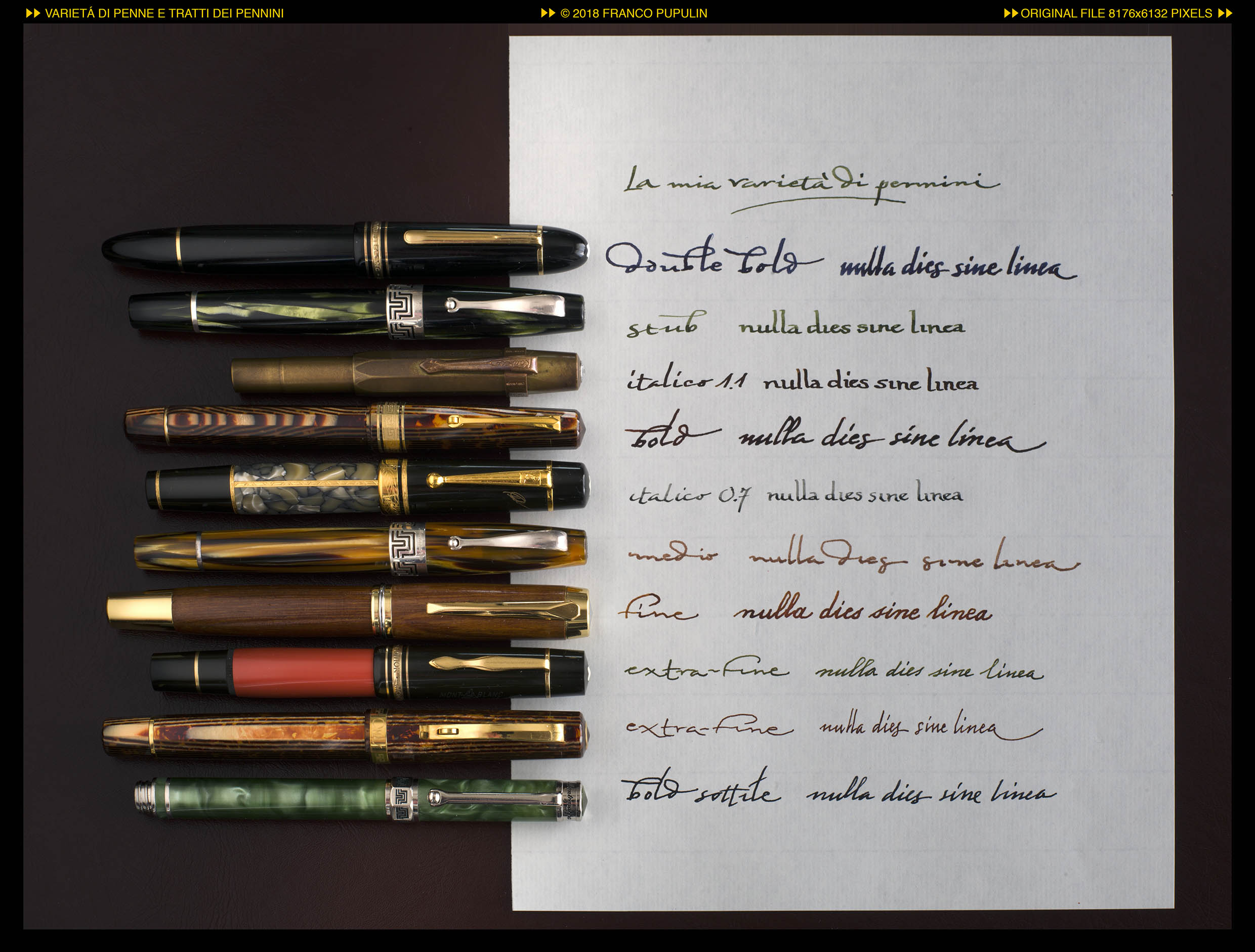 Capisco che la presentazione é totalmente parziale, capisco che ogni produttore fa un EF, un M, un B diverso fargli altri... So che manca un pennino B un po' stubbish, tipo Montblanc, mancano gli obliqui perché non ci so scrivere, manca un triplo largo... Chiedo venia per non avere, qui, alcuna pretesa di completezza.
