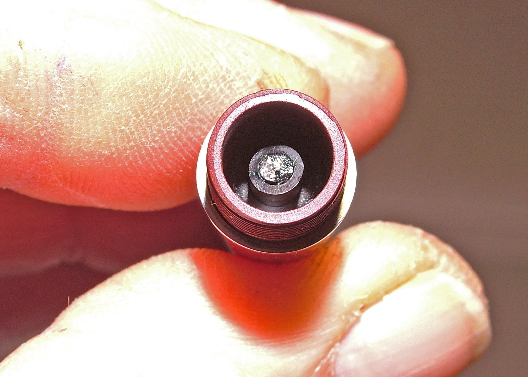 La sezione in un foro deve arrivare a circa metà, poi con un ferro un po più piccolo del foro ( va bene quello delle grucce in metallo per le camicie) si batte su con un martelletto al centro del foro dove si infila la cartuccia.