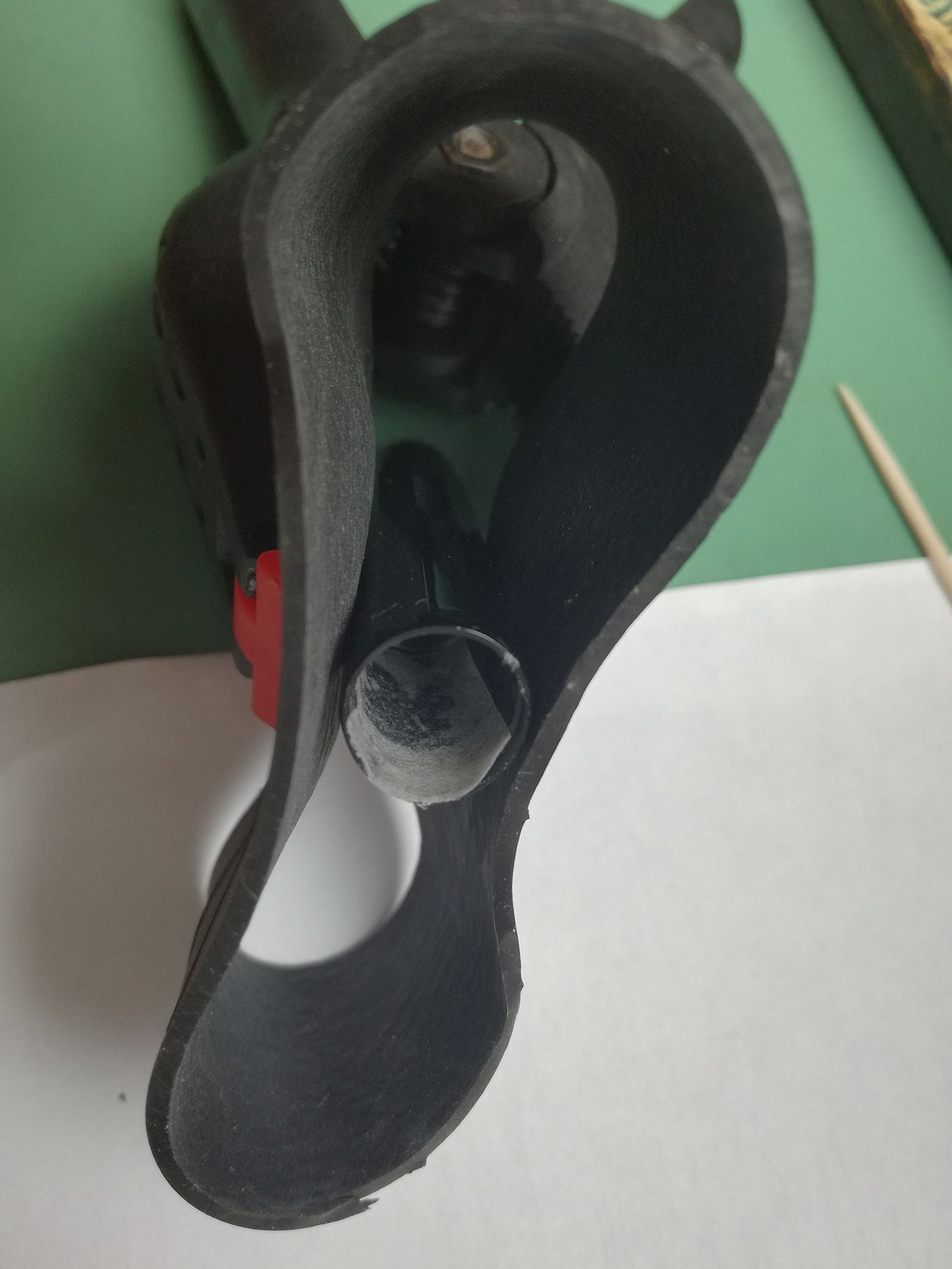 Se il cappuccio fosse in celluloide il discorso cambia e l'intervento più opportuno sarebbe con l'acetone o meglio con l'acetato d'etile. Però a quel punto sarebbe opportuno predisporsi un poco di celluloide nera sciolta per fare un pò di riporto. Dopo avere spennellato acetone ed acetato sui lembi chiudere con le fascette ma senza stringere perché il materiale ammorbidito cederebbe ed il cappuccio rischierebbe di diventare troppo stretto: limitarsi a mettere a contatto il lembi, spennellare celluloide sciolta sulla parte, lasciare asciugare, levigare e lucidare. Toppa interna sempre opportuna.