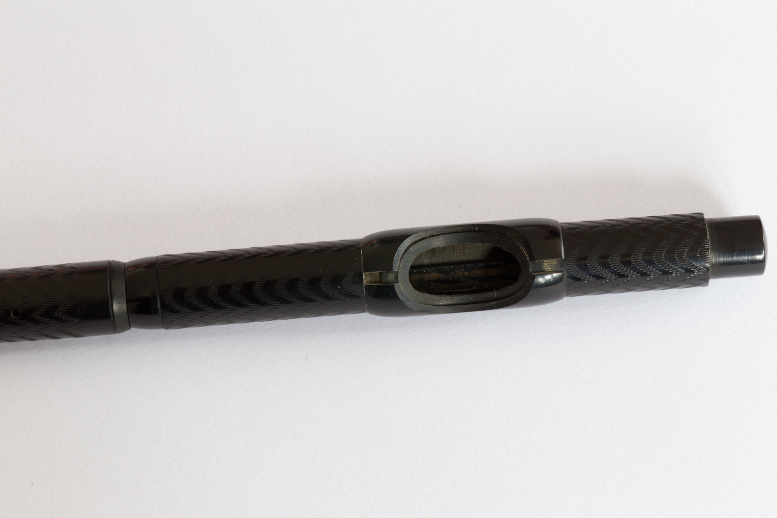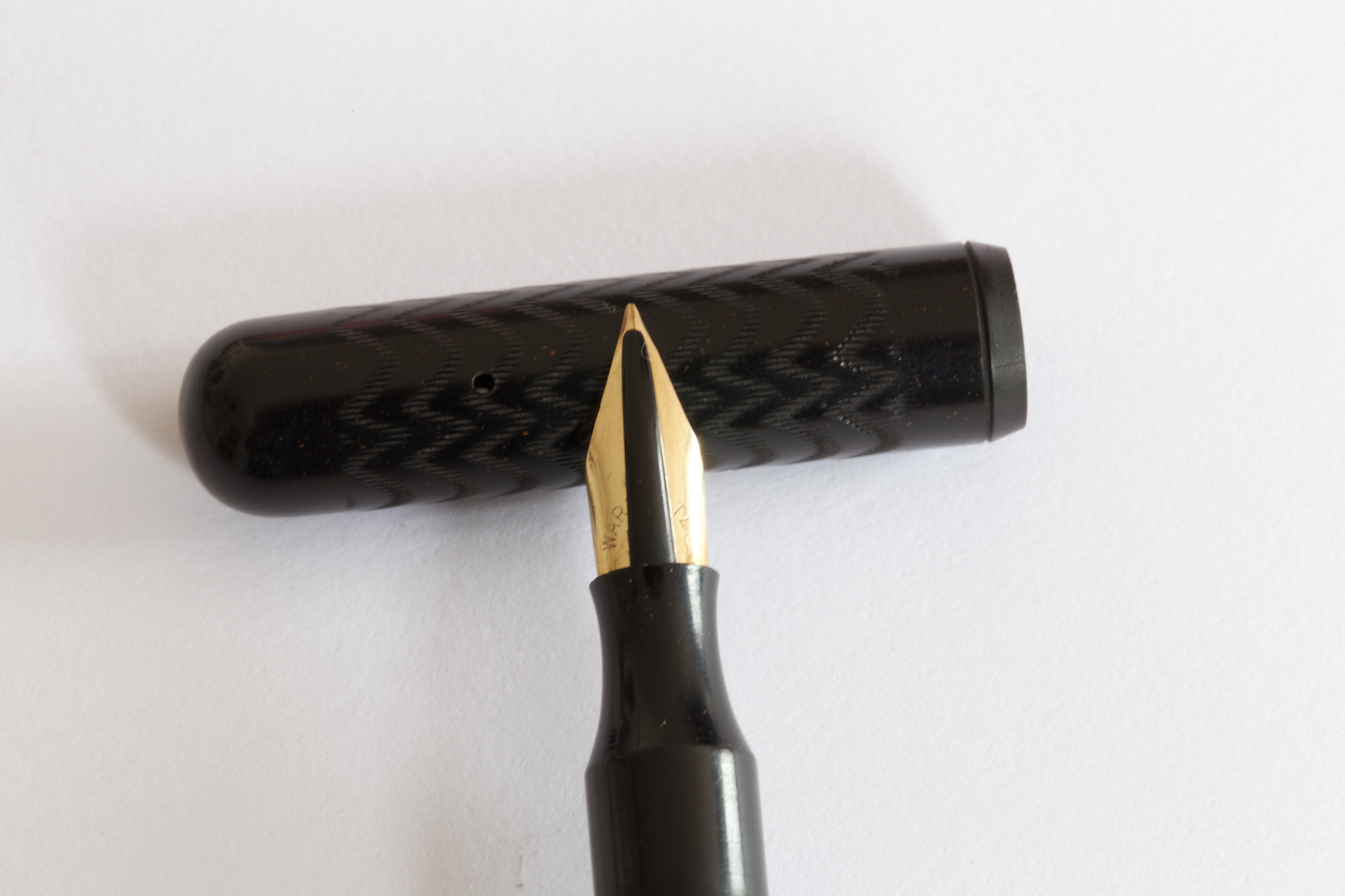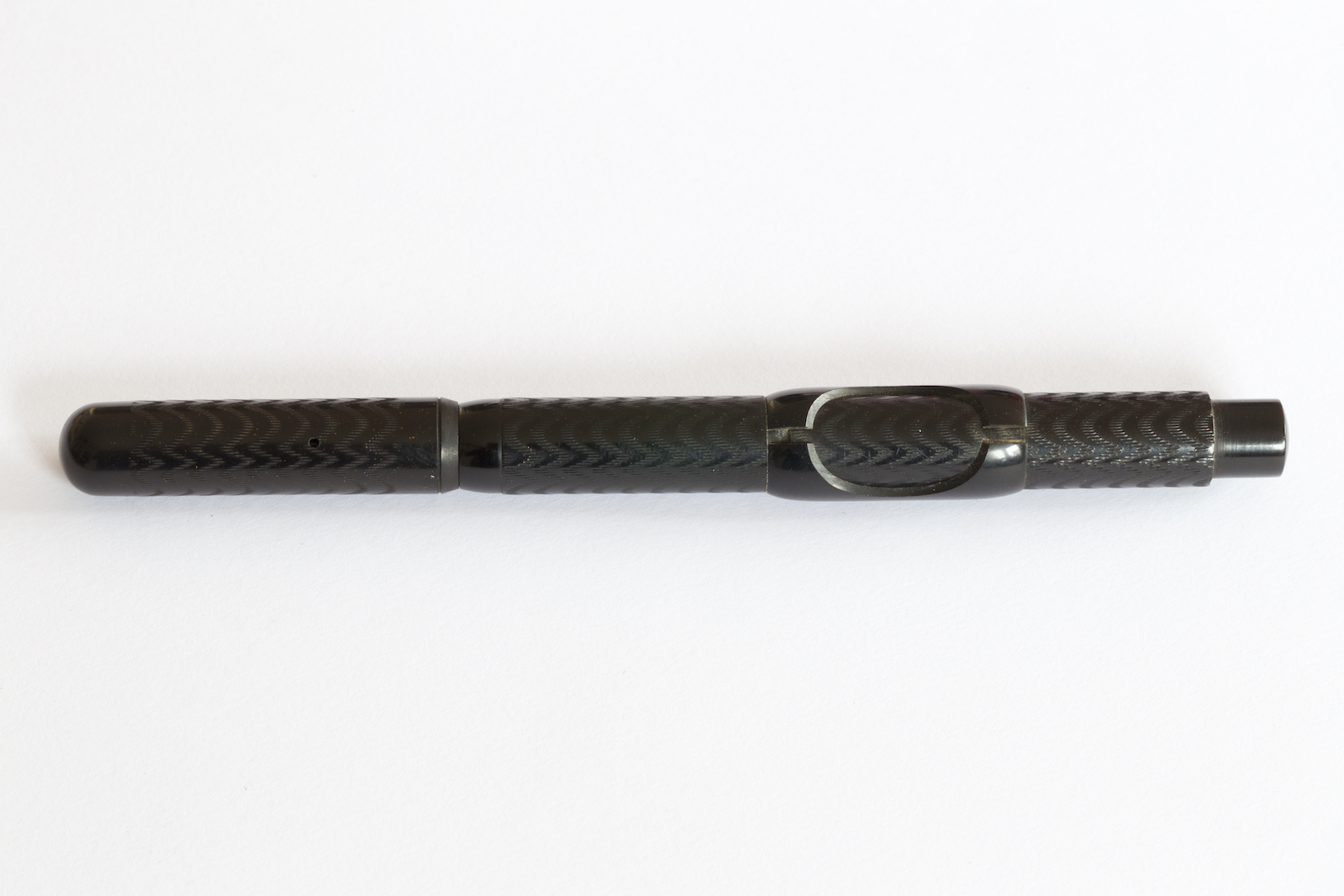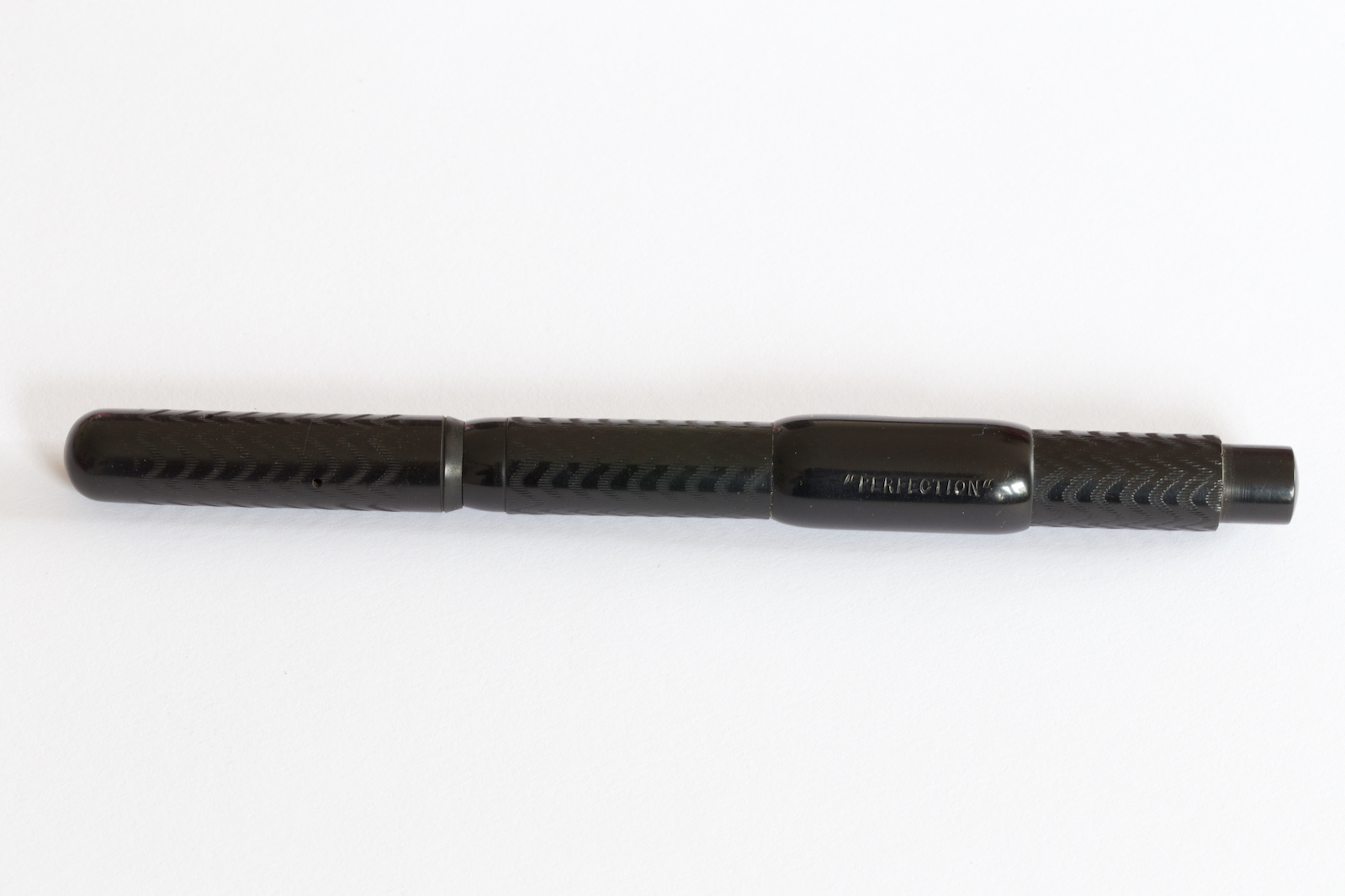 Questa bella penna in ebanite riporta solo la scritta "Perfection" ed ha la particolarità di avere un sistema di carica sleeve filler. Tramite una apertura sul fusto si accede ad una barra che comprimendo la sacca di inchiostro permette di caricare la penna. L' apertura sul fusto può essere nascosta ruotando un piccolo elemento circolare in ebanite liscia che riporta la scritta "Perfection". Il pennino è un Warrented in oro di misura fine, trovo particolare la linguetta posta sopra di esso, si trova anche in penne come le Onoto. Se aveste informazioni su questa penna mi farebbe piacere saperne di più, grazie.