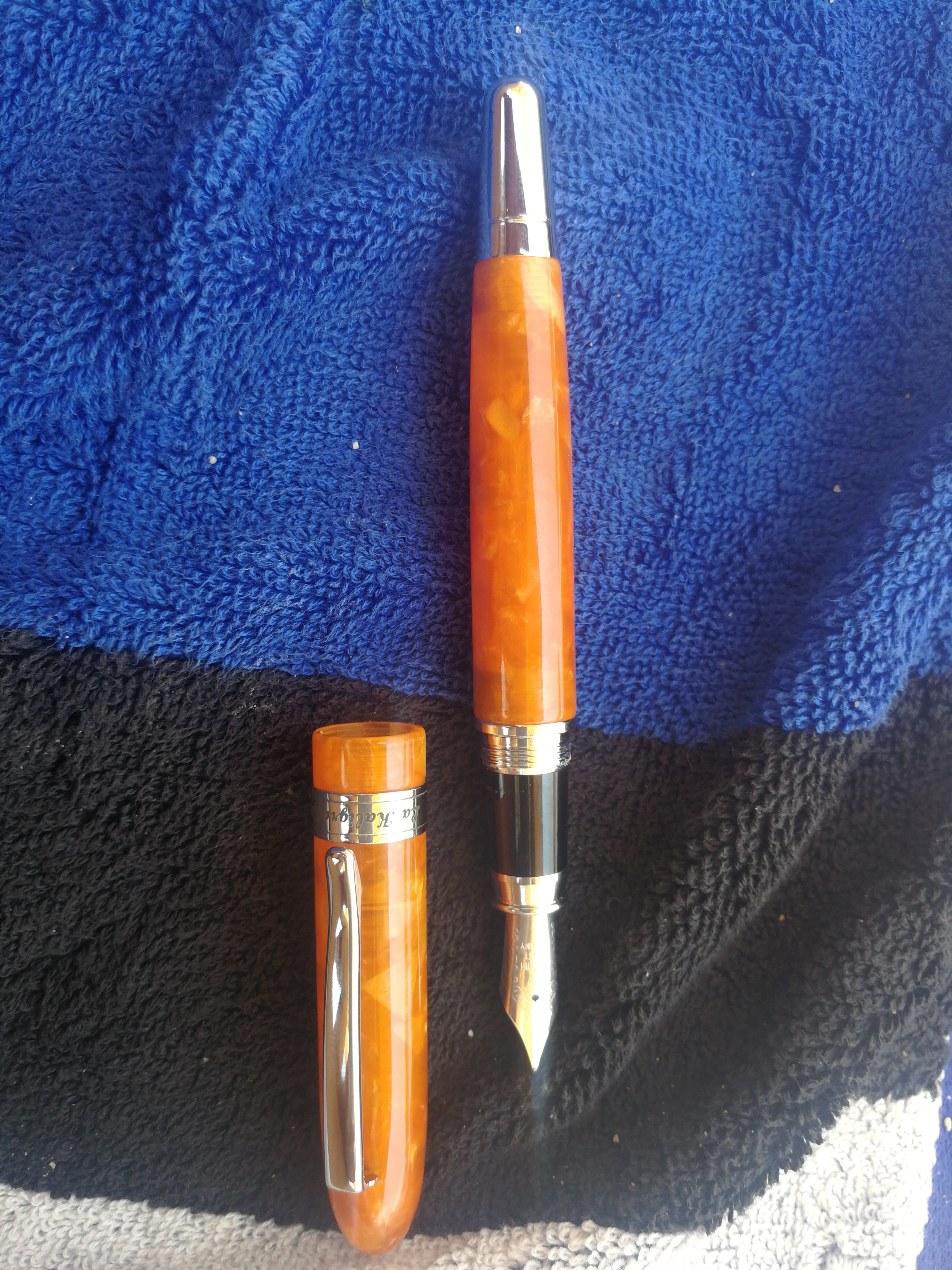 Allora, mi ero innamorato della sua gemella arancione dopo aver visto una recensione di Vecchia Guardia Stilografica su YouTube. Il mio venditore di fiducia a Milano aveva il roller, gli ho talmente rotto le scatole che ne ha fatte arrivare un botto, purtroppo senza la scatola in cui l'hai presa tu, ma finalmente ho potuto avere la sua controparte arancio. Esiste in due modelli (la tua è la mia) entrambi presenti dal mio venditore attualmente. Non dico altro perché qui è vietato fare pubblicità. In foto la mia che non mi ha dato problemi. Tieni presente che quella marca di pennino è la stessa di Campo Marzio con la quale purtroppo sto avendo parecchi problemi (il povero Siberia ne sa qualcosa). Quando gli ho chiesto se aveva corpi scrittura ad avvitamento di ricambio per la Campo Marzio mi ha detto di no (non è una marca che tratta). Per la Kaligrafica magari è un'altra storia. Scrivimi in privato e ti do i riferimenti e non demordere.AinNithael ha scritto: ↑mercoledì 4 aprile 2018, 14:27 In una tabaccheria dove ho acquistato una marca da bollo esponevano stilografiche... Ovviamentene ho acquistata una. Marca La Kaligrafica. A casa ho provato il pennino, scorre ma con la flessibilità di un chiodo. Oltre a me, qualcun altro possiede penne di questa marca? Sulla nostra Wiki non l'ho trovata fra i marchi. Io, come sempre, molto ignorante