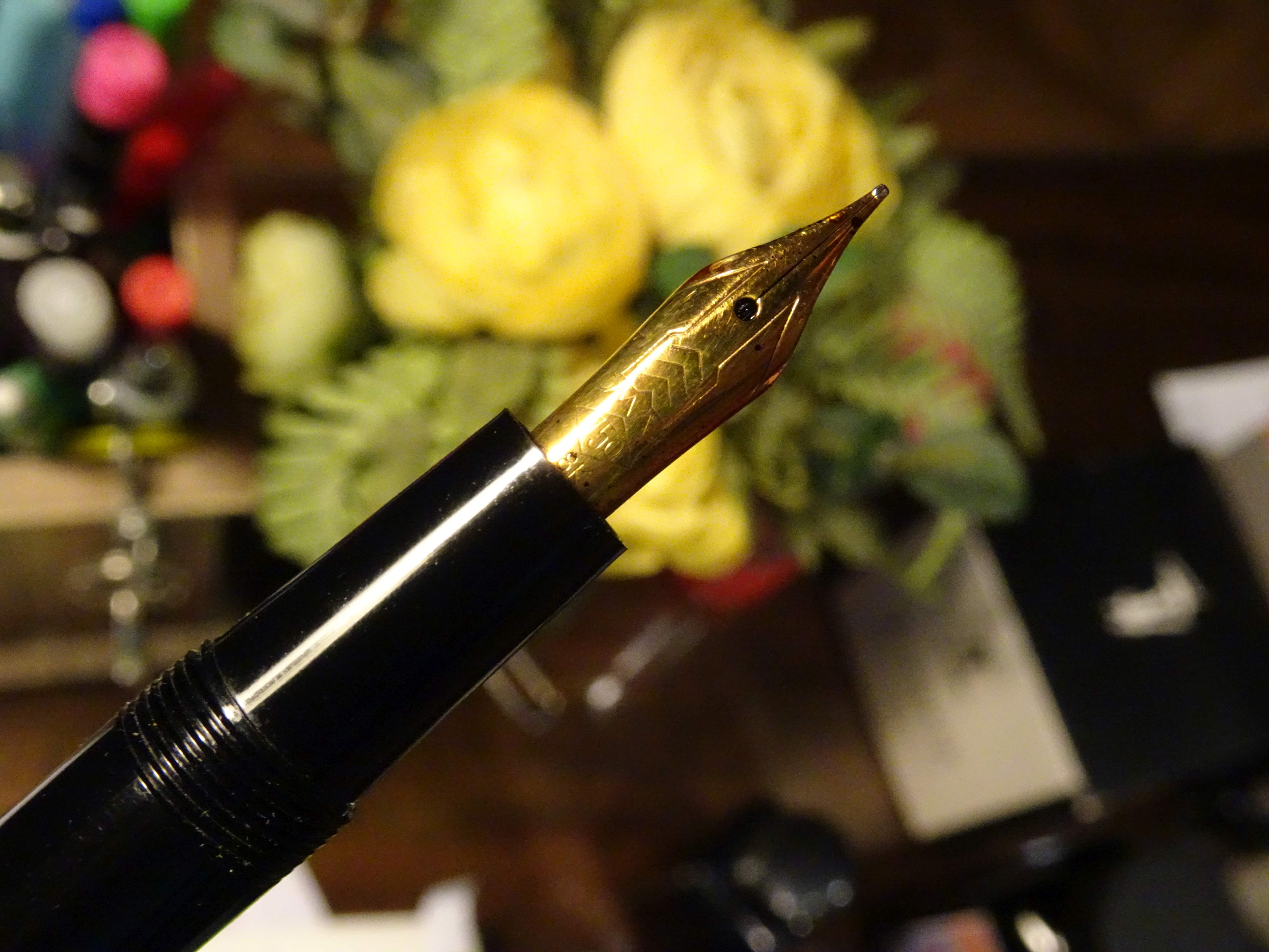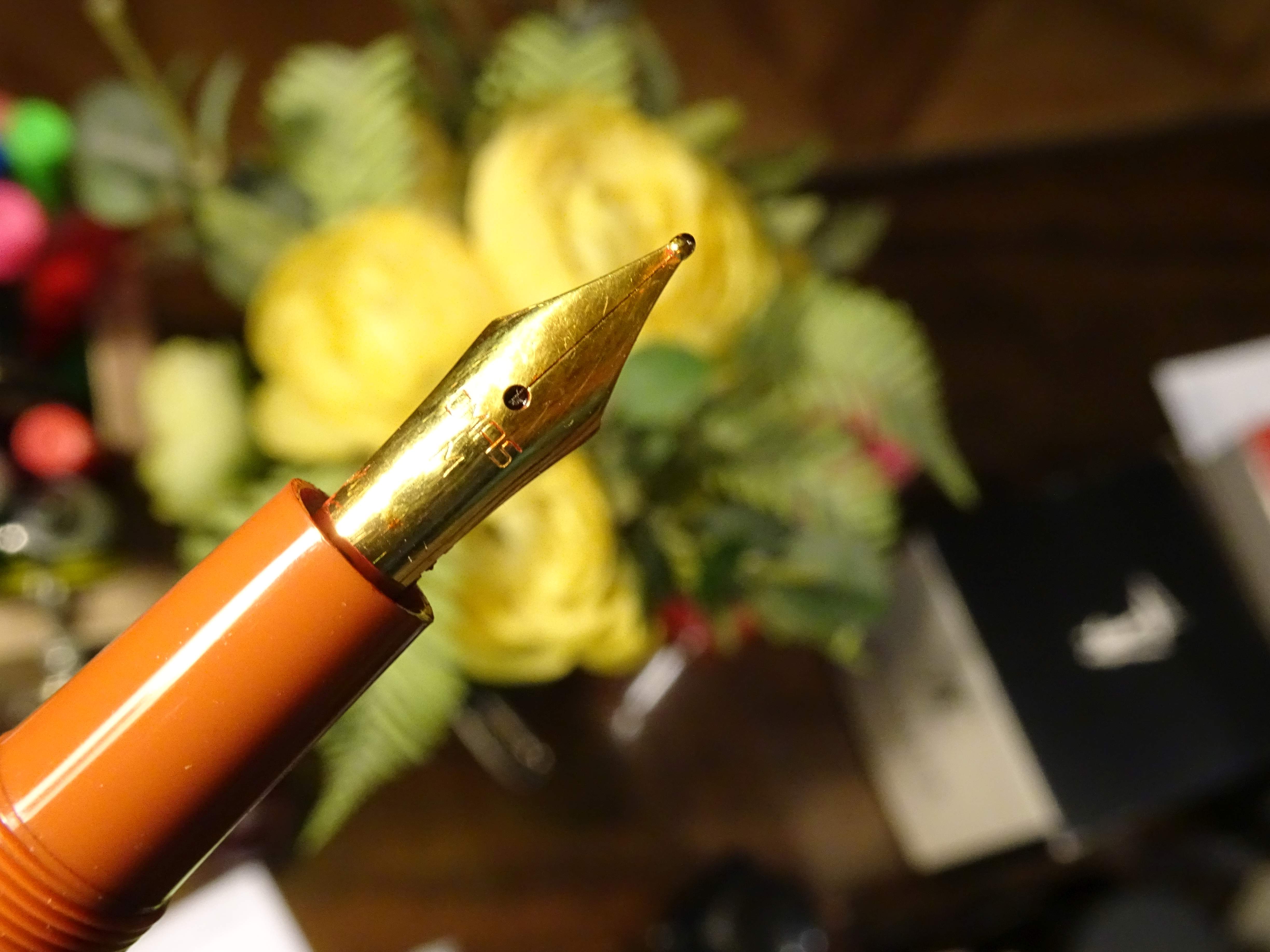 È andata a tenere compagnia a una 620 arancio, anni Ottanta che sembra la sua gemella povera; ha infatti un pennino in acciaio dorato, mentre la nostra monta un bel pennino in oro 18 carati.