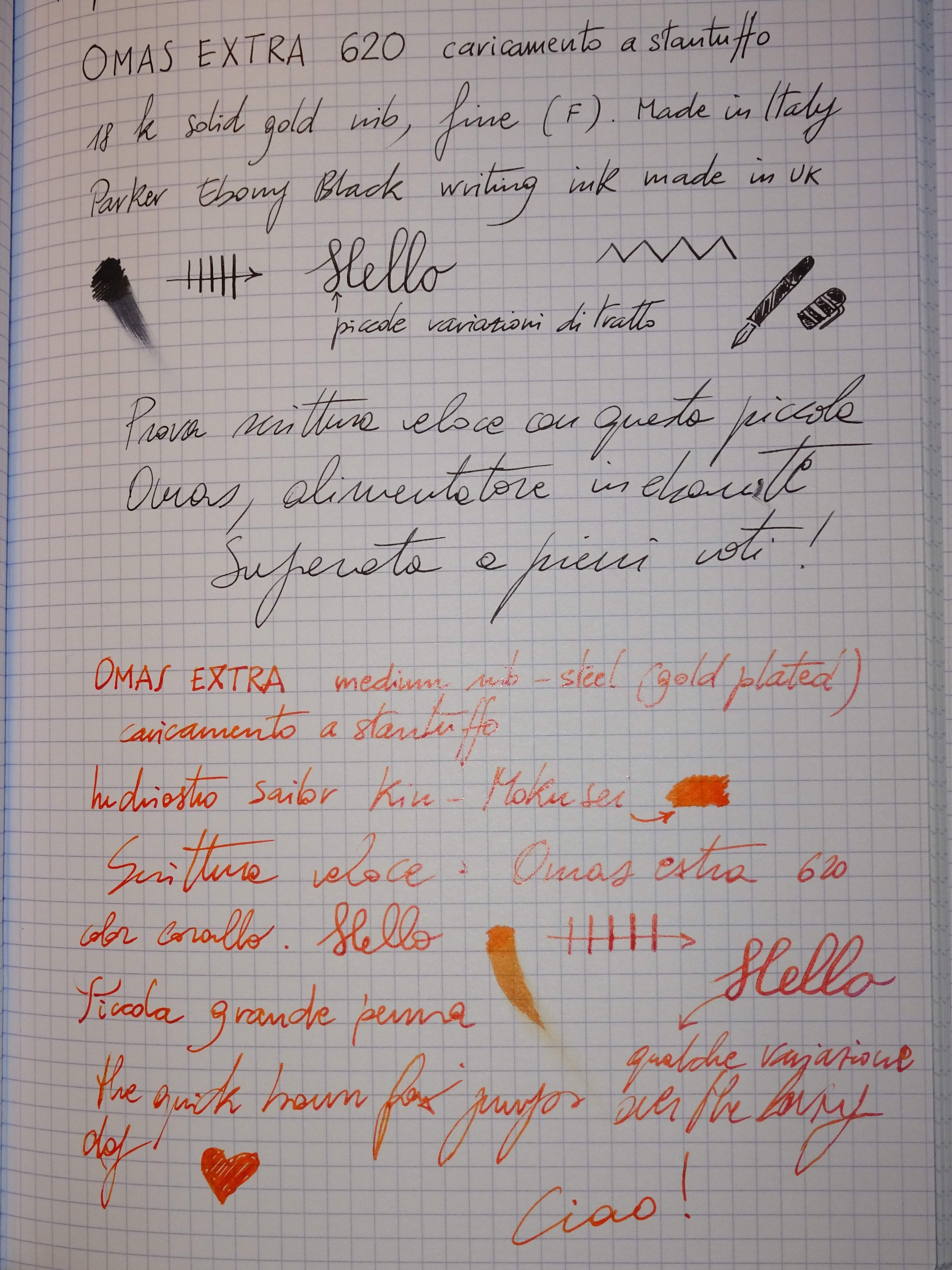 E ora dettagli e confronti: con una blasonata 557/F anni Ottanta e una Aurora 88 anni Quaranta. A seguire prove scrittura. La prova in nero Parker è della 555/S, la scrittura in arancio Sailor della 620.