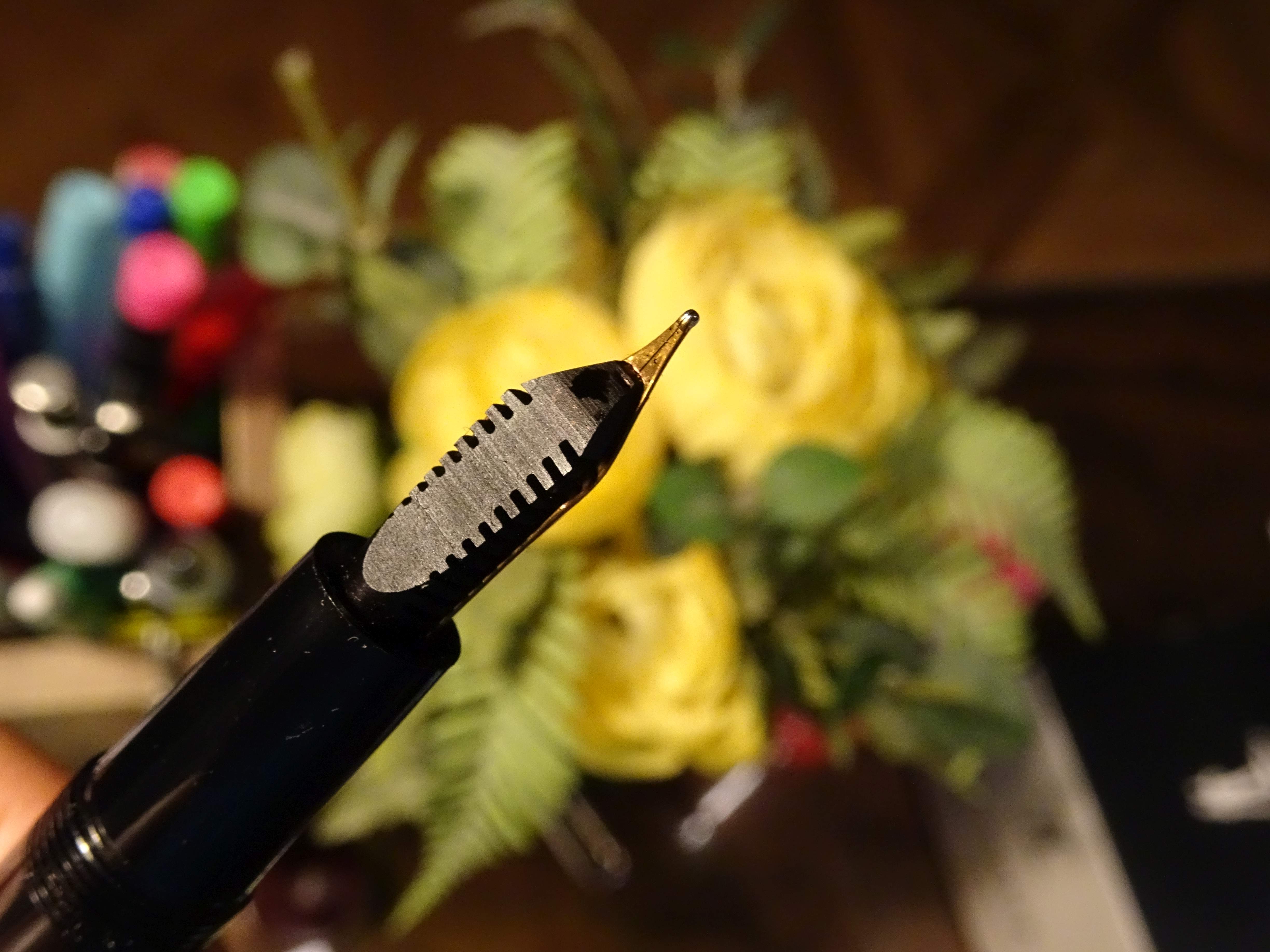 La 555/S anni 90 é dotata di ottimo pennino in oro, solitamente come quella del sottoscritto 14 ct. , nei casi più fortunati 18 ct. Anche la mia scrive molto bene, ma su questa stilo sono fioccate numerose e giustificatissime critiche dovute al materiale con cui é prodotta, la famigerata resina vegetale Omas le cui deformazioni nel tempo hanno dato tanti dispiaceri a molti appassionati, tra cui il sottoscritto.