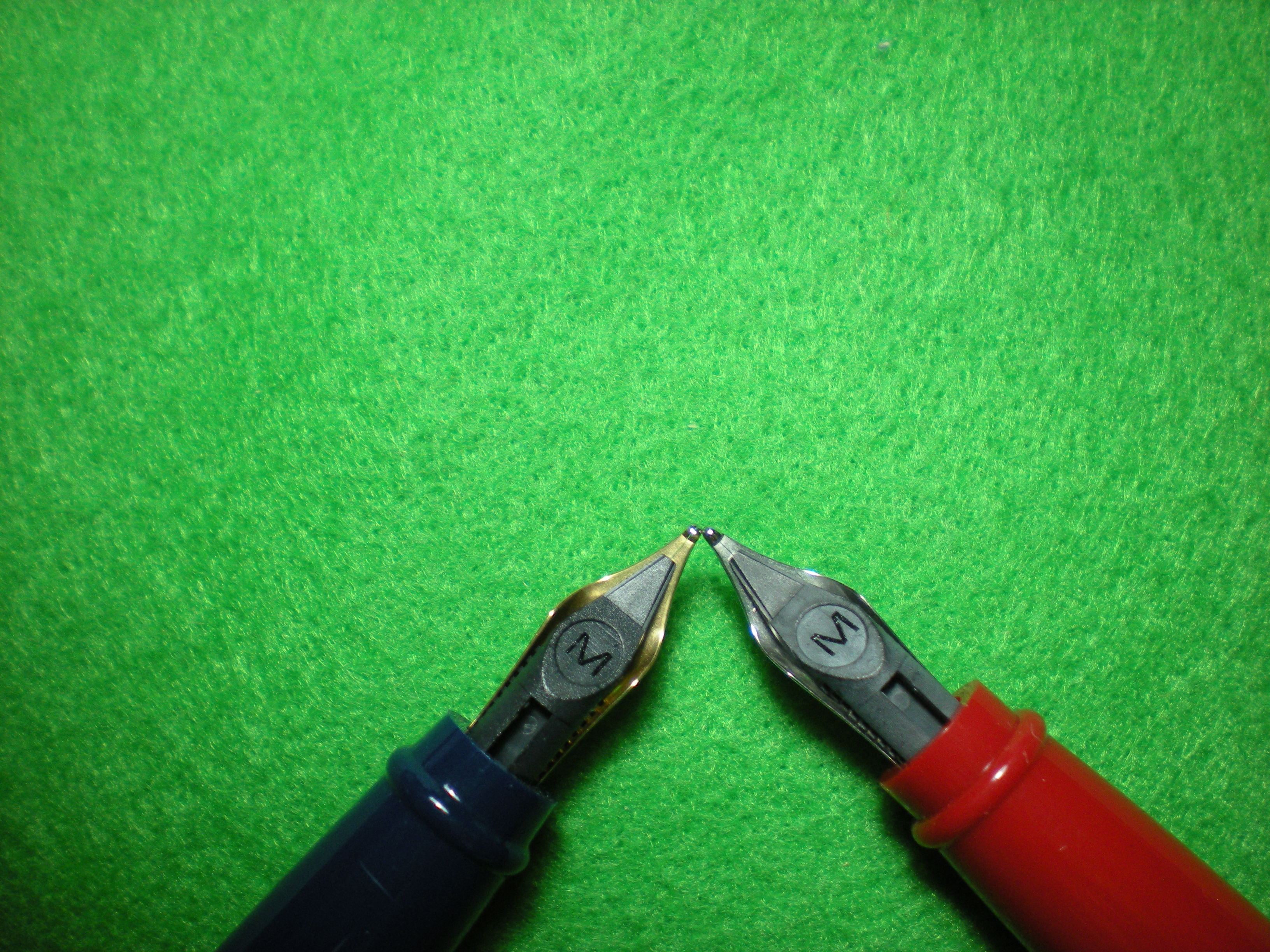 entrambi M però abbastanza diversi fra di loro,quello dorato della penna blù è più largo di quello rodiato della penna rossa. Vi assicuro che non è un effetto ottico. Questo capita anche con altre marche europee,ecco perchè preferisco provare la penna prima dell'acquisto.