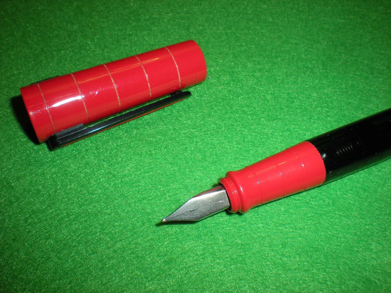 Io ho una vecchia (credo tempi WWII) Reform, con un interessante sistema di caricamento: c'è una lunga asticella metallica inserita al fondo del fusto. Di primo acchito parrebbe una carica a siringa rovesciata, ma non è così: carichi l'inchiostro estraendola tutta, poi la sganci (ruotandola in una specifica posizione) e la estrai. A questo punto la capacità del serbatoio, che occupa tutto il fusto (e la penna è tutt'altro che piccola) è enorme, più o meno come una eyedropper: ed ovviamente si può poi anche scaricare, reinserendo l'asticella e facendo la manovra inversa. Svantaggio: devi ricordarti dove poi riponi l'asticella, quando l'andrai a cercare dopo mesi...