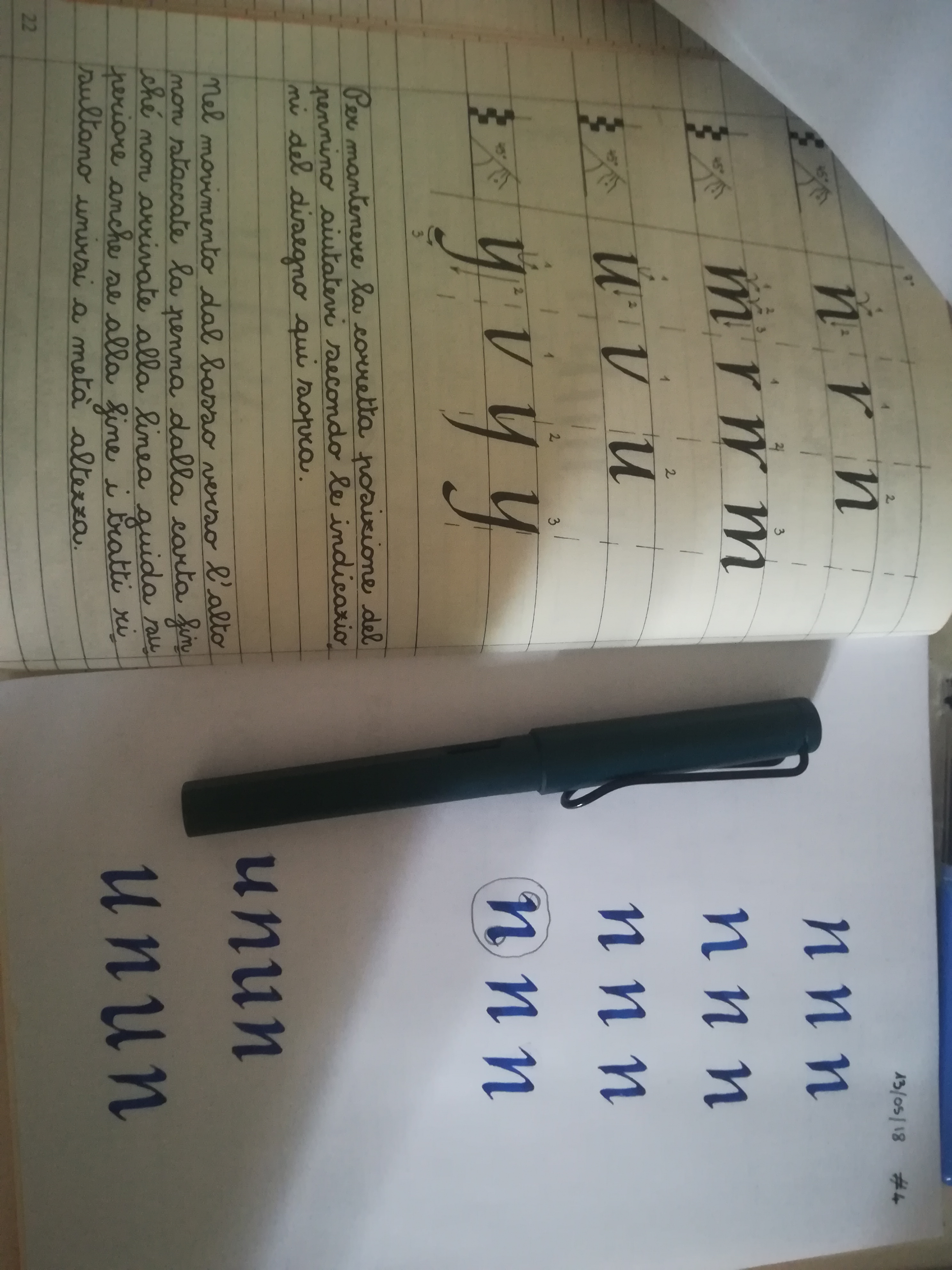 Due mesi sono passati da quando mi è stata donata la mia fedele Lamy Petrol con pennino italico da 1.9 mm eppure, a parte qualche piccolo scarabocchio, non ho mai dedicato del tempo alla calligrafia prima di ieri. Seguendo "Il Quaderno di Calligrafia Cancelleresca" di Agnieszka Kossowska ho iniziato a produrre i miei capolavori di arte astratta che vorrebbe essere delle lettere dell'alfabeto. Qui di seguito vi mostro il modello di riferimento e quanto ho combinato stamattina.La lettera "n" che ho cerchiato è quella che secondo il mio parere è meglio riuscita, malgrado gli eccessivi slanci delle grazie.