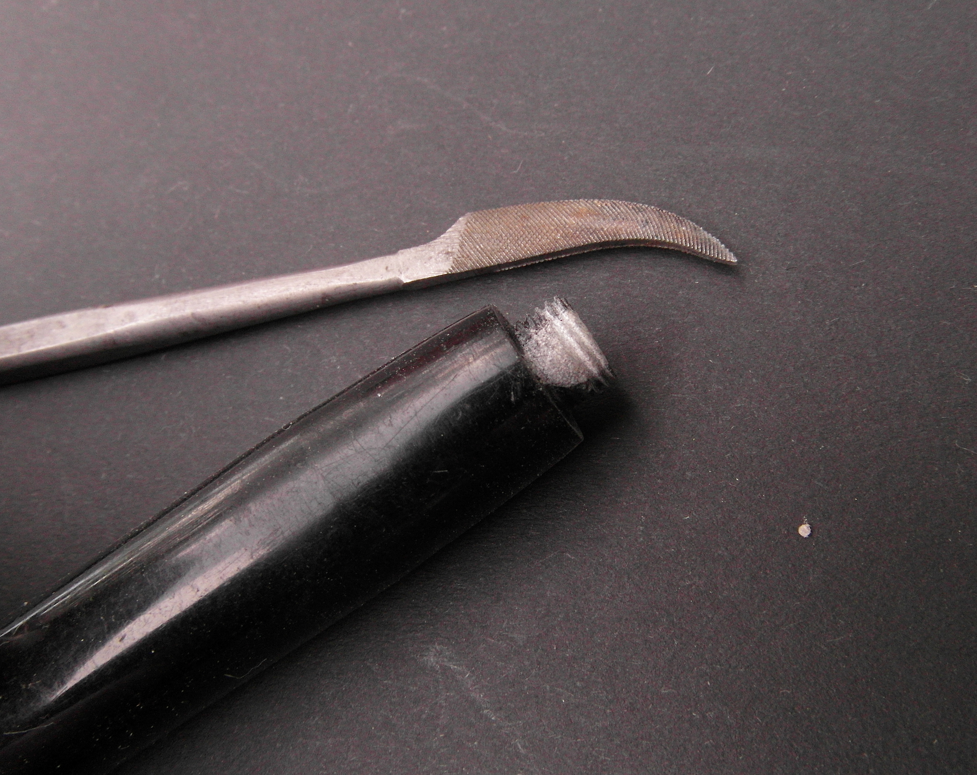 Per conservare il più possibile intatto il foro inserisco un cilindretto avvolto nel nastro di teflon sino a raggiungere il diametro corretto. Applicato il prodotto facendo molta attenzione a non andare fuori dalla zona del danno ne regolarizzo la forma con la lima e passo quindi alla fase più difficoltosa, ovvero quella di raccordare la filettatura sulla parte applicata. C'è da perderci gli occhi, ma poco alla volta riesco a ricreare i solchi mancanti con una lima di forma adeguata. Dopo qualche ritocco il fondello si avvita correttamente e non resta che applicare un pò di vernice per l'ebanite per rendere pressoché invisibile la riparazione.