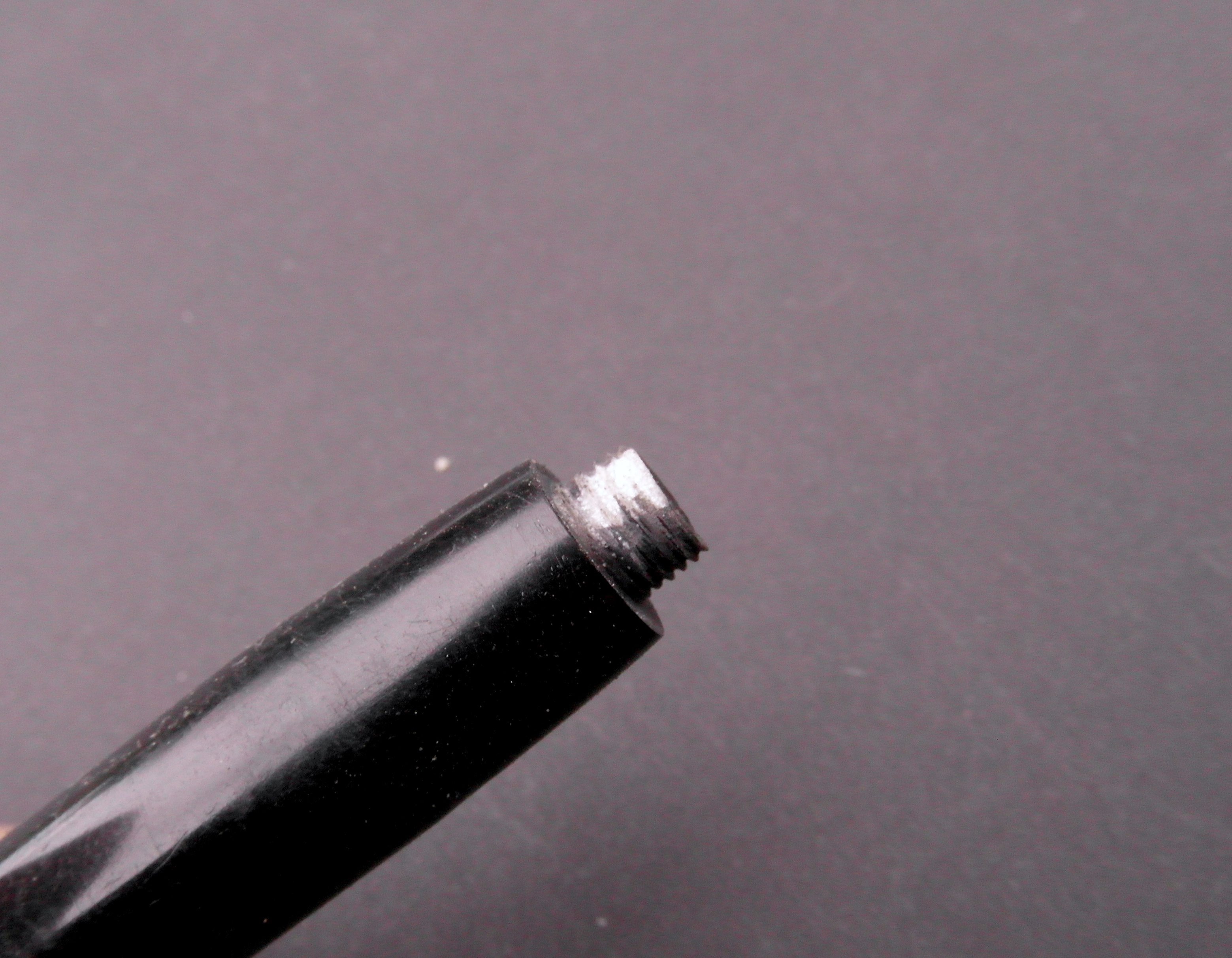 Oggi ero sufficientemente ispirato per cercare di risolvere l'ultimo problema di una vecchia Montblanc "Fabbricata in Italia": una rottura nella parte filettata che ospita il pulsante di fondo e sulla quale si avvita il fondello. Questa parte, come spesso accade non è ricavata insieme al corpo della penna, ma inserita nel suo fondo, spesso realizzata in un materiale diverso: in questo caso è in ebanite mentre il corpo è di celluloide.