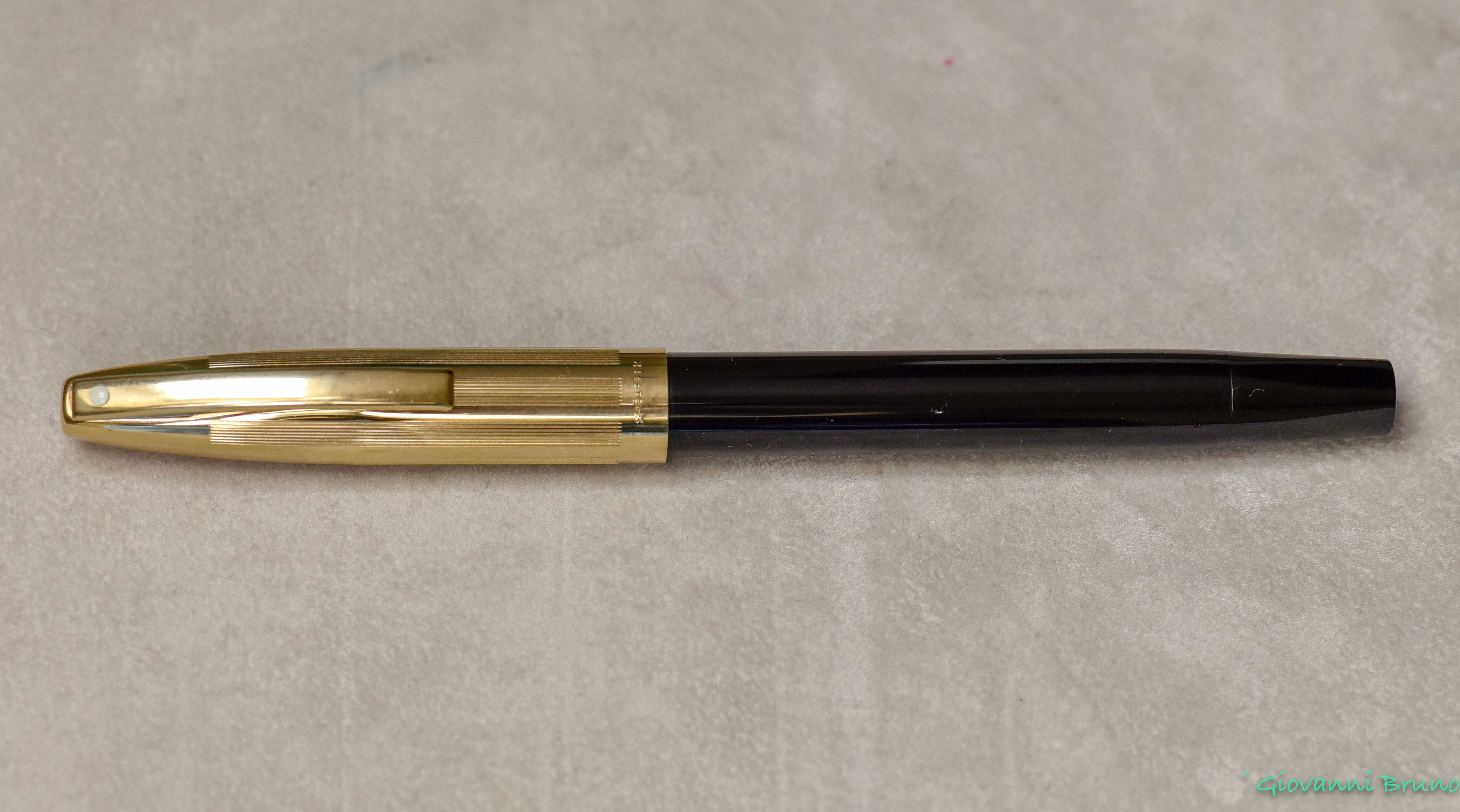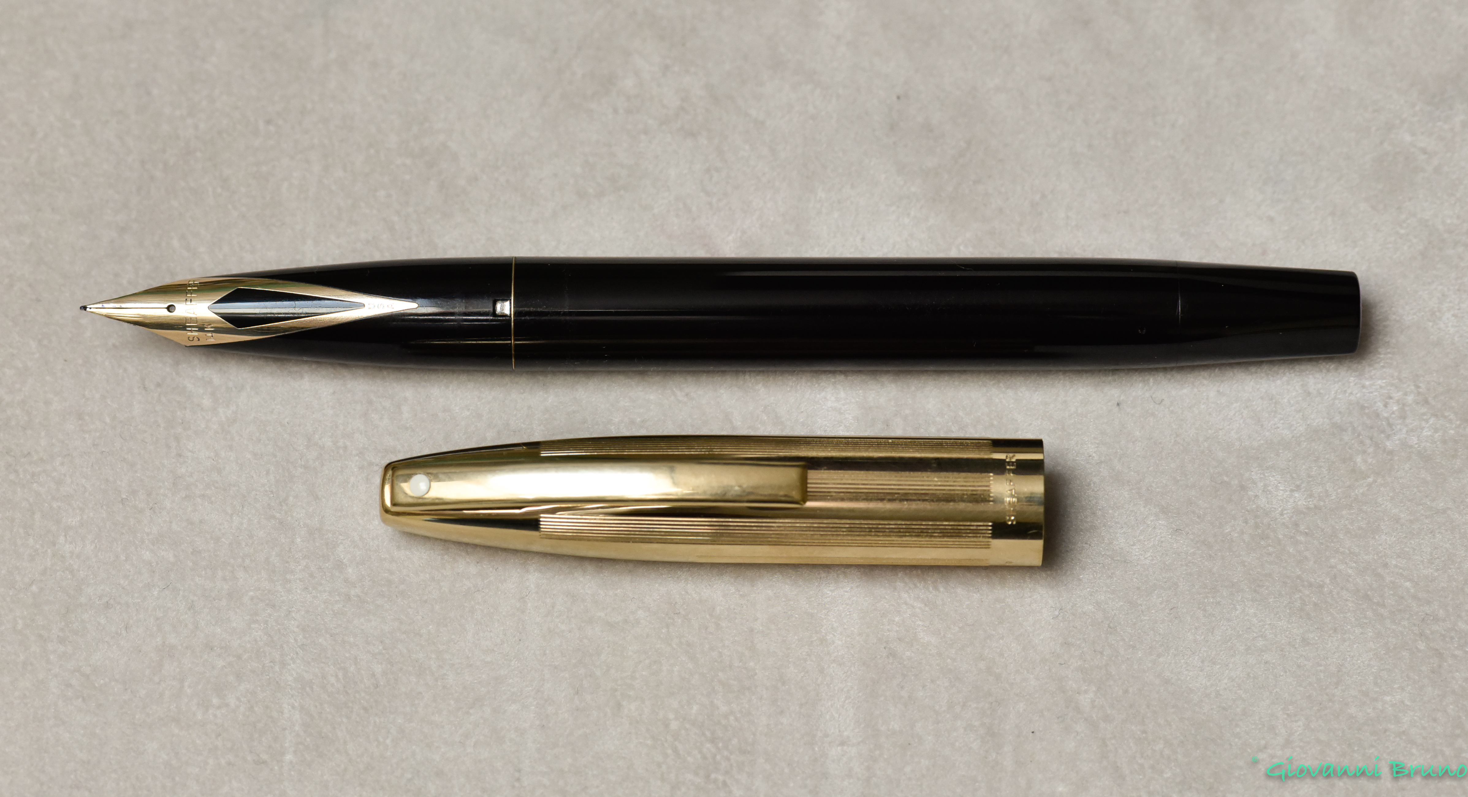 Si tratta di un modello Sheaffer Imperial VIII con cappuccio e clip placcati oro, corpo nero, pennino a coda di rondine in oro 14, il tutto, strettamente Made in USA, con caricamento touchdown perfettamente funzionante.