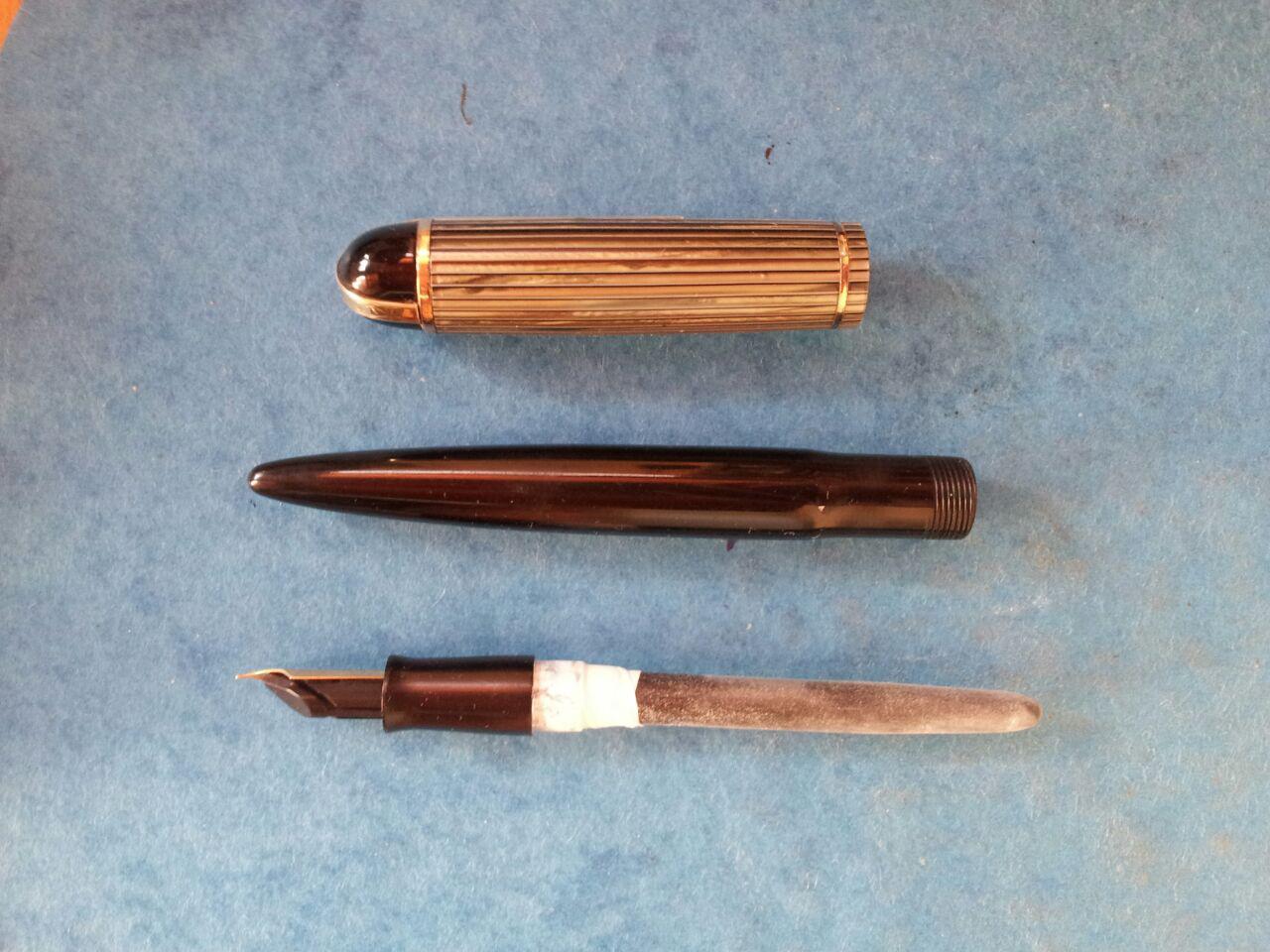 b) è la prima volta che vedo una penna con caricamento a sacchetto, quindi vorrei capire se è montato correttamente. Ho visto sul (fantastico) Wiki la procedura per montare il sacchetto e il risultato finale mi pare diverso (utilizzo di colla anzichè questa specie di nastro che vedo sulla mia).