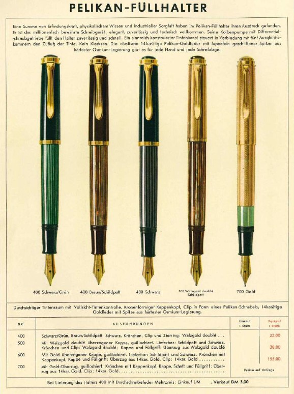 Lo stesso fu per il fermaglio a forma di becco di pellicano, progettato durante la guerra. Inoltre furono disegnate alcune varianti con fusti in colore marrone-tartaruga o a righe verde/nero. I modelli della serie 500 avevano un cappuccio in oro doublé e impugnatura abbinata.”