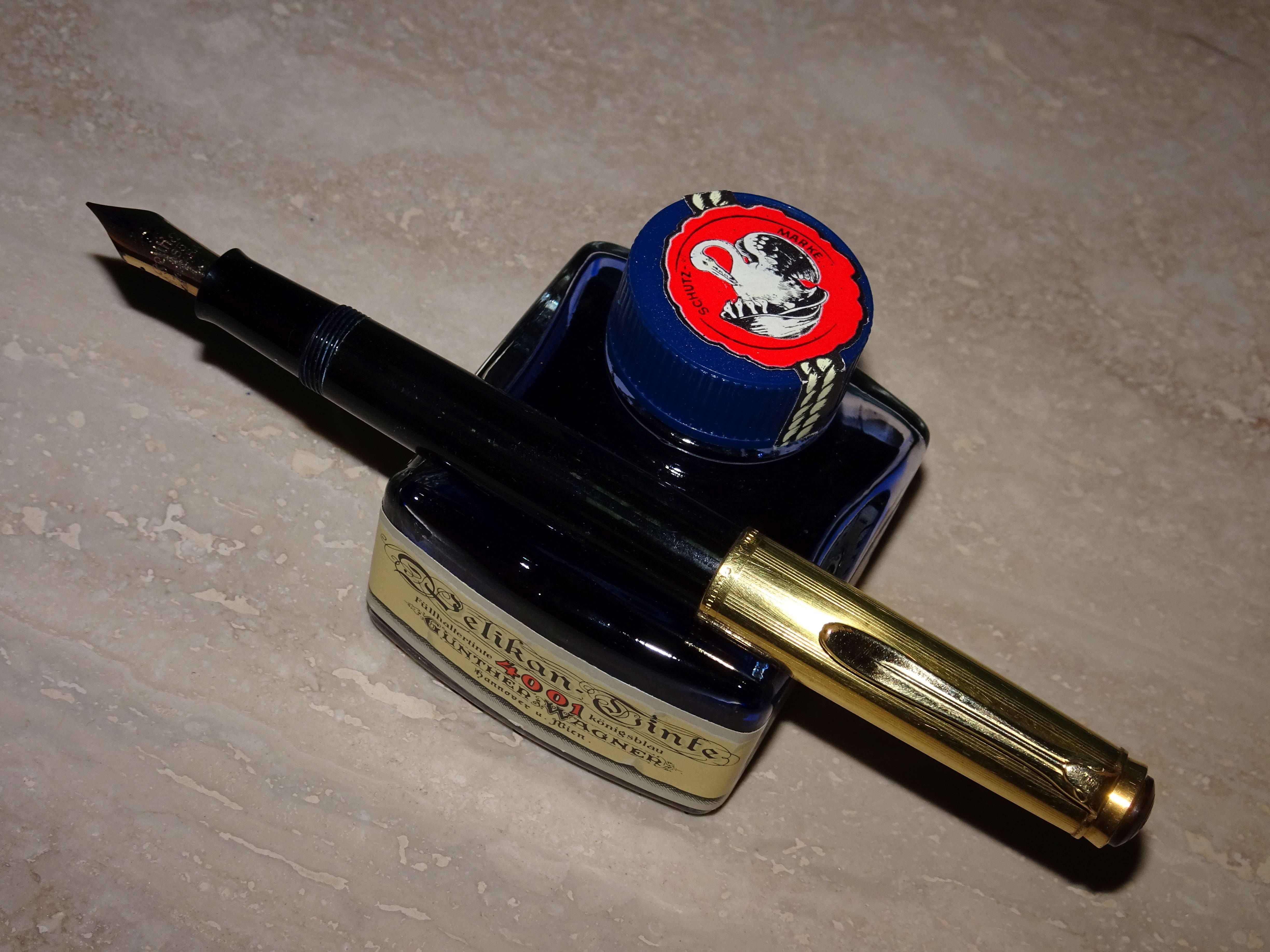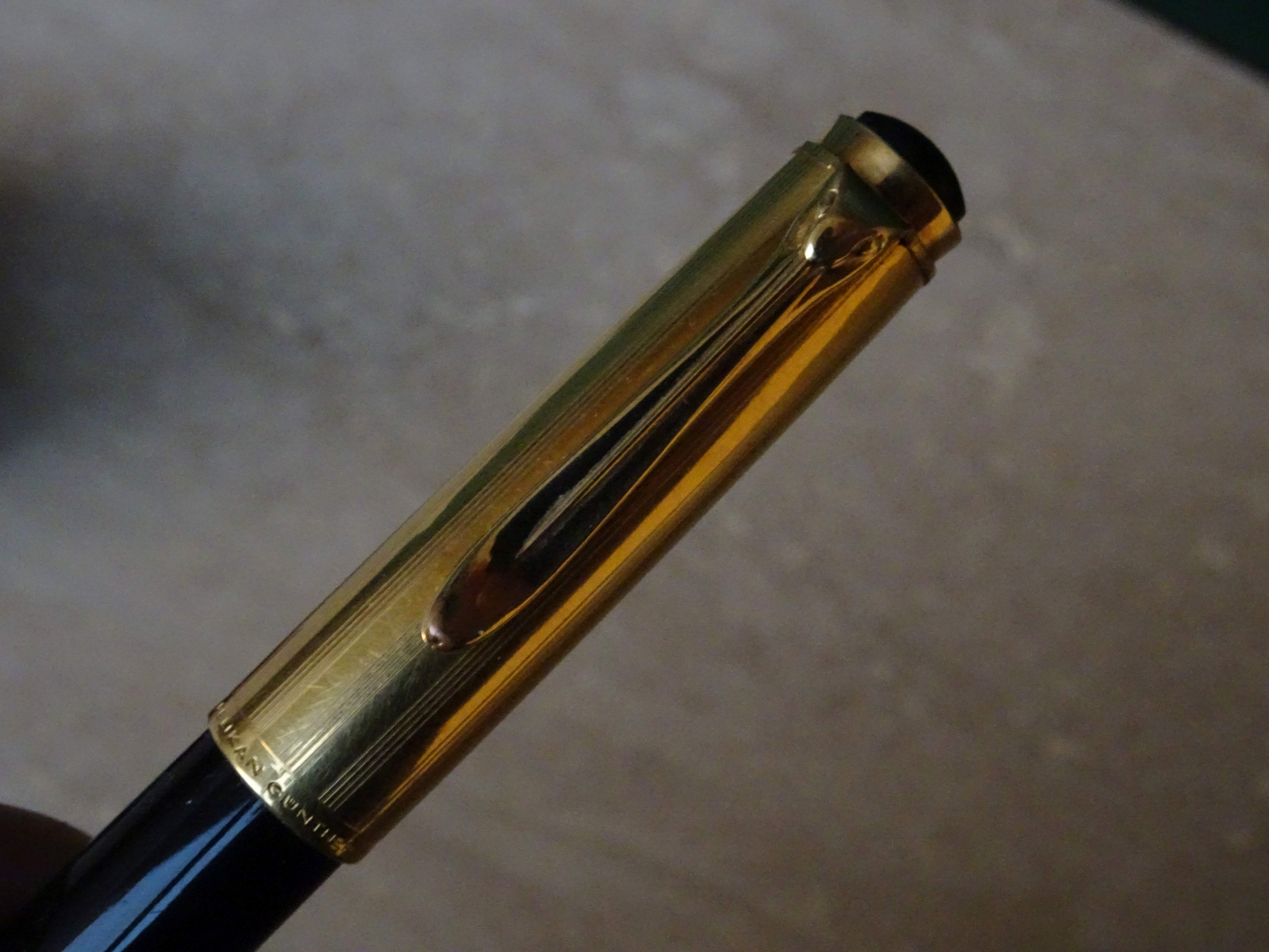 Il pennino è in oro 585/1000 a 14 carati, ancora privo del logo Pelikan, nella misura media, come riportato sul fusto (in realtà si comporta come un medio fine).