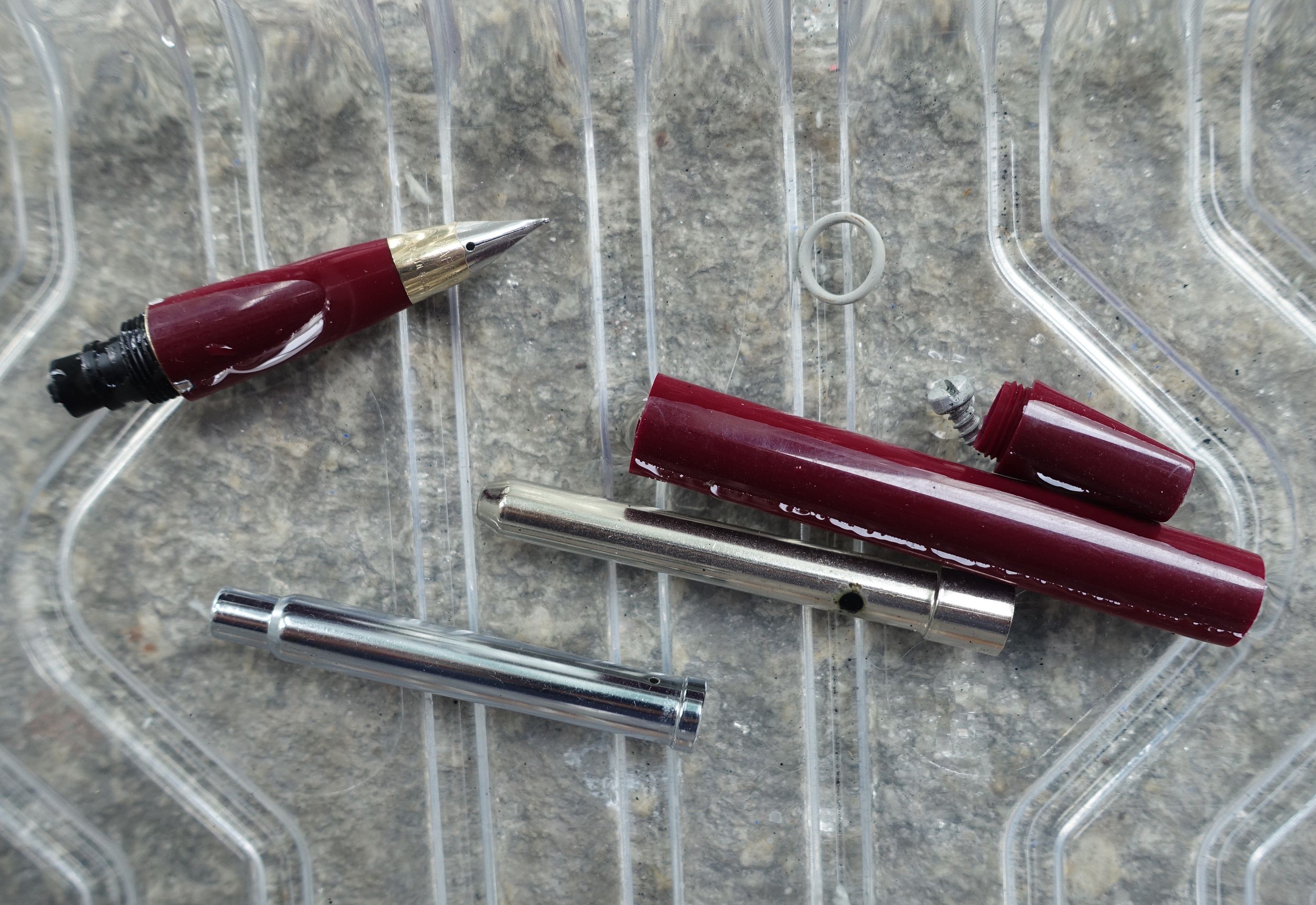 Non è una riparazione banale perché di solito la crepa si forma in corrispondenza della sede della guarnizione (piuttosto simile ad un o-ring) che deve garantire la tenuta quando il pistone viene abbassato in modo rapido e deciso determinando all'interno del corpo una pressione che va a comprimere il serbatoio di gomma che tornando alle normali dimensioni assorbirà l'inchiostro. L'anello di gomma è quindi costretto tra il corpo della penna (che tra l'altro è in quel punto indebolito dalla cava dove ha sede la guarnizione) e lo stantuffo cromato.