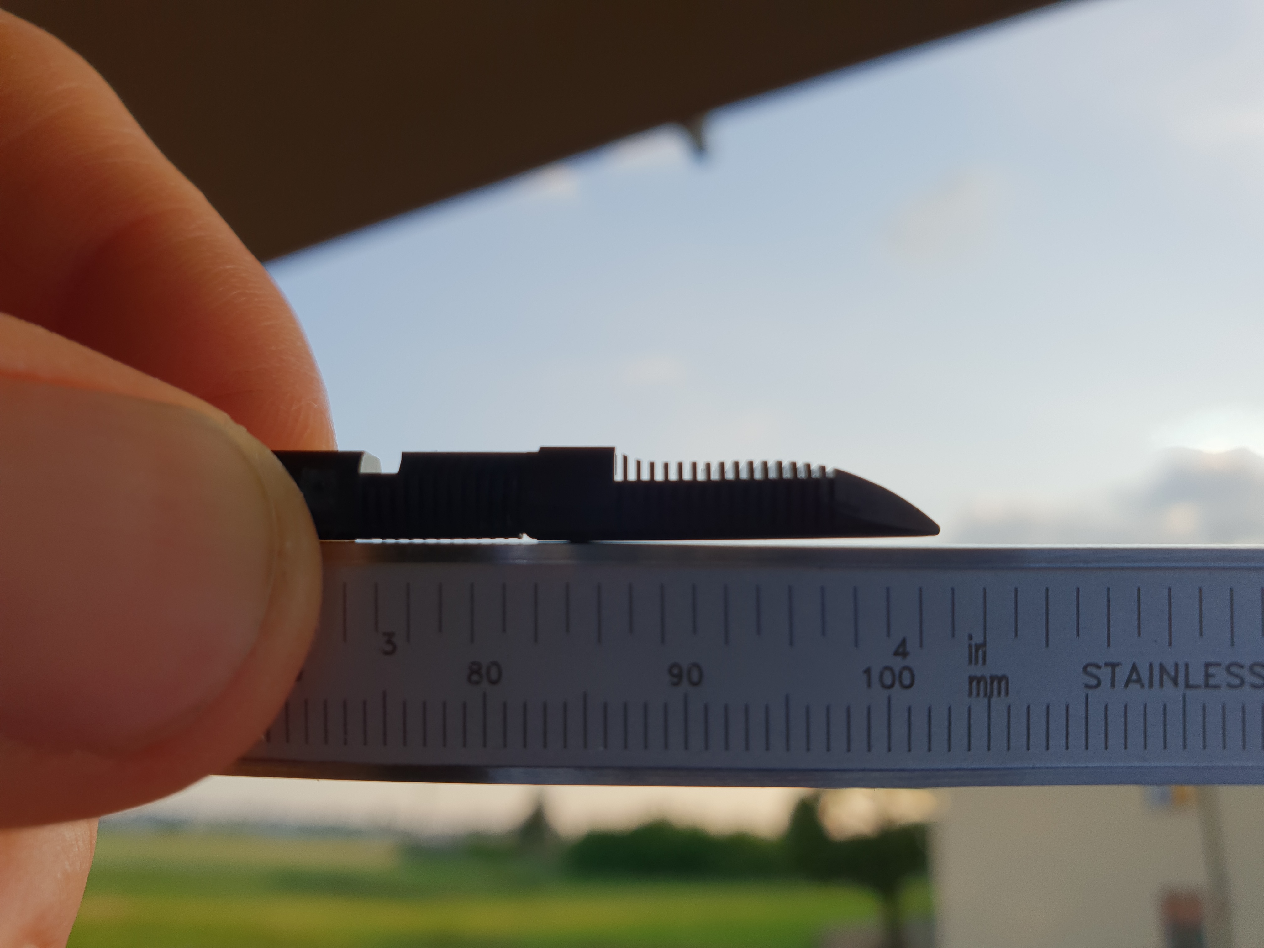 Ti frega il righello e il fatto che l'alimentatore sembra avere due diametri. E quello dietro appoggia sul righello alzando la parte anteriore che cosi' sembra storta.