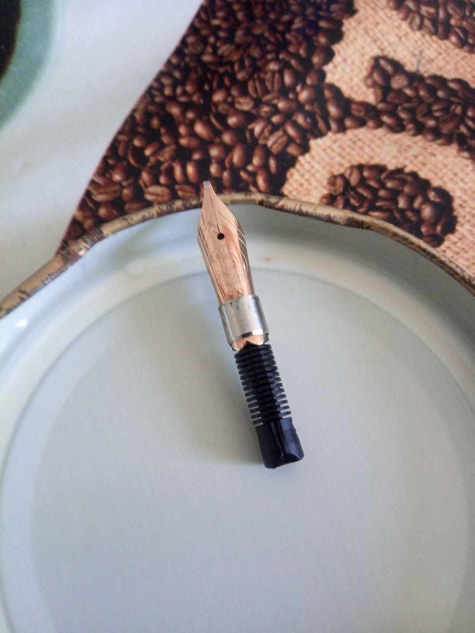 Aggiungo due foto del pennino estratto, magari puo' essere d'aiuto. Ho il vago sospetto che almeno meta' del problema sta nel collarino ma e' solo un sospetto.