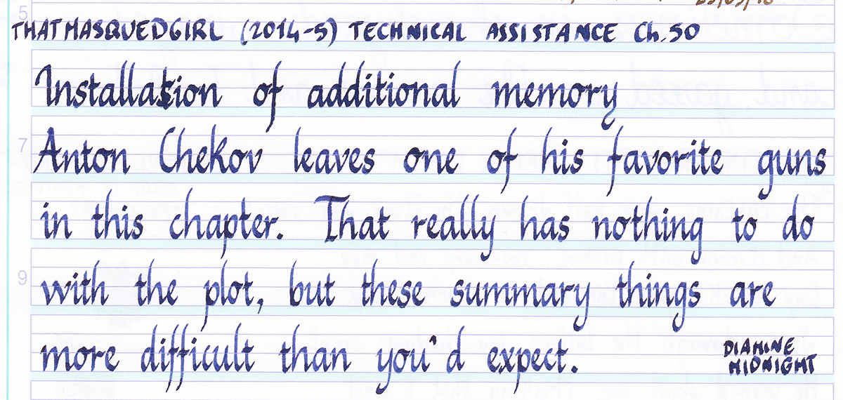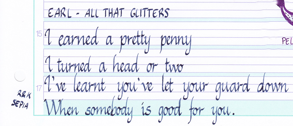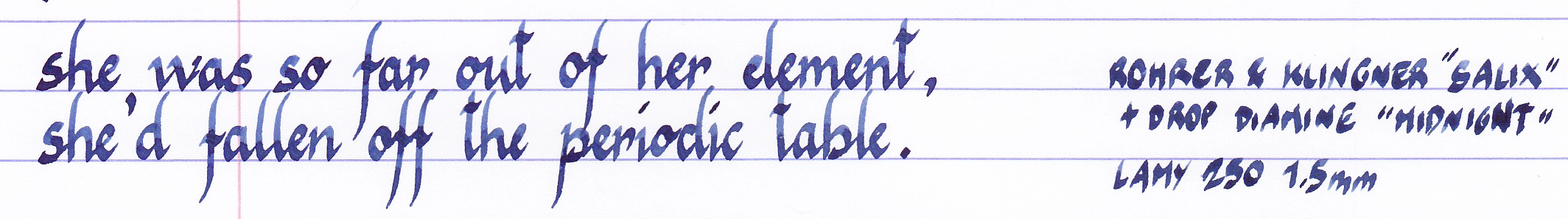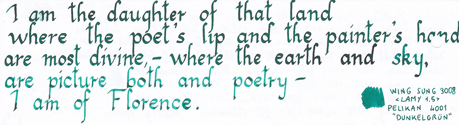 Se ricapiti in questo argomento, troverai ancora le indicazioni dell'inchiostro o della miscela di inchiostri usata. Per me, quella degli inchiostri è una passione inaspettata ma benvenuta. Dopo aver usato le cartucce Pelikan 4001 per anni, aver scoperto tutte queste aziende che fanno ancora inchiostri per stilografica mi ha davvero spiazzato. A volte mi sento più entusiasta per i colori che per le penne. Ce ne sono di così belli, che mi mettono proprio di buon umore. : )