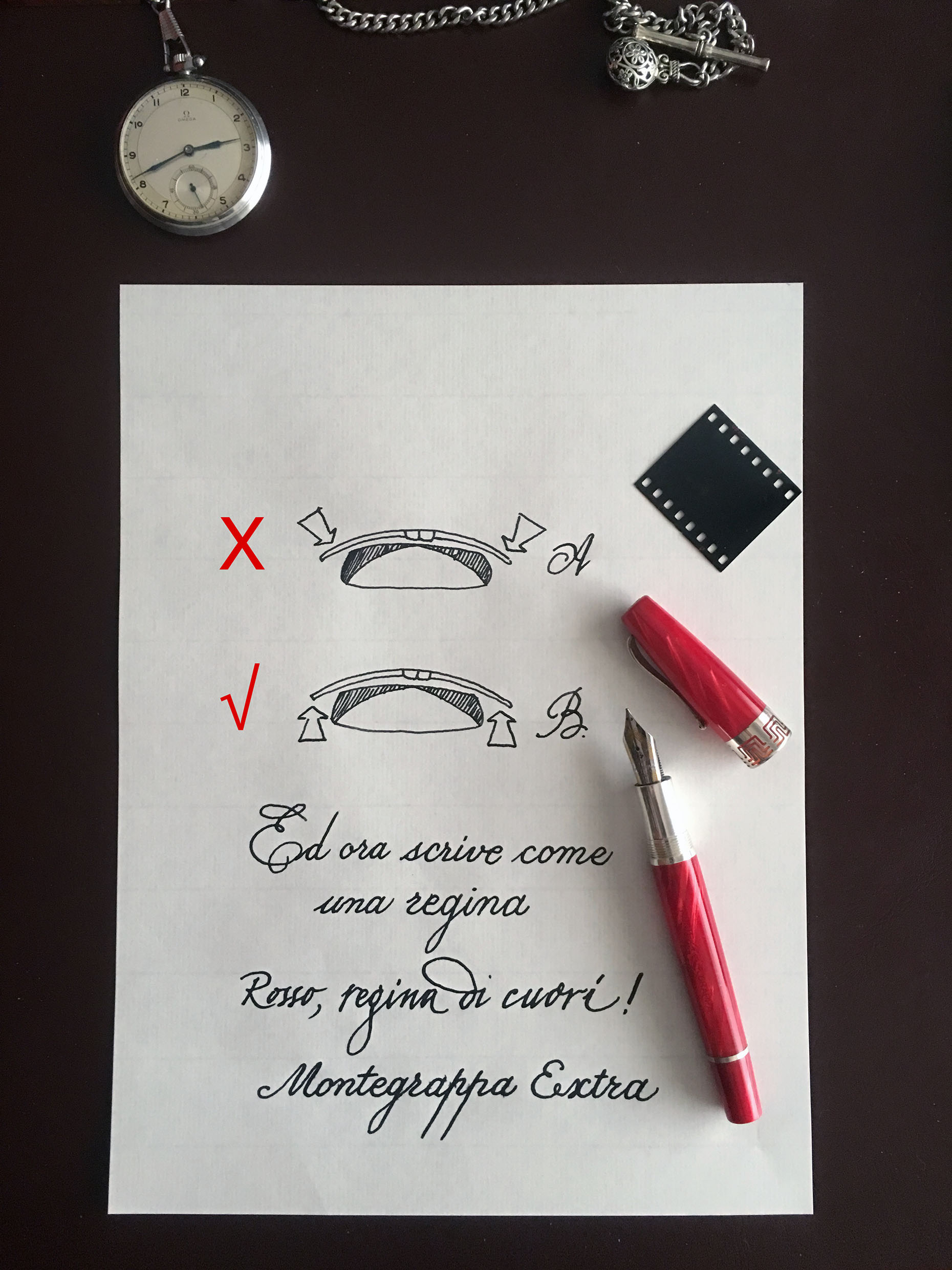 Finalmente ho avuto una domenica con il tempo libero sufficiente per "operare" il pennino della mia Montegrappa Extra rossa, affetta da un "tic" all'appoggiare il pennino sulla carta.