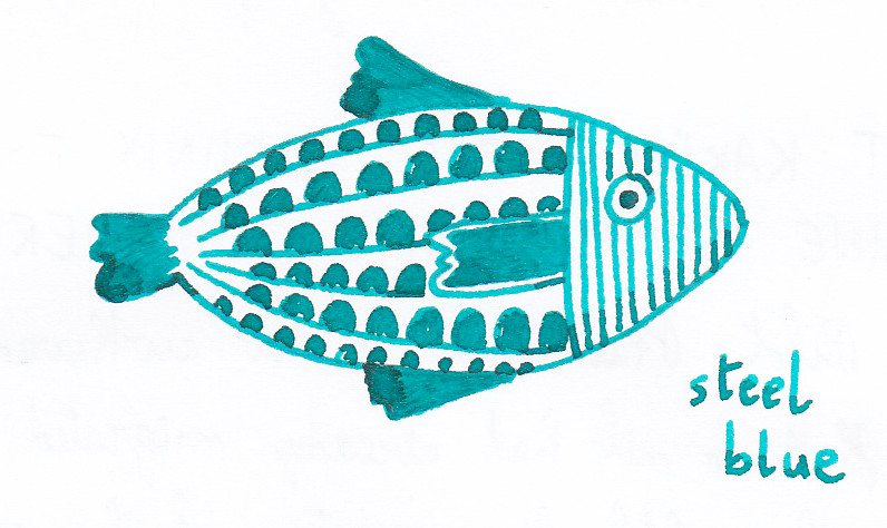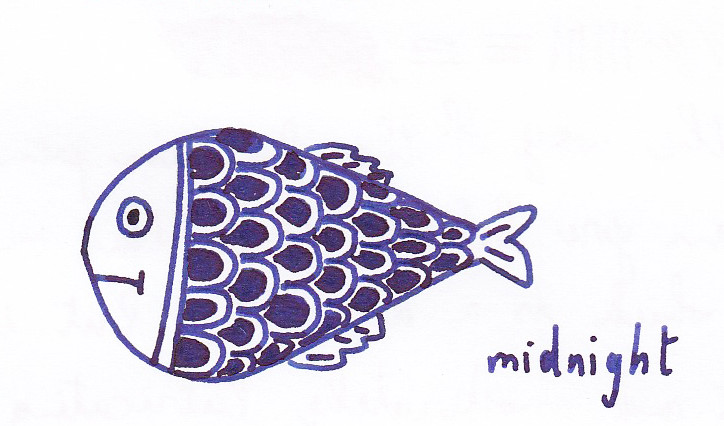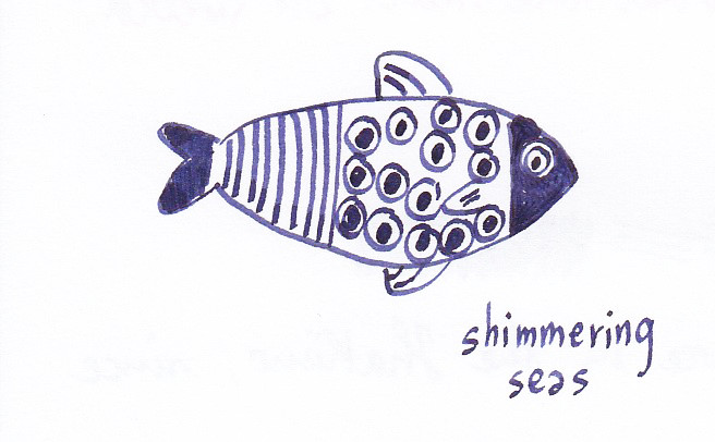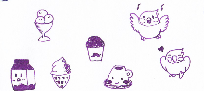 Di solito provo gli inchiostri con questi disegnini o con citazioni. Le pubblico sia sull'argomento "E ora mostratevi come scrivete!" sia sull'argomento che ho iniziato intitolato "Lo sviluppo per mio italico." Ho 26 bottigliette di inchiostro al momento, e mi piace cambiare colori spesso e usare 4-5 tipi di carte diverse.