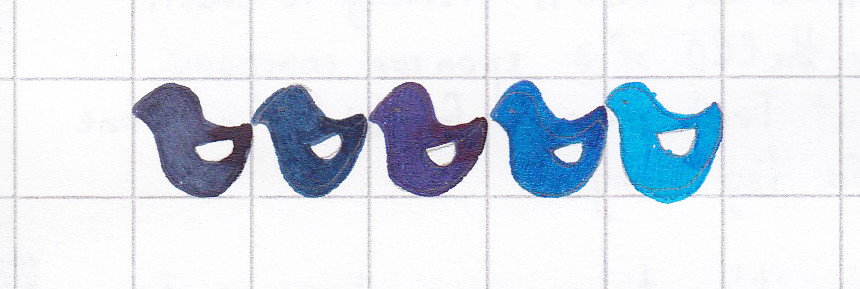 Pelikan 4001 Blue-Black, Diamine Blue-Black, Midnight, Asa Blue, e Havasu Turquoise. Da sinistra a destra: