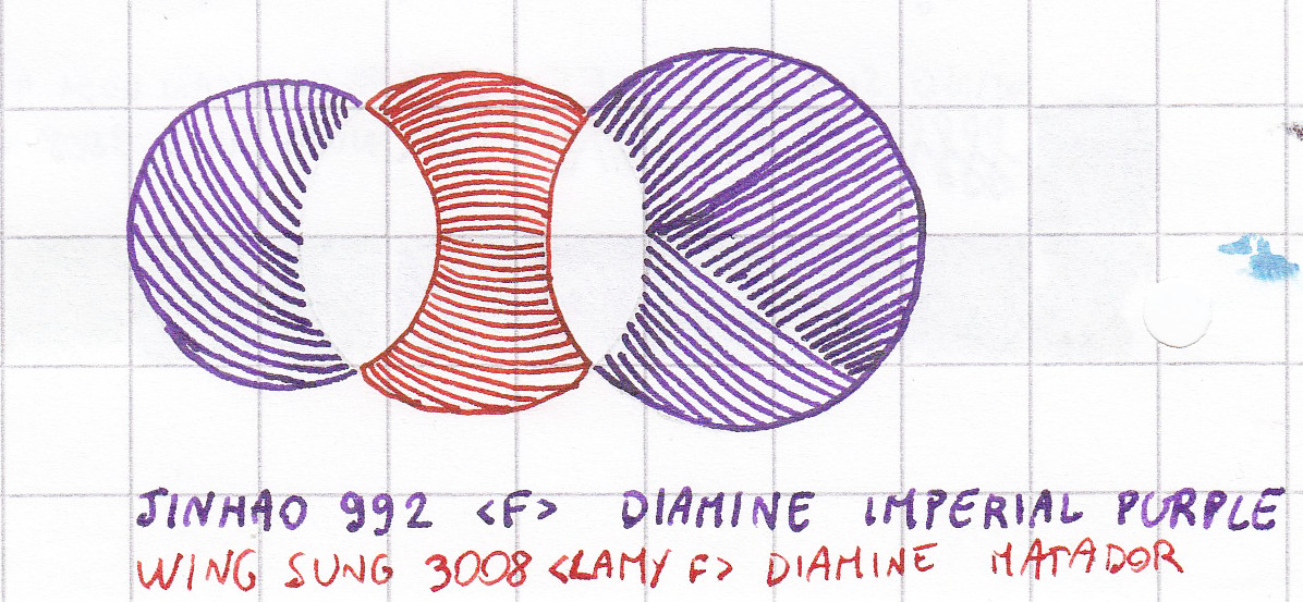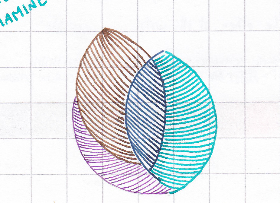 Rohrer & Klingner Salix (ferrogallico). Rohrer & Klingner Verdigris. (in un pennino+alimentatore dal flusso secco e striminzito). J. Herbin 1670 Anniversaire Rouge Hematite. Diamine Macassar. Pelikan 4001 Royal Blue. Pelikan 4001 Violet. Rohrer & Klingner Sepia.