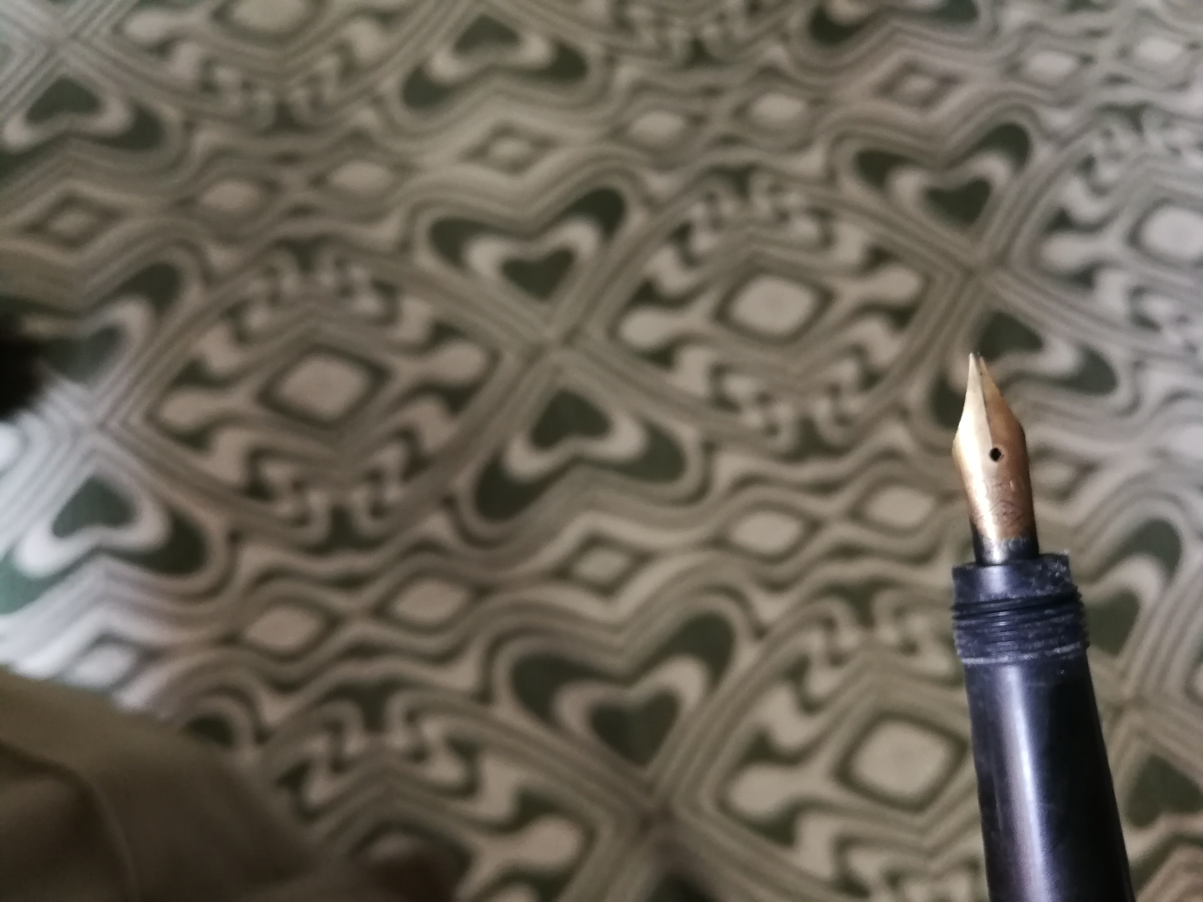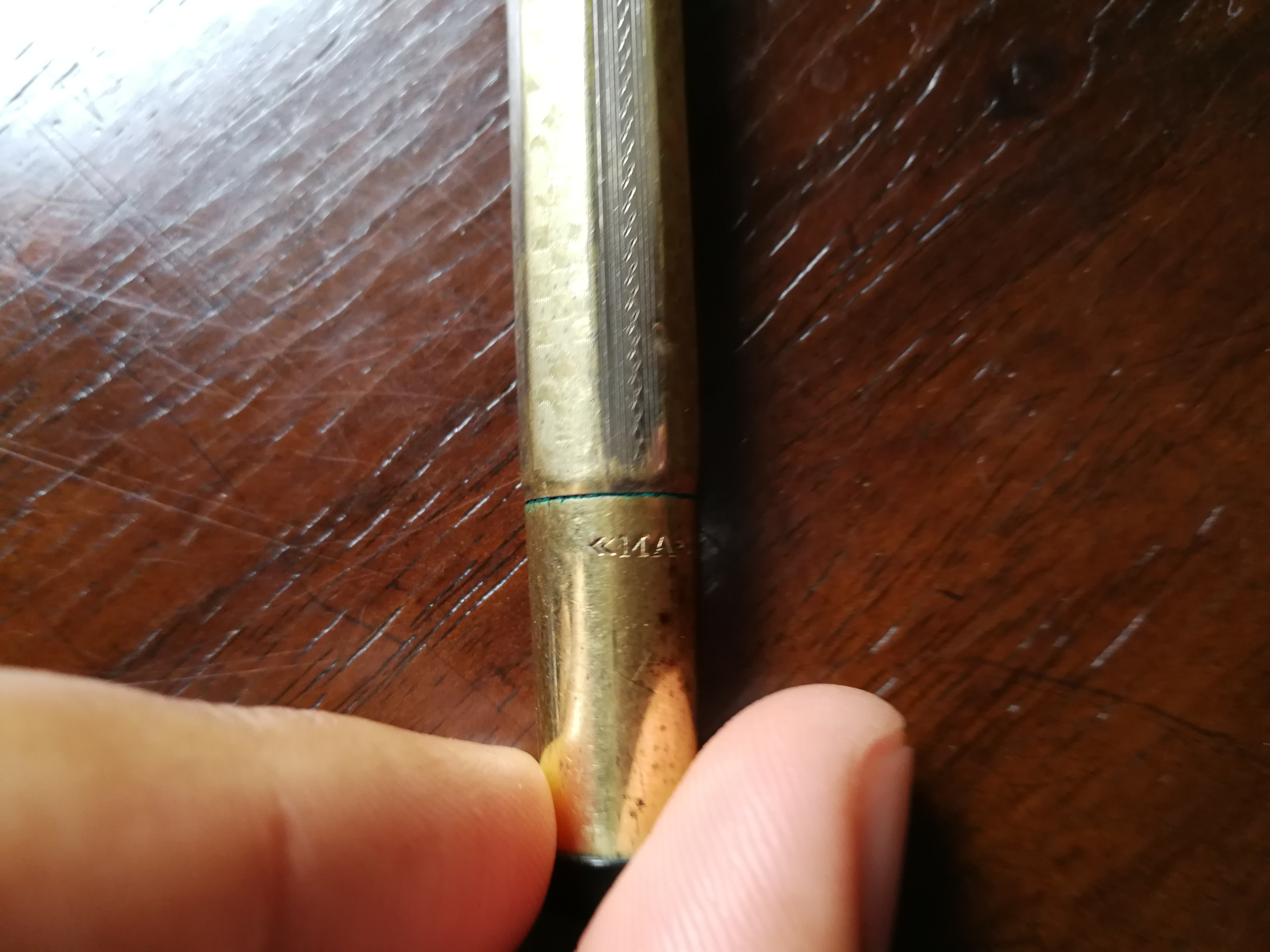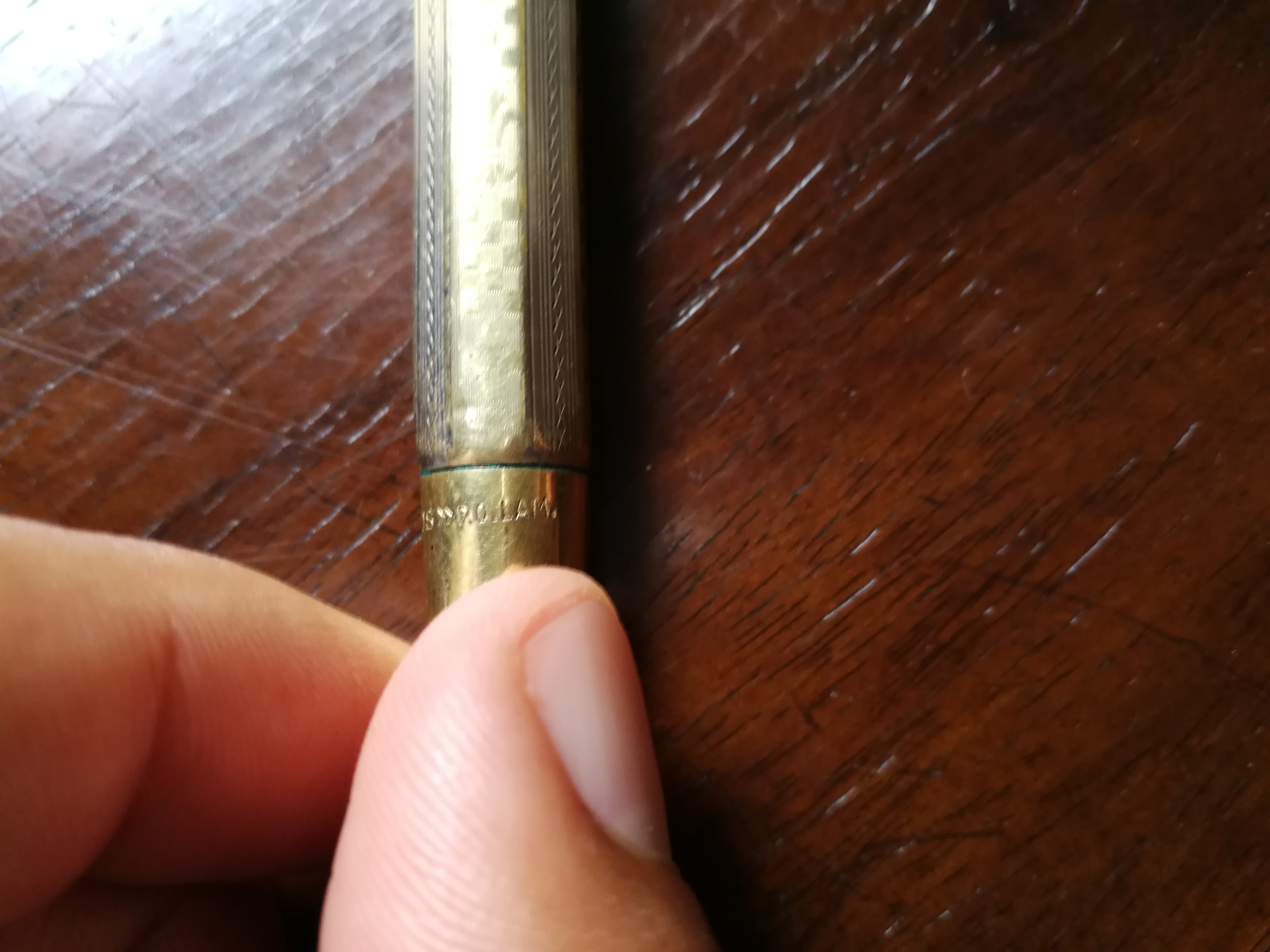 Purtroppo ho solo uno smartphone per fare foto della penna in questione. Credo sia un laminato, sul pennino riesco a leggere solo ORO sotto 585 in un rombo disposto con asse lungo in orizzontale sotto ancora la scritta Extra (letta con occhiali e lente d'ingrandimento).