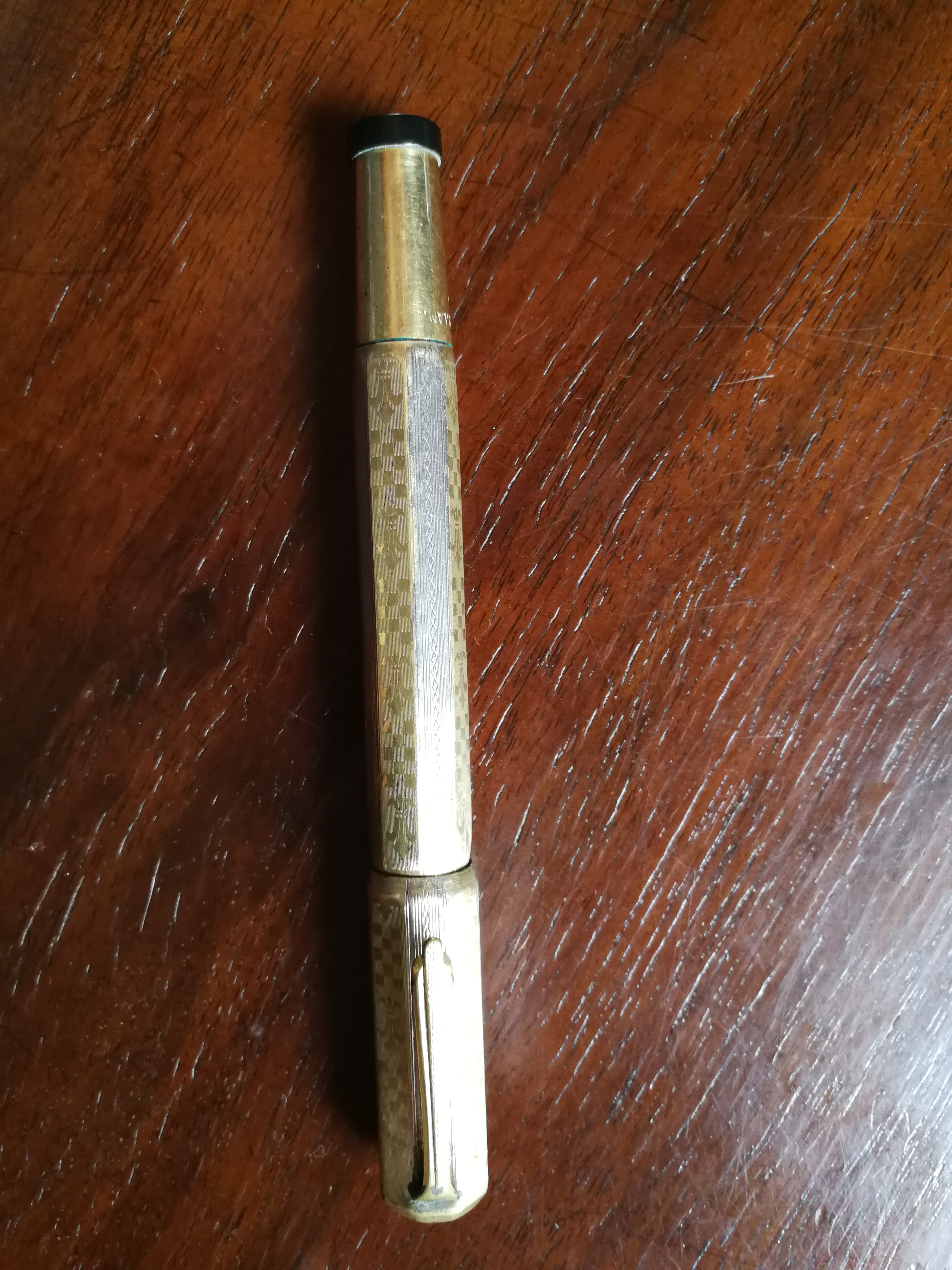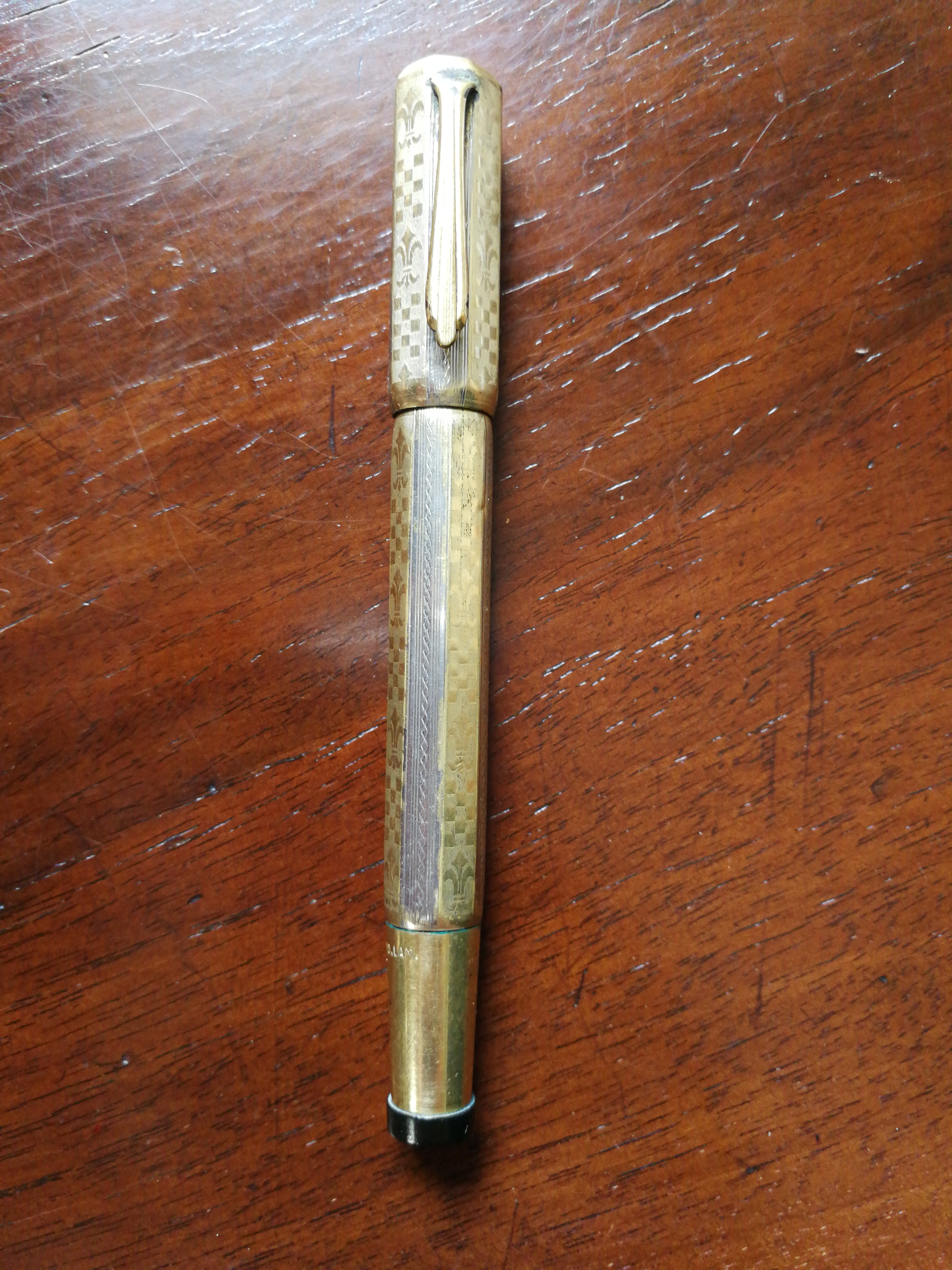Trattasi di una penna "safety" con "overlay" (copertura) in ottone rivestito da lamina in oro; il periodo di produzione spazia dai primi del 900 (anno di fondazione dell'azienda) fino, presumibilmente, ai primi anni 30 (anche se la produzione di penne "safety" si estende, saltuariamente, fino agli anni 40).